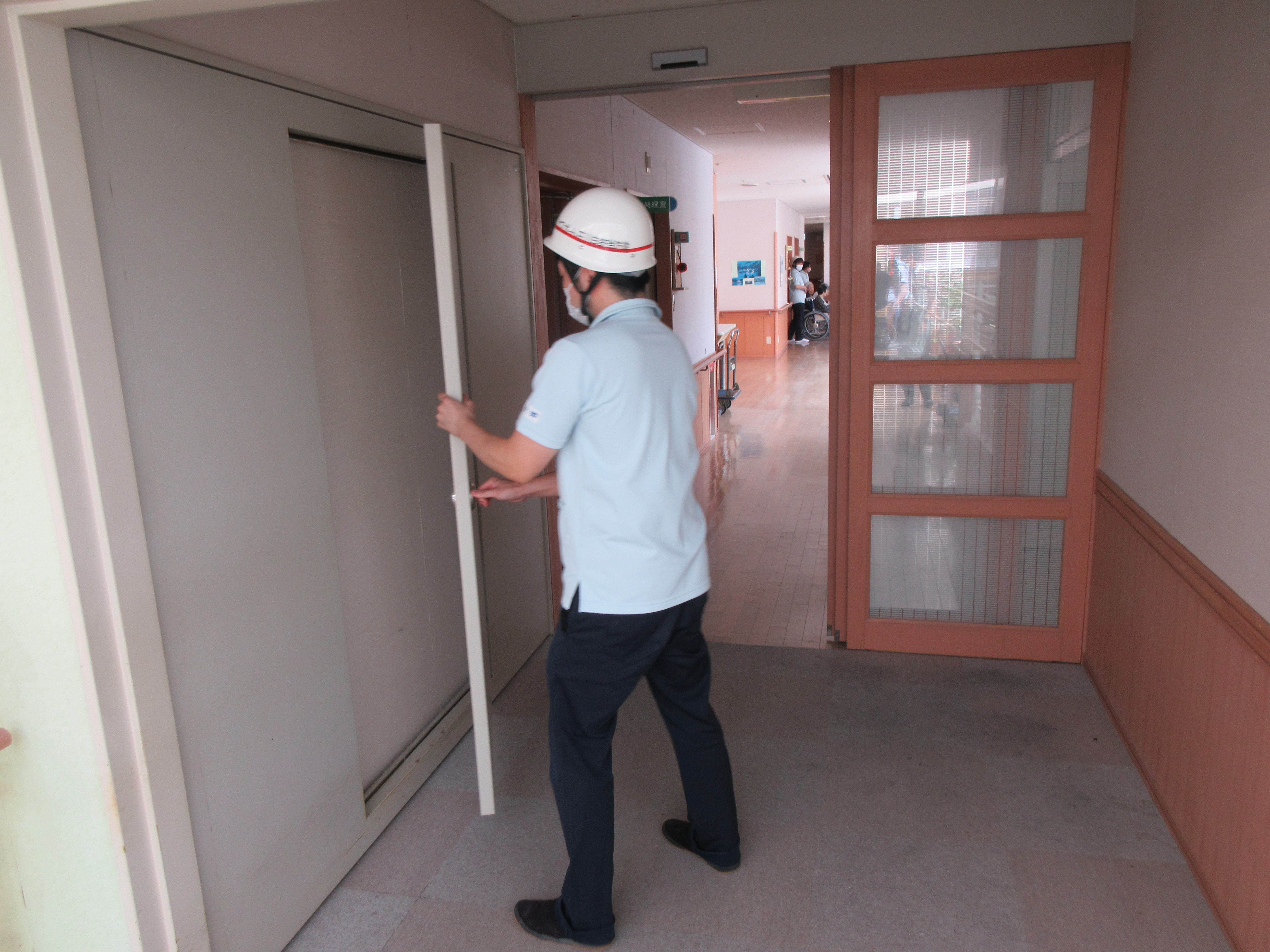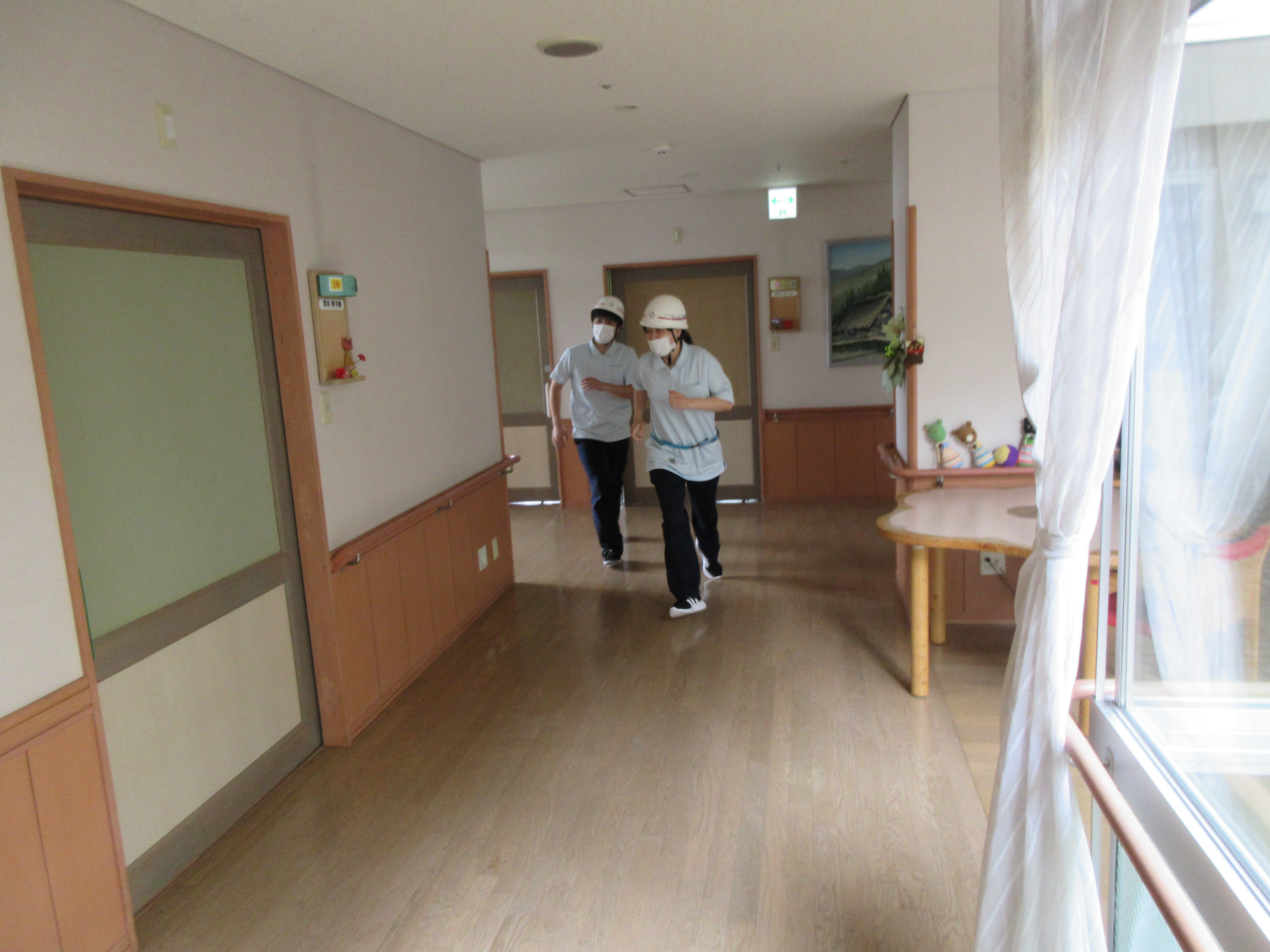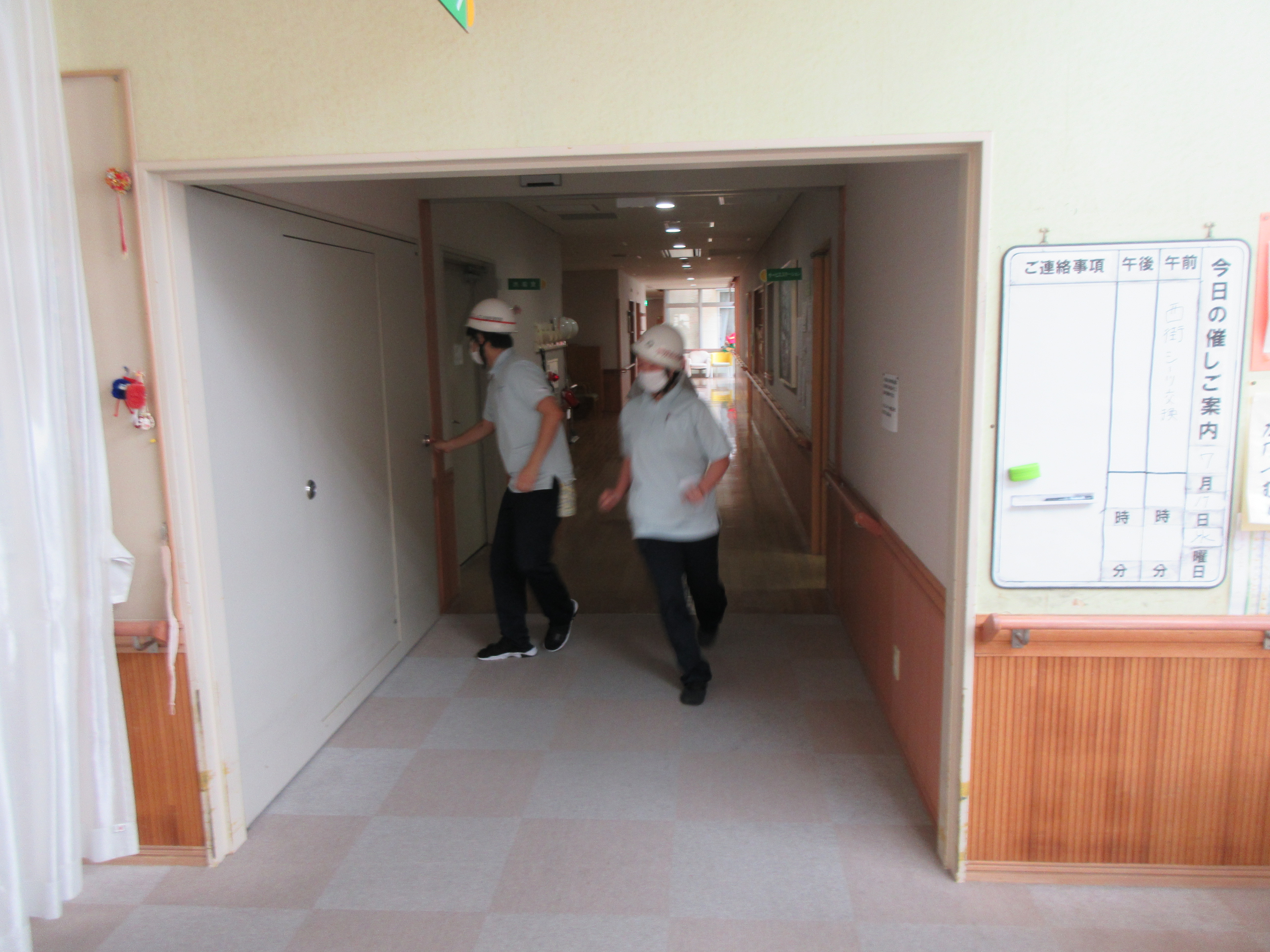 職員が利用者さんを各避難場所に誘導。各部屋の見回り、防火扉を閉め、人数確認。