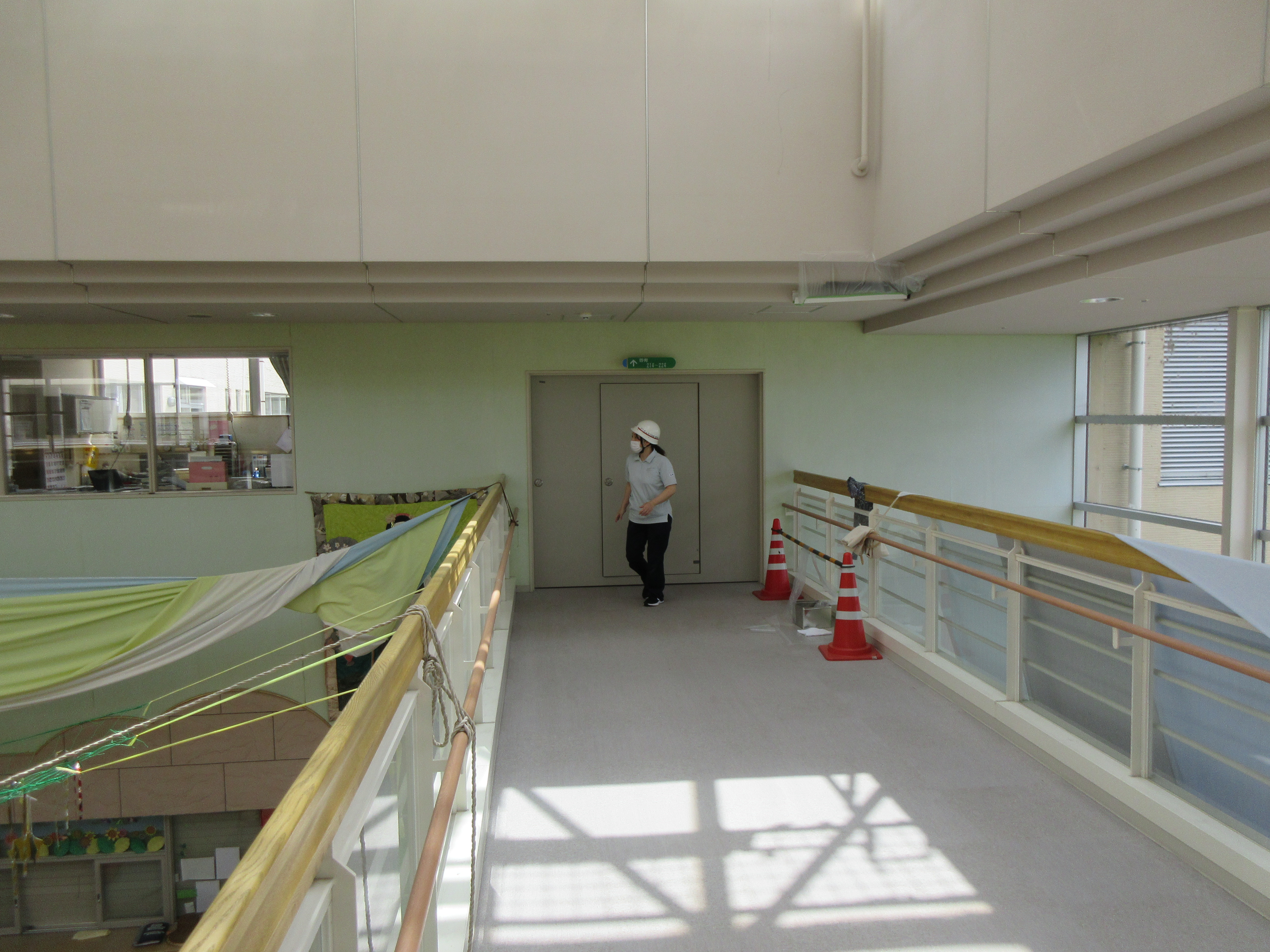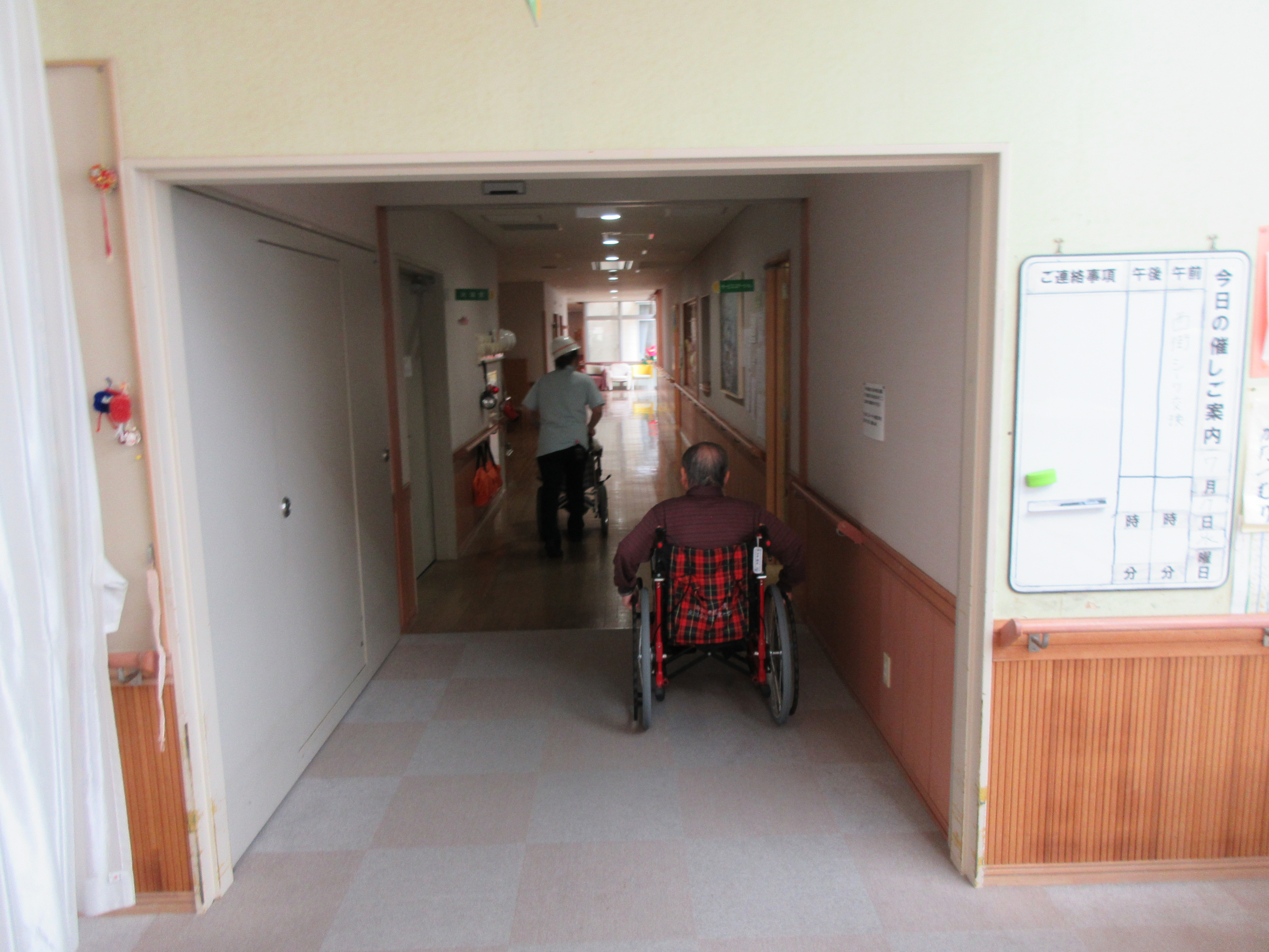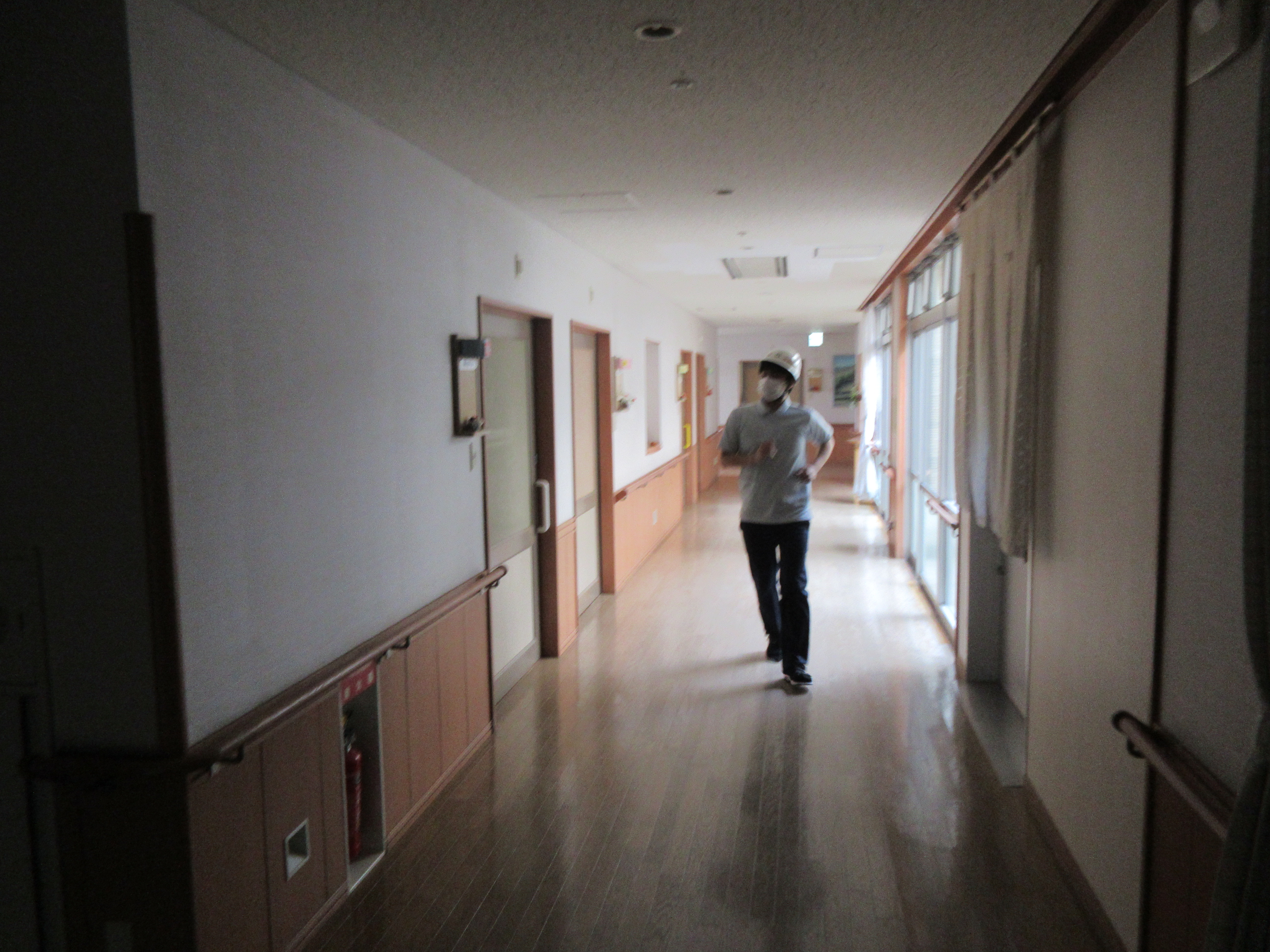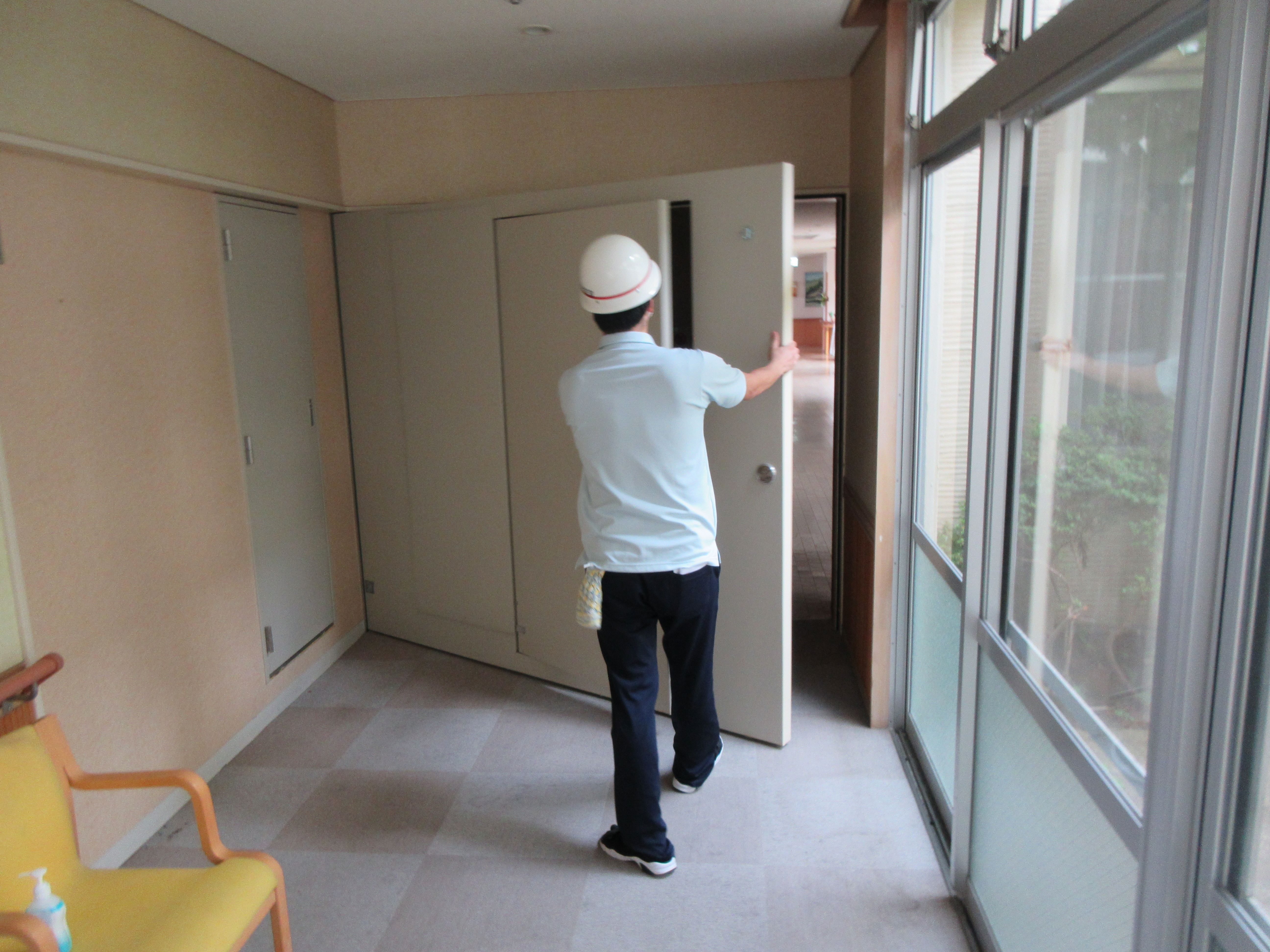 職員が利用者さんを各避難場所に誘導。各部屋の見回り、防火扉を閉め、人数確認。