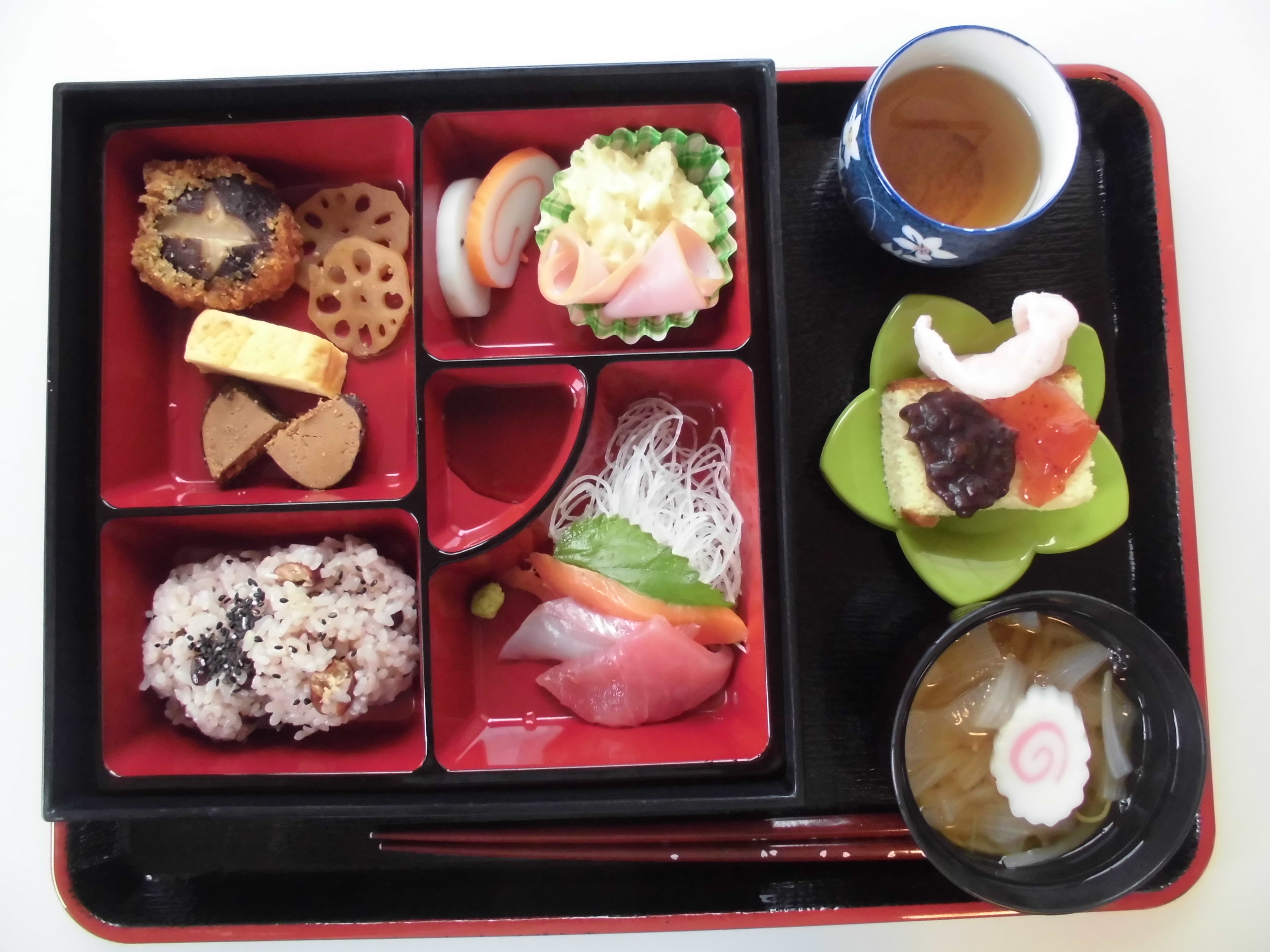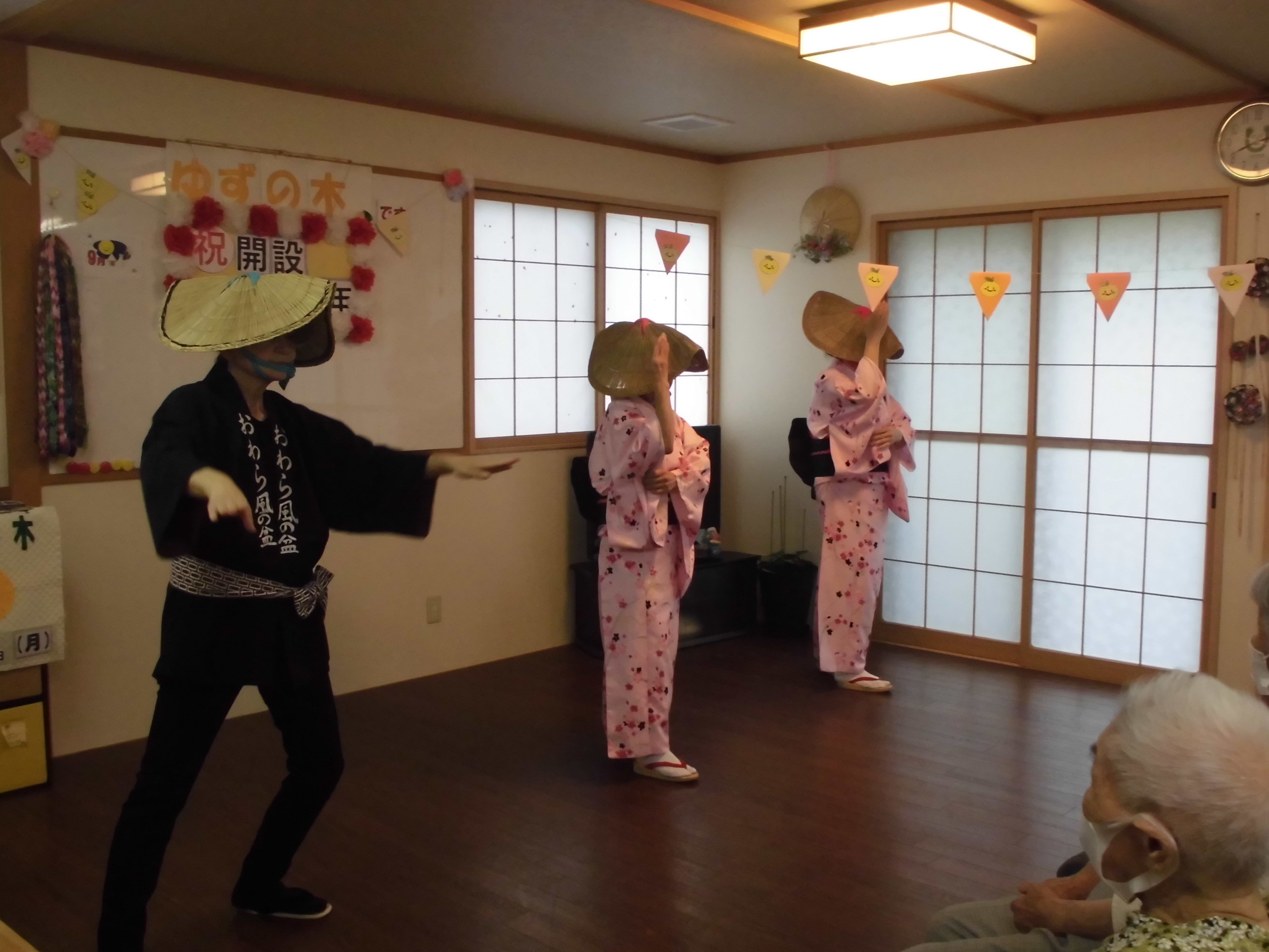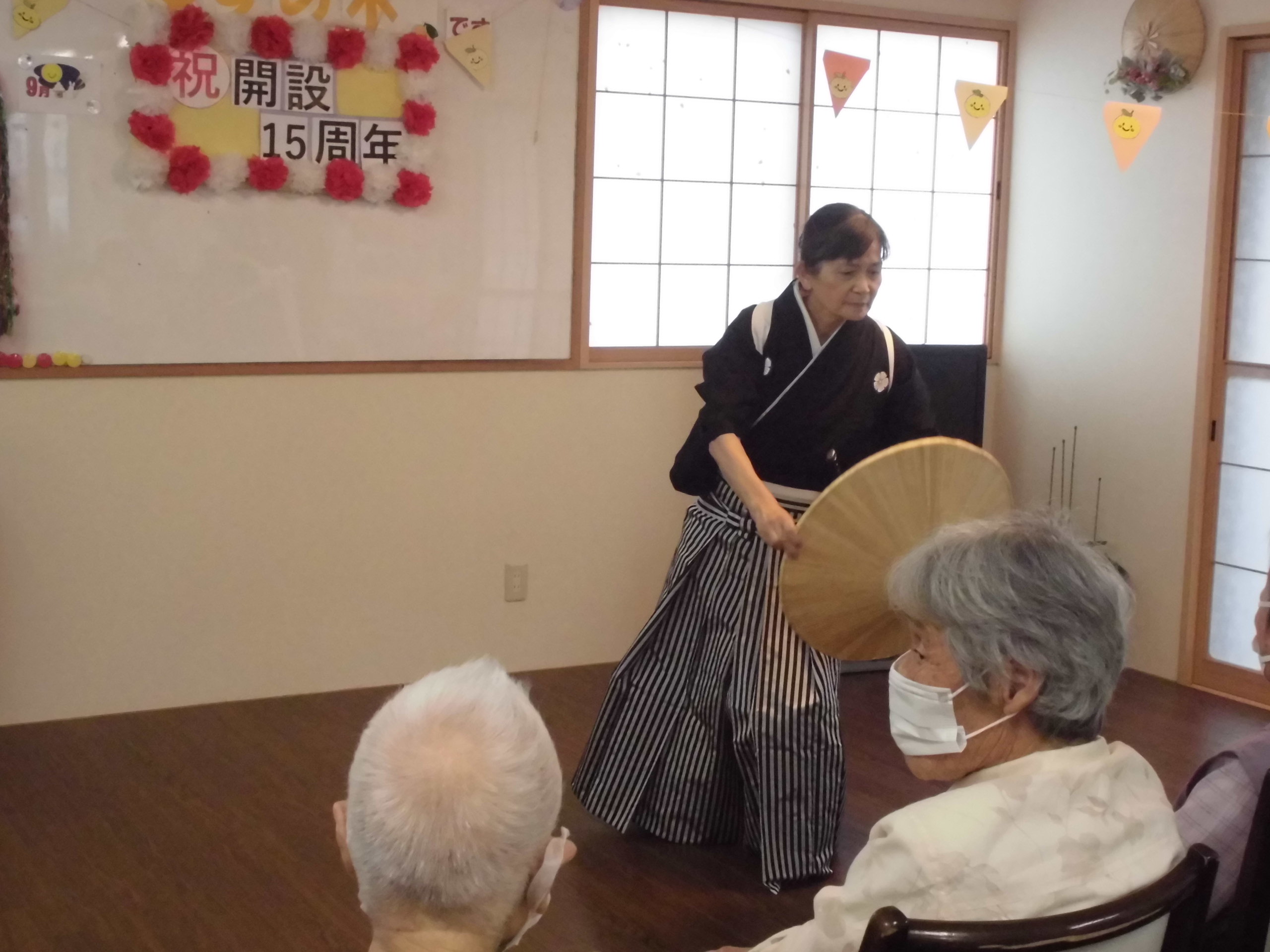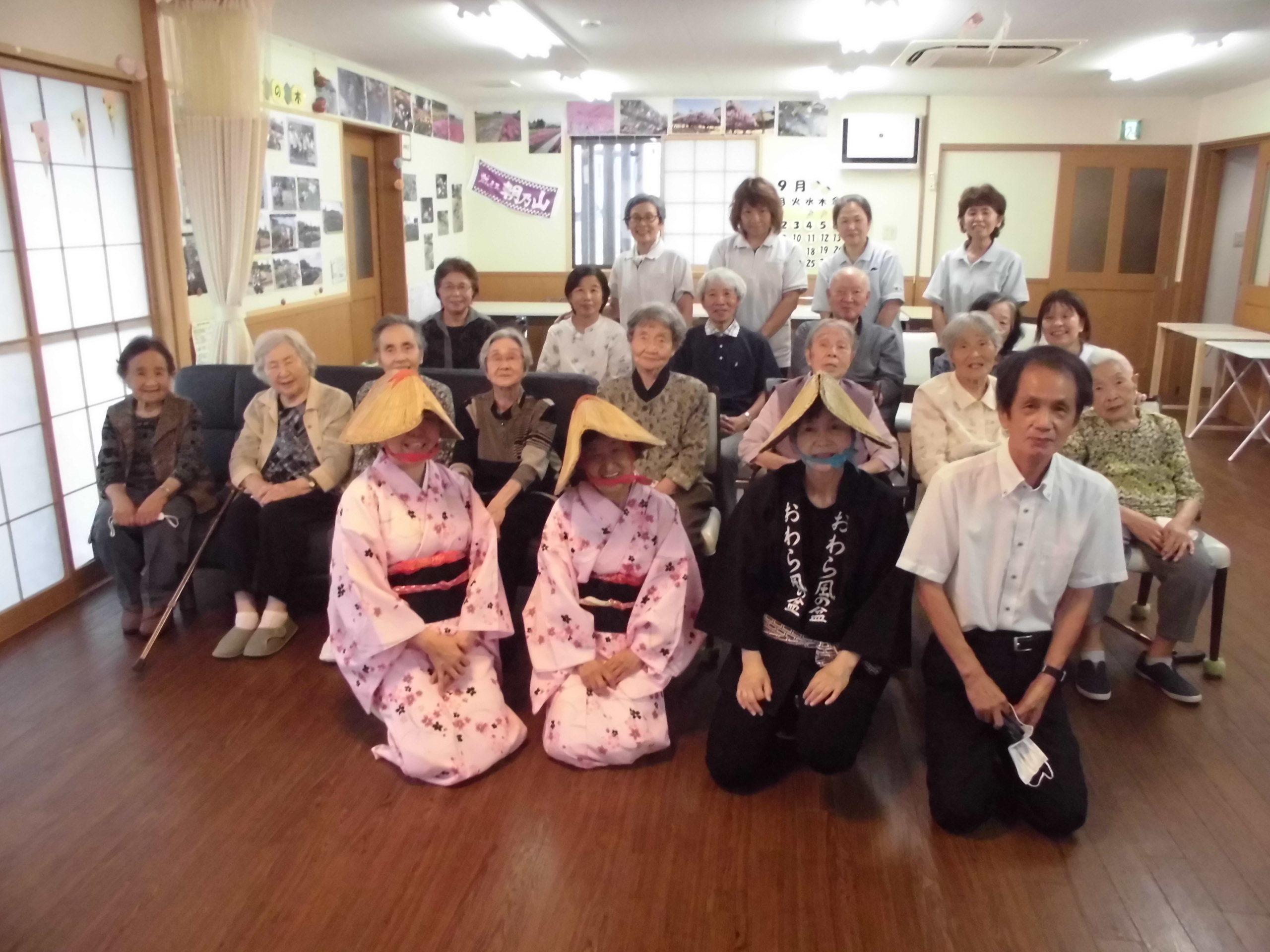 今日は、松花堂弁当での祝い御膳で堪能し、また職員ボランティアによる「おわら風の盆」の情緒ある踊りや「麦屋節」を観覧しました。口々に「昔、八尾へ観に行ってきた!」「あら、素敵!」と厳かな雰囲気に包まれたひと時でした。