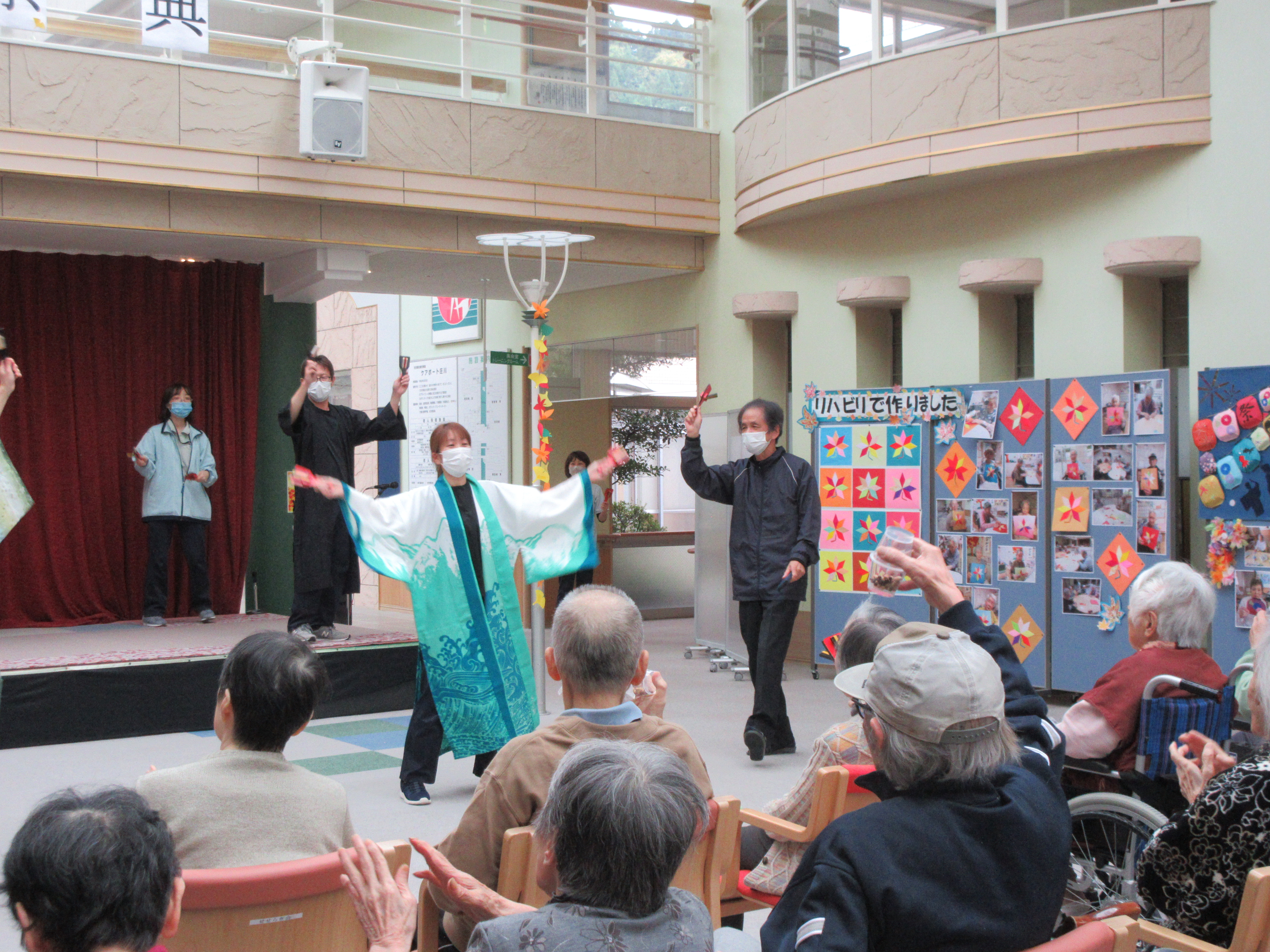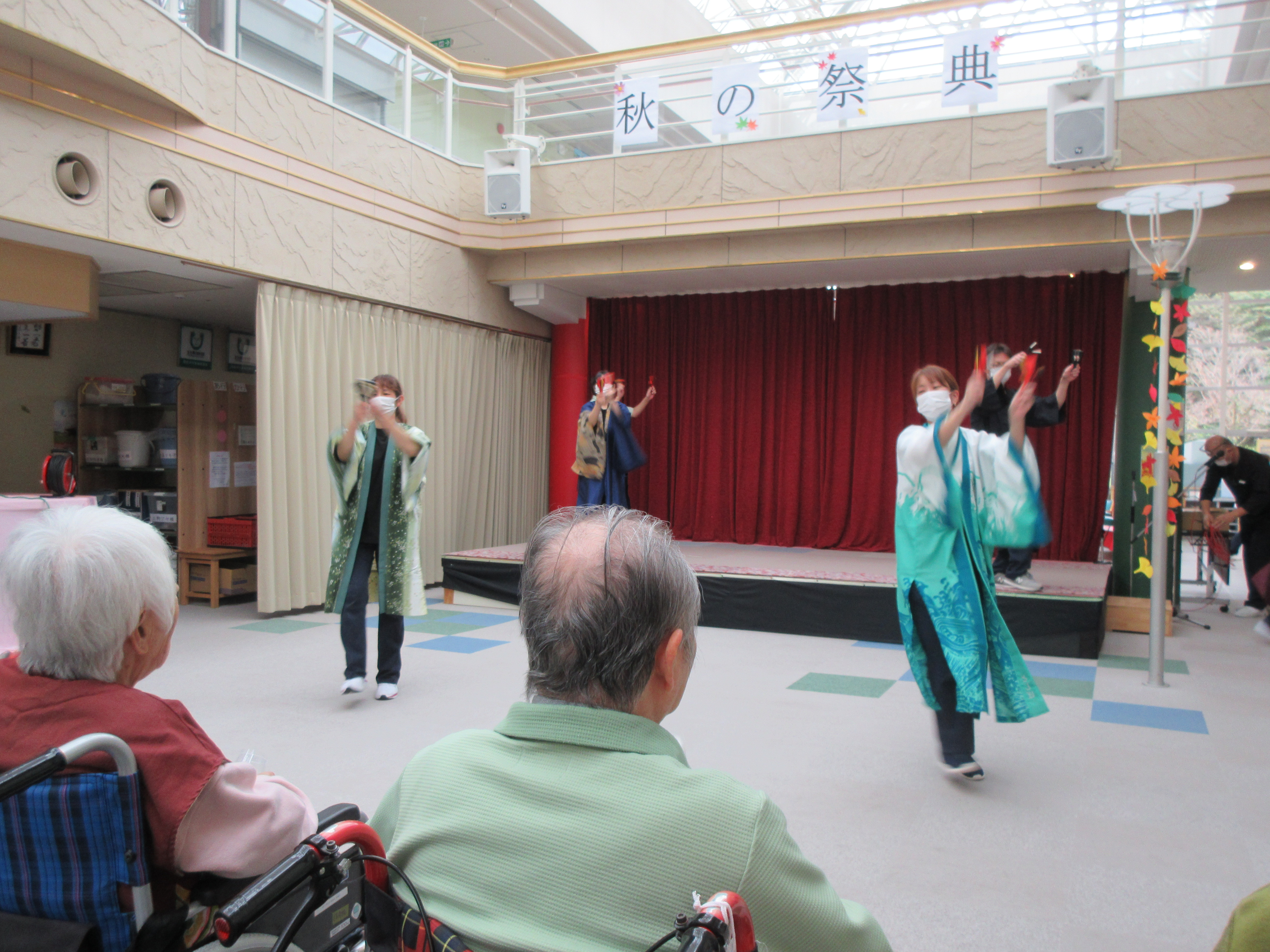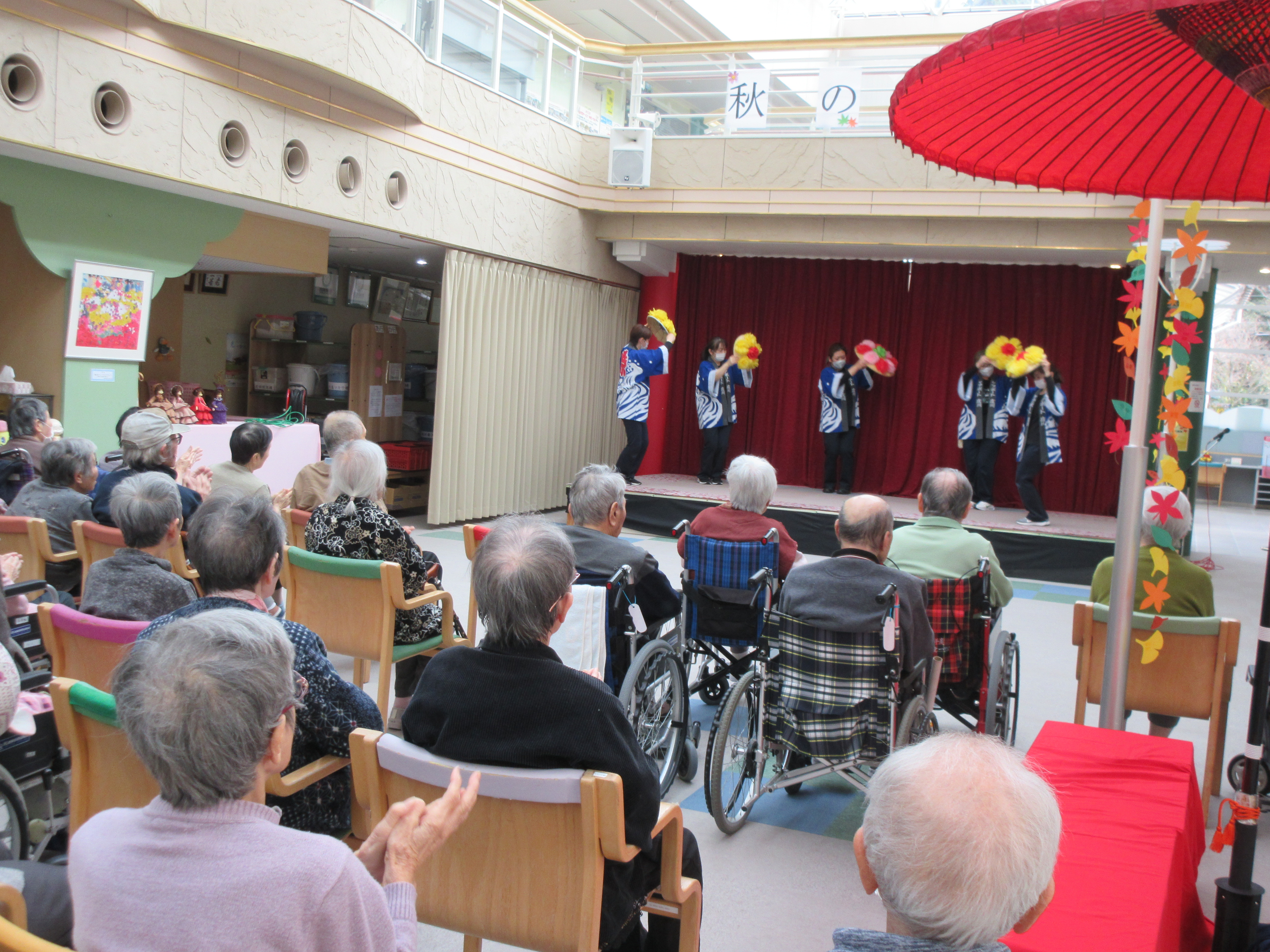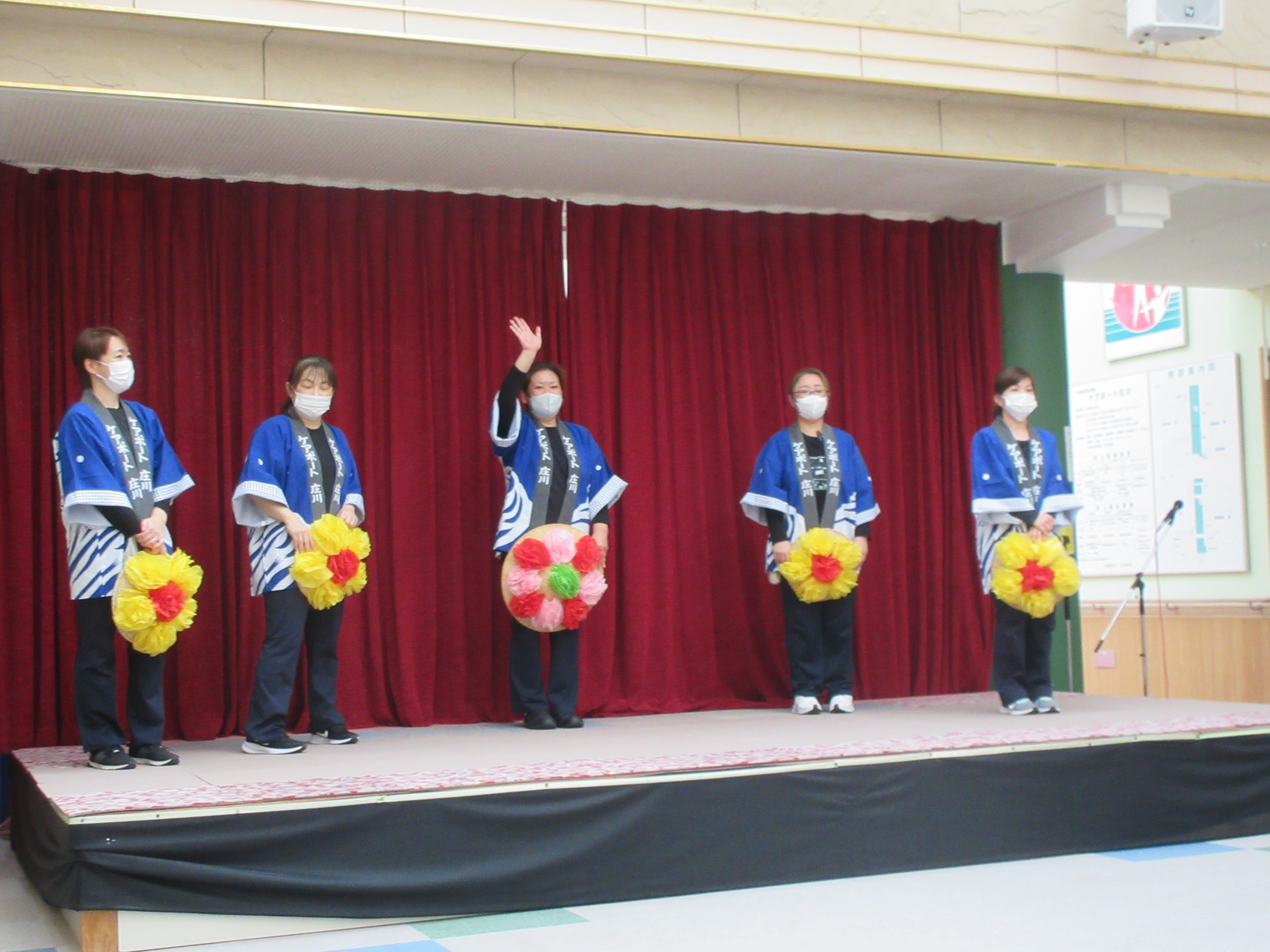 よさこい鳴子踊りです。どんどん人が増えていき、最後にはケアポート庄川の理事長も参加しました。