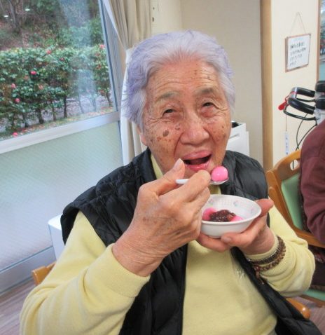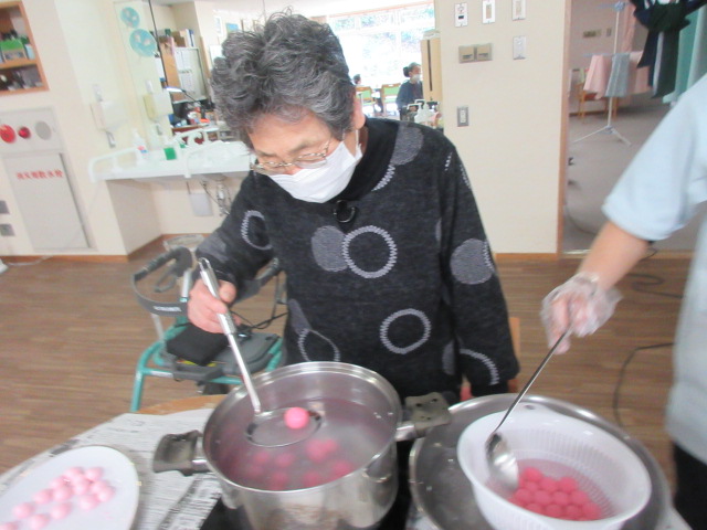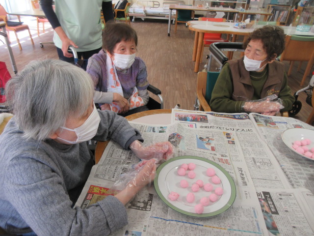 今月デイケアでは、花より団子ということで「桜風団子」を作りました(^^)