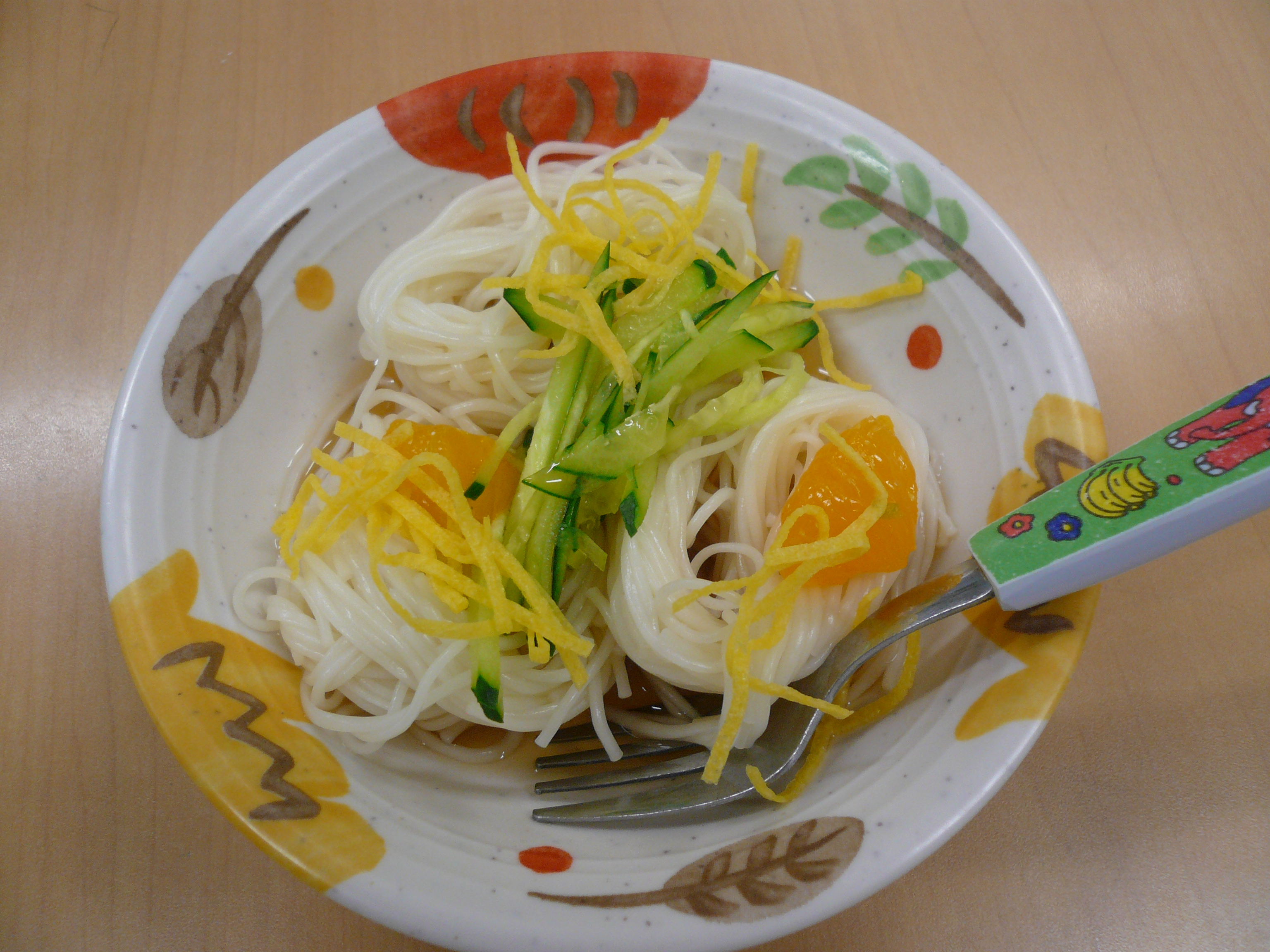 新鮮なきゅうりを使って、おやつに”そうめん”を出しました。