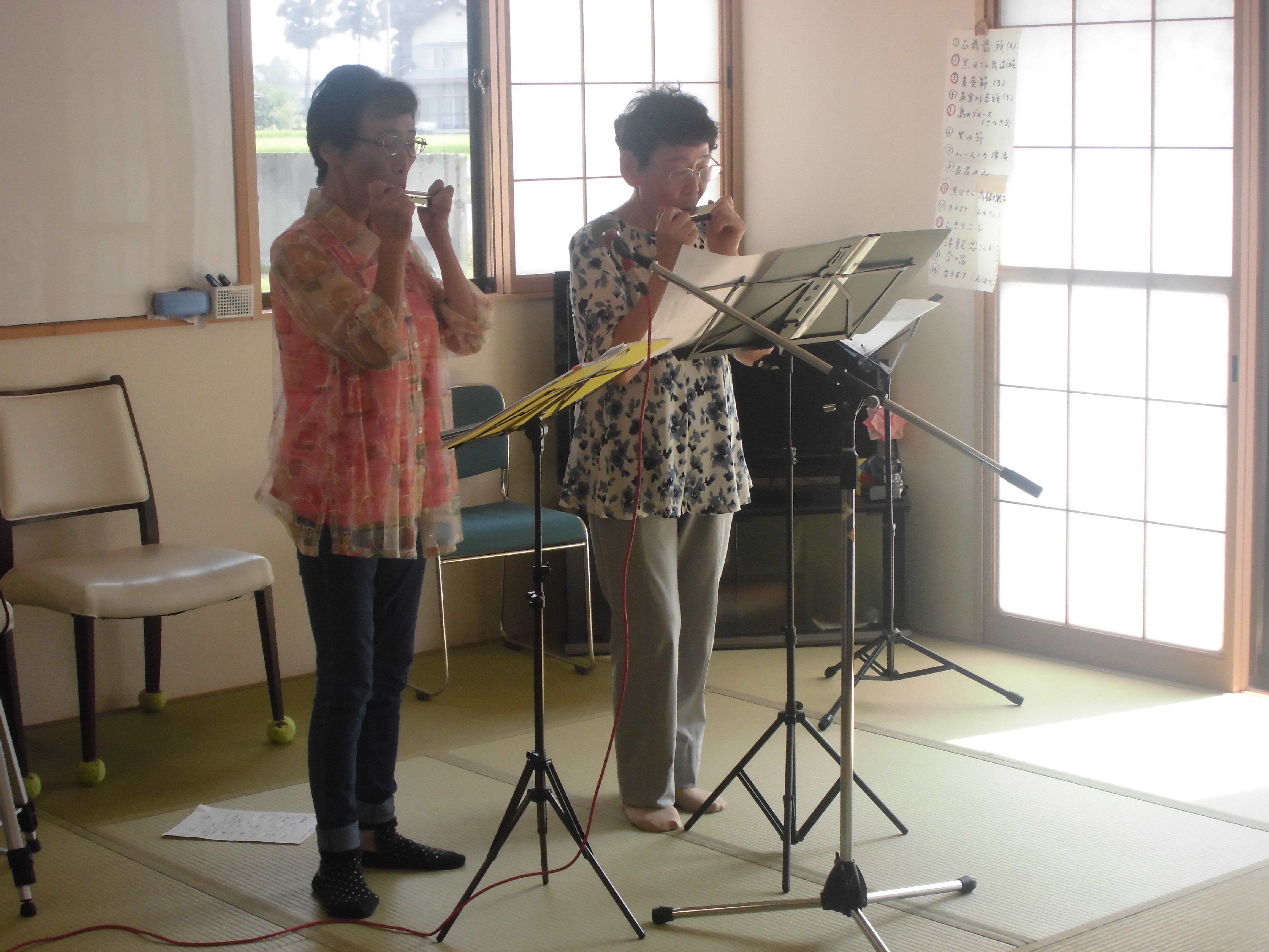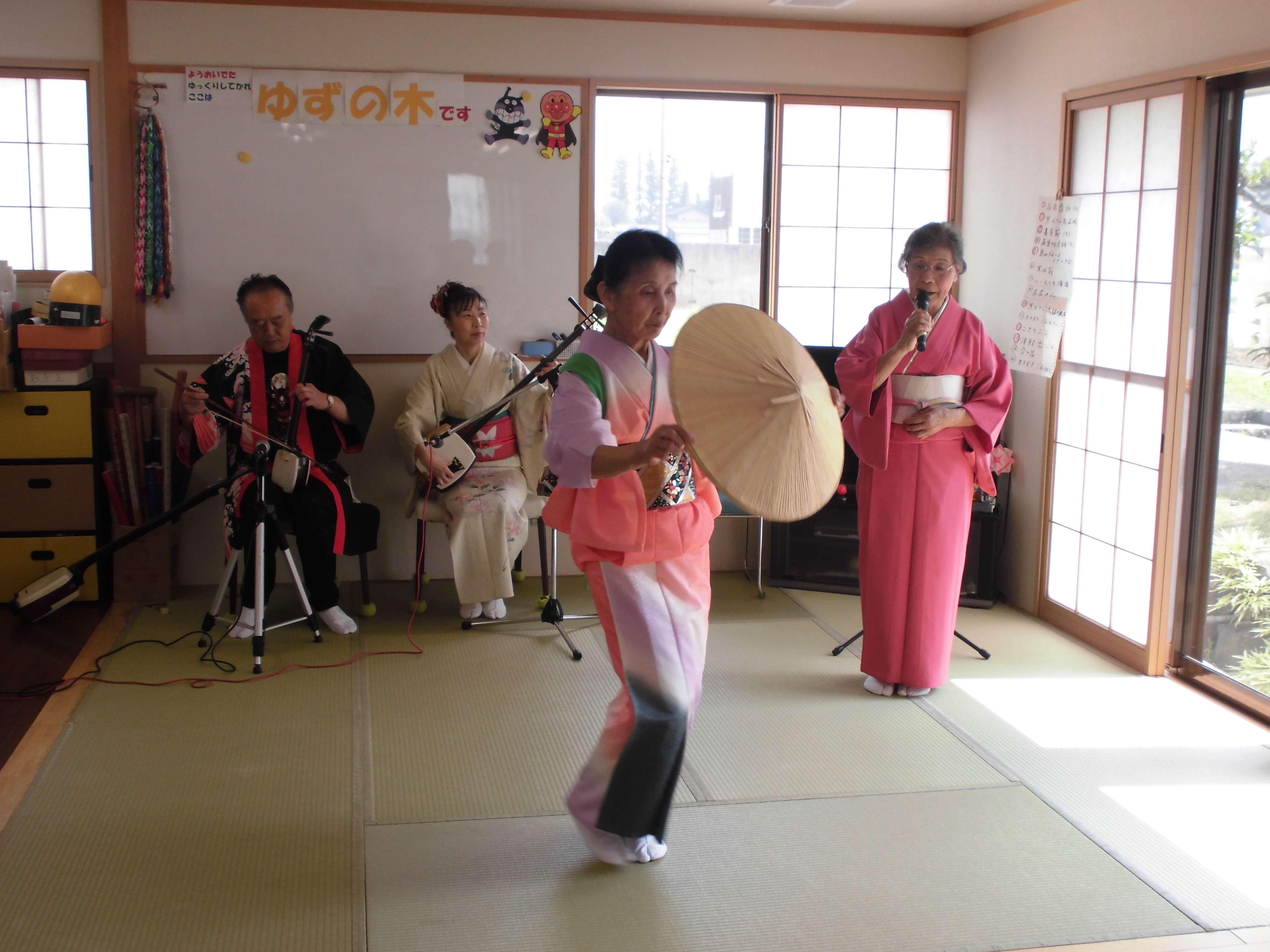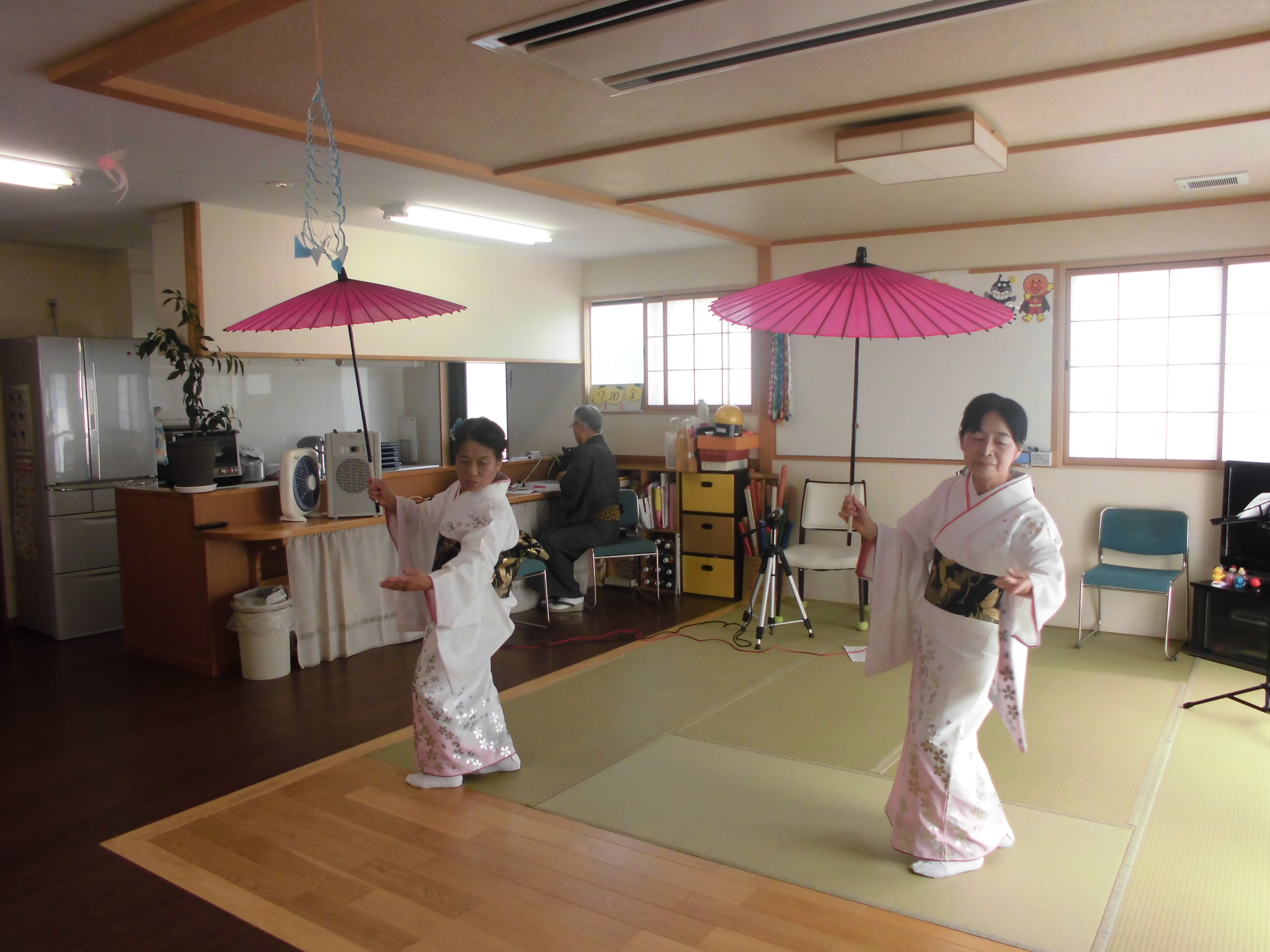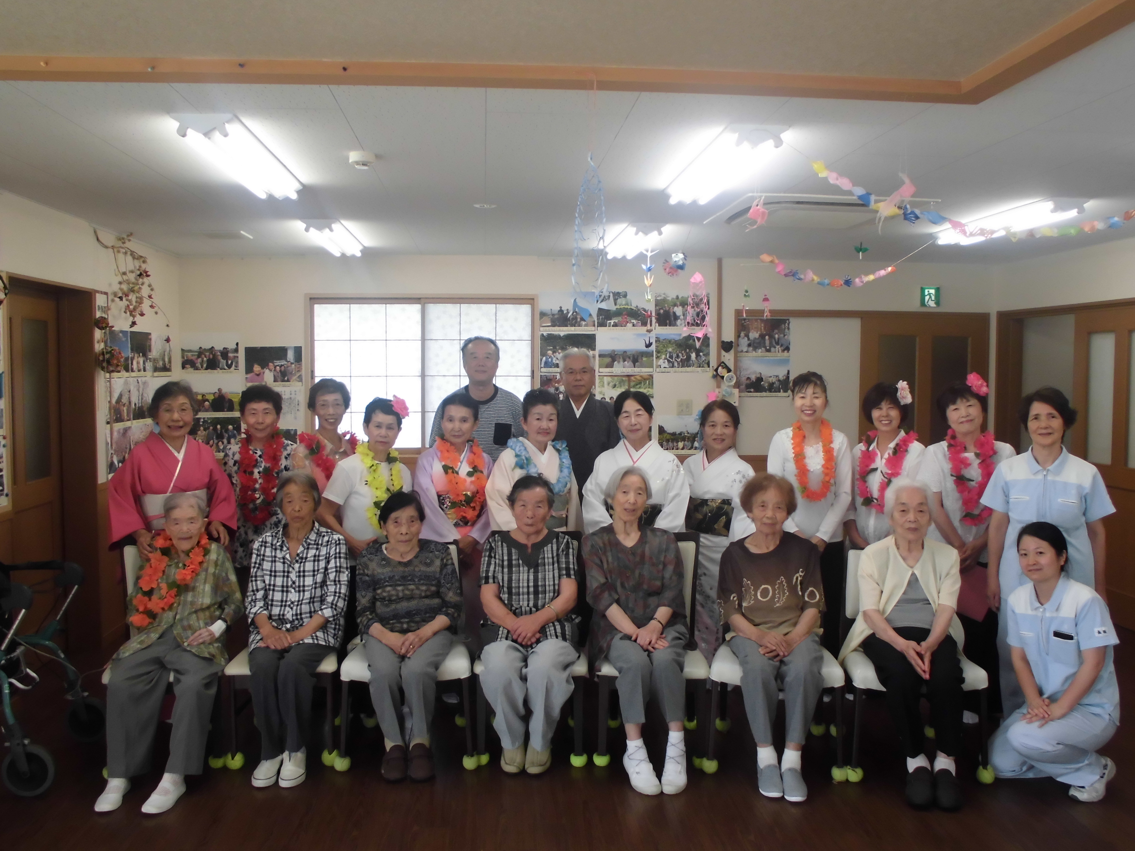 暑い中、ゆずの木に喜楽会の皆さん(13人)が利用の方々に歌や踊りなど内容盛りだくさんの