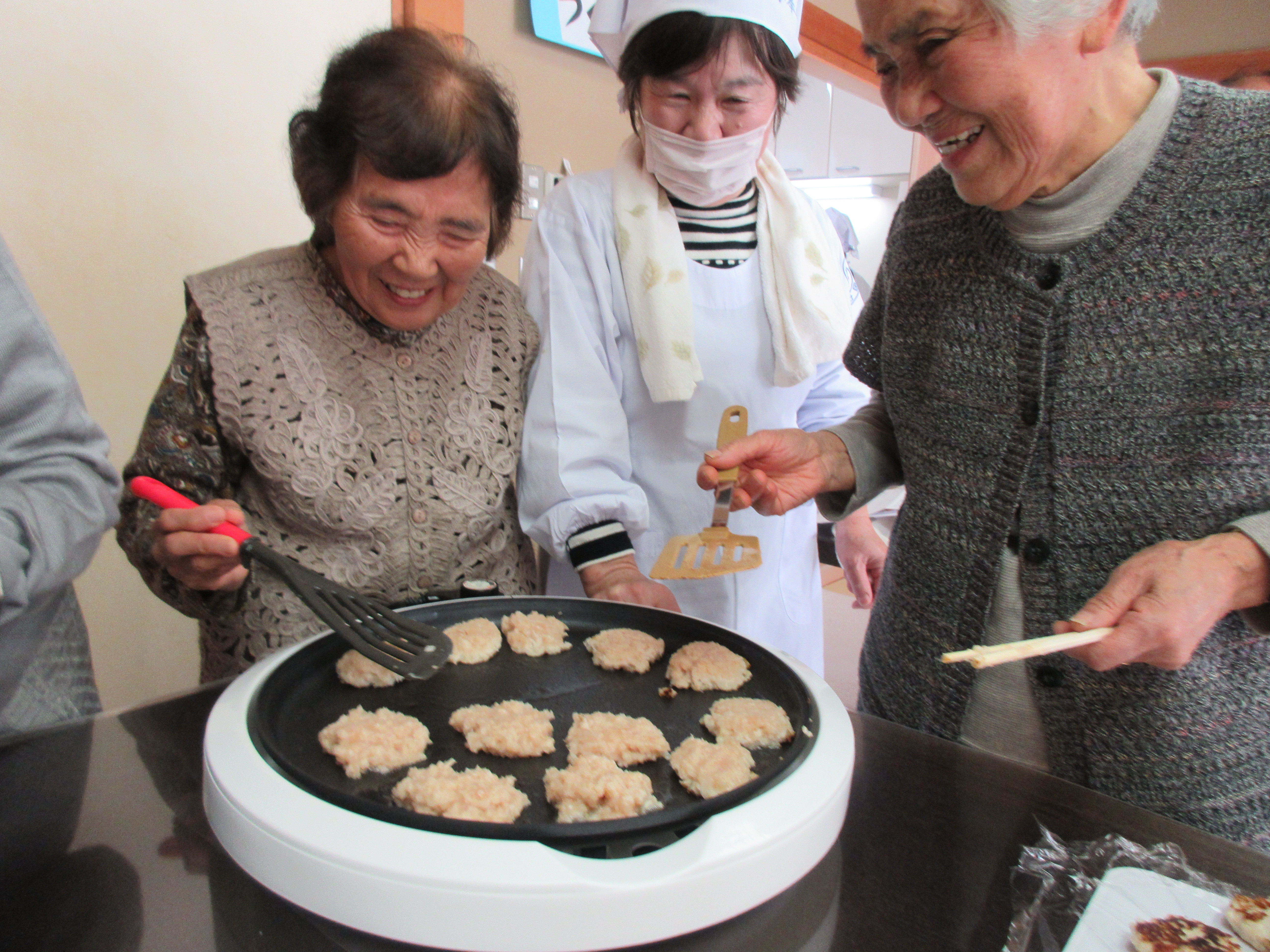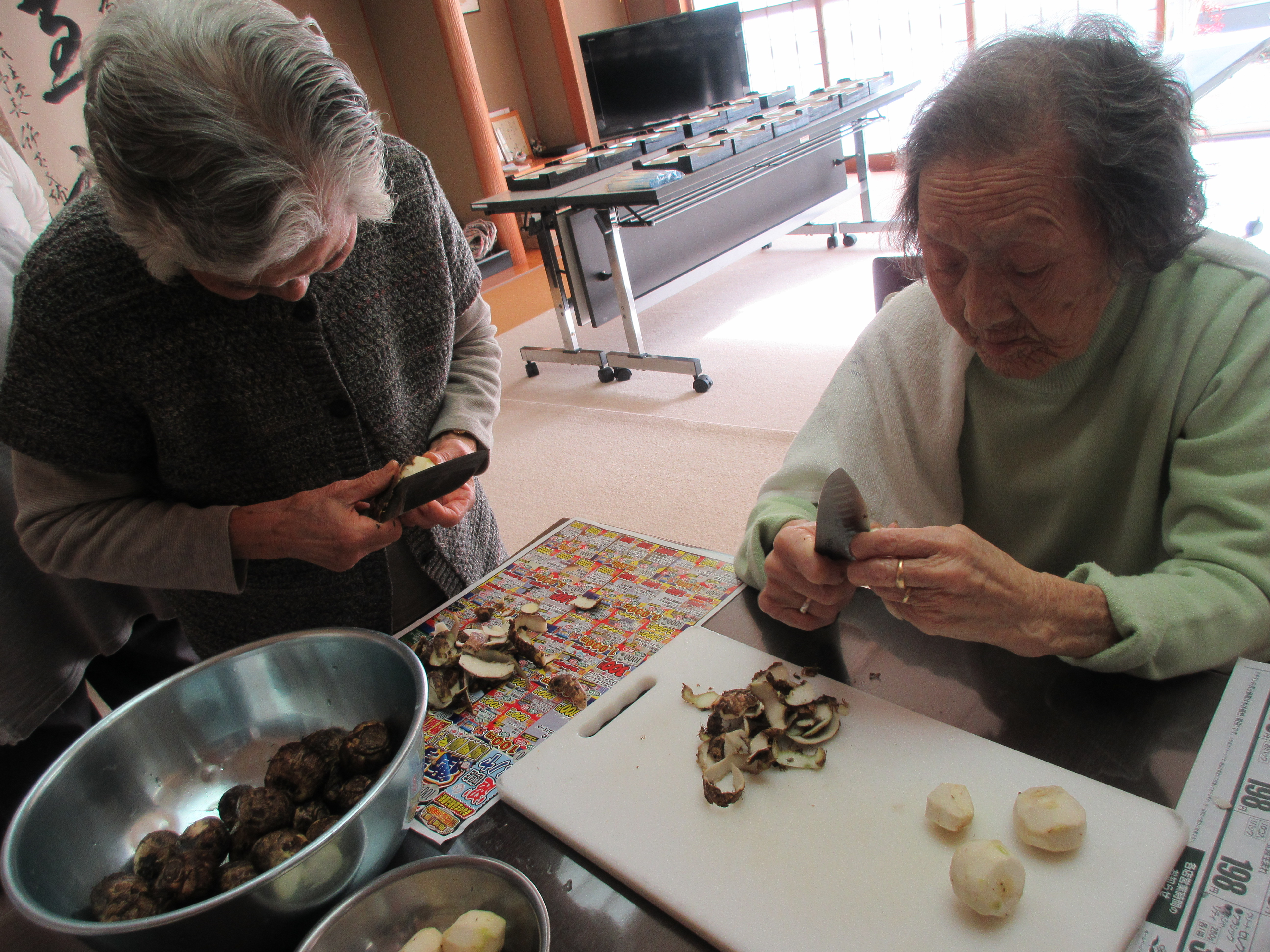 利用者さんも里芋の皮むきやレンコンと挽き肉を混ぜ合わせたつくね焼きなどを手際よくされ、生きいきとした姿を見せていただきました。
