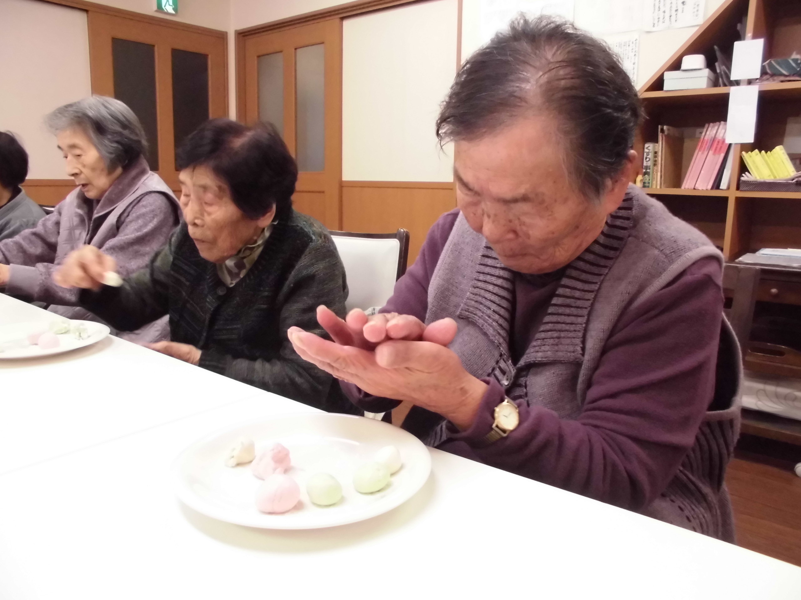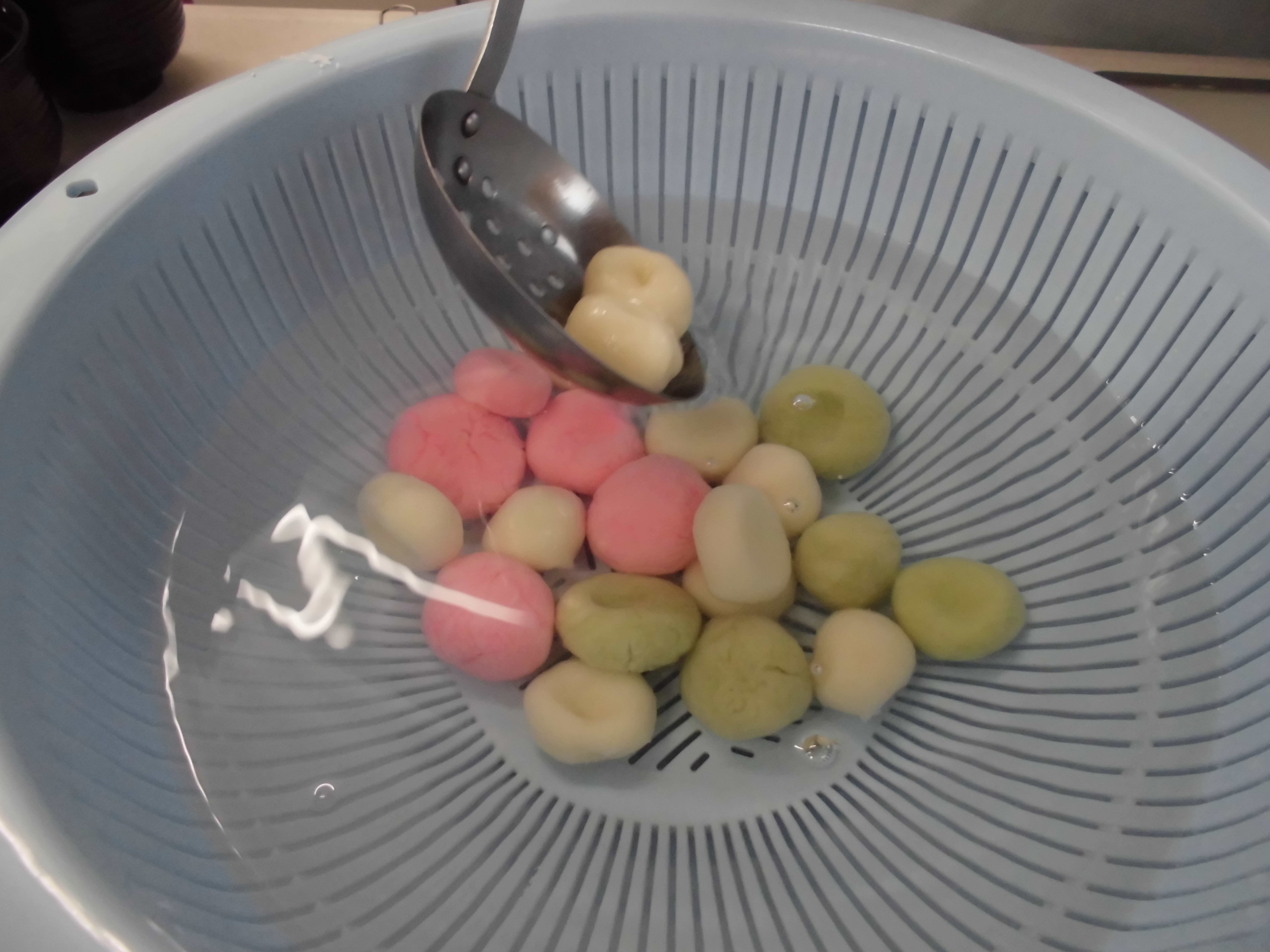 豆腐を入れて柔らかい団子を作りました。三色のきれいな団子が出来上がりました。