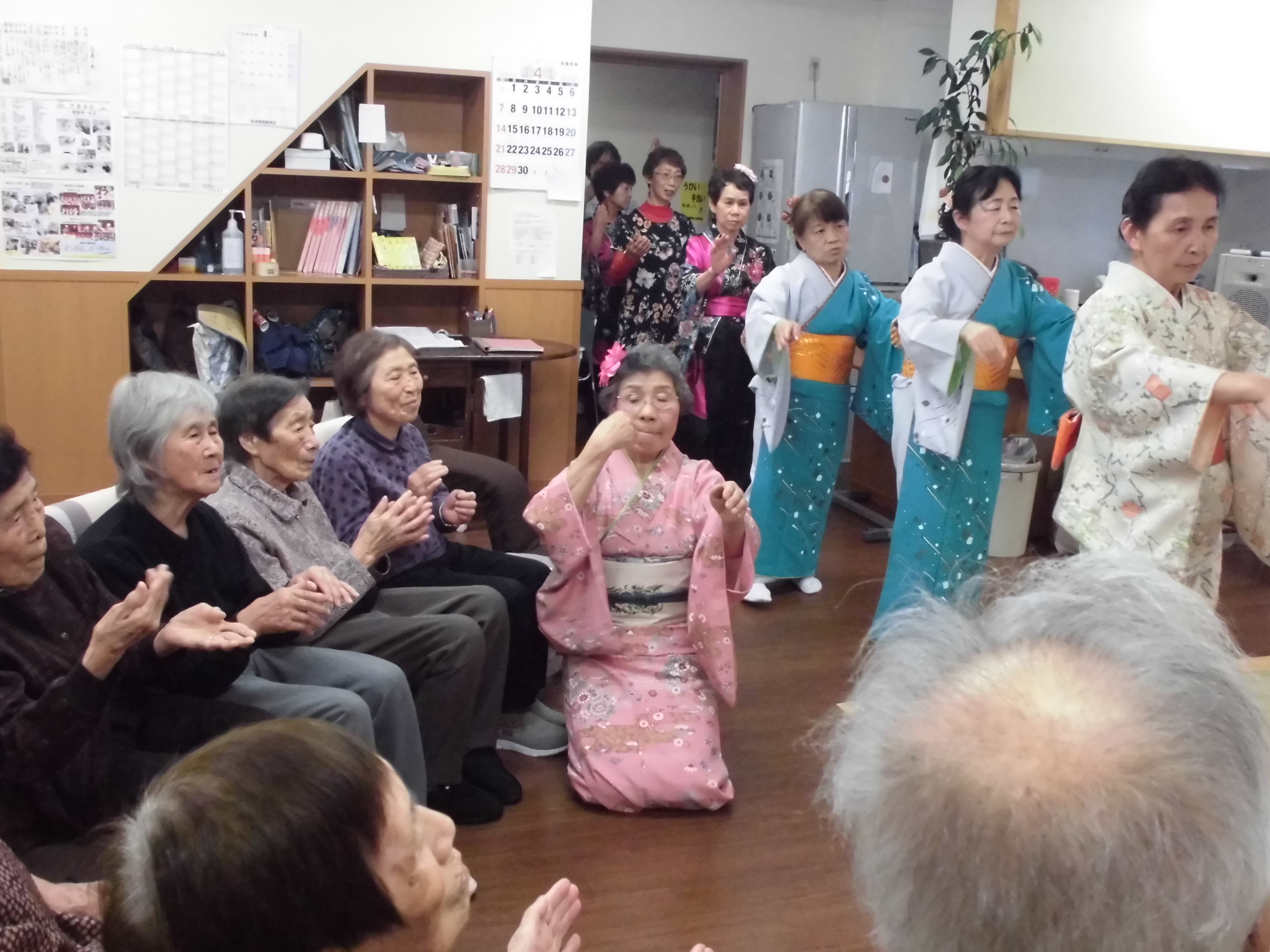 大ホールにいるような迫力のある歌声・演奏から始まり、昔から親しまれている「庄川小唄」「こきりこ節」等の踊りがあり、皆さん若返った気持ちになりました。最後に越中おわらを踊り楽しいひとときを過ごすことが出来ました。