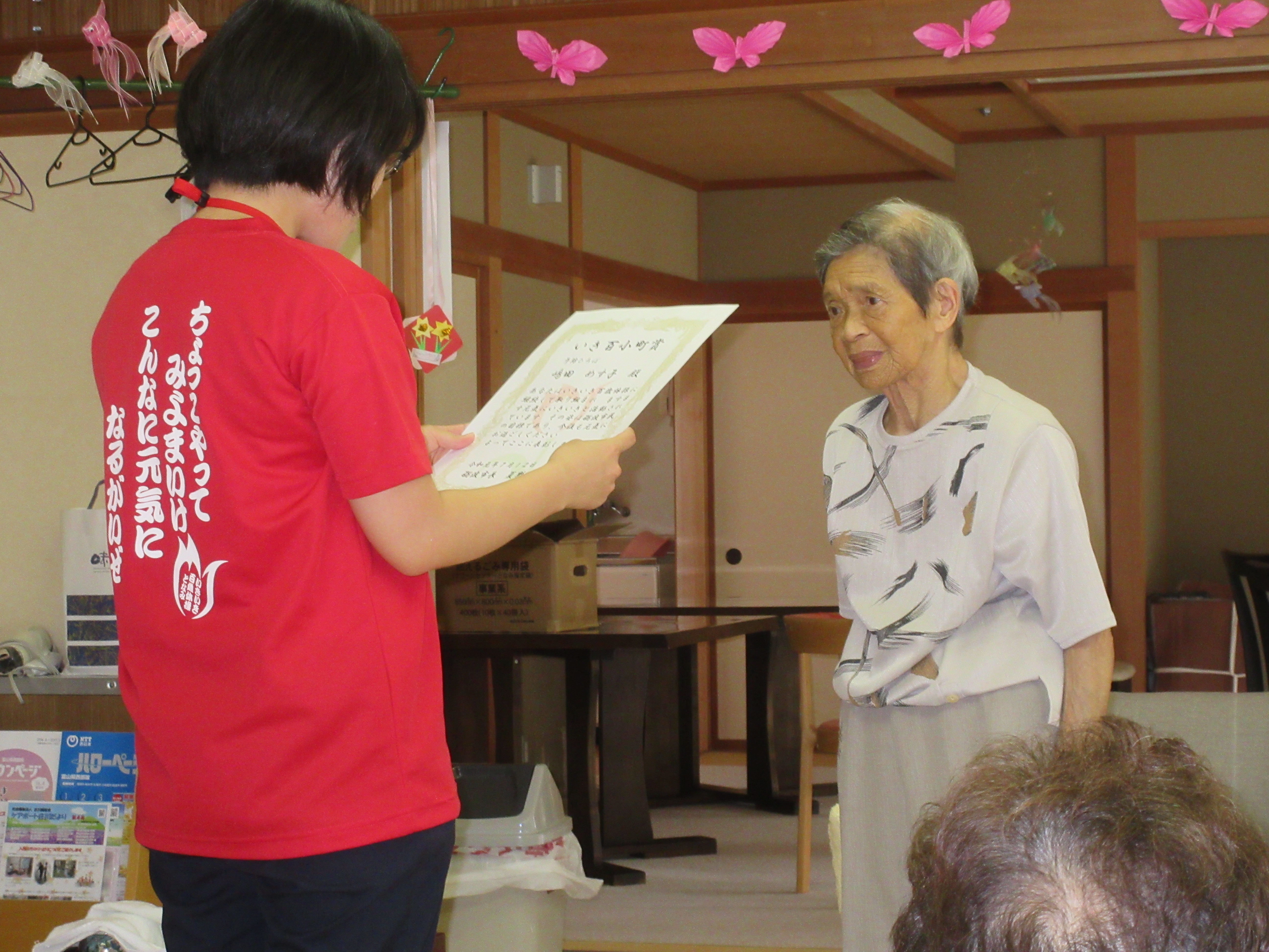 砺波市内で介護予防の「いきいき百歳体操」に取り組んでおられるグループの中で、女性の最高齢参加者が当ケアポート庄川予防ひろばの利用者さんにおられ、この度「いき百小町賞」を受賞されました。