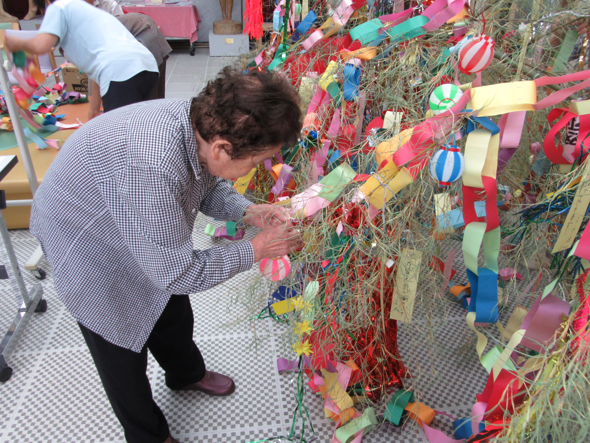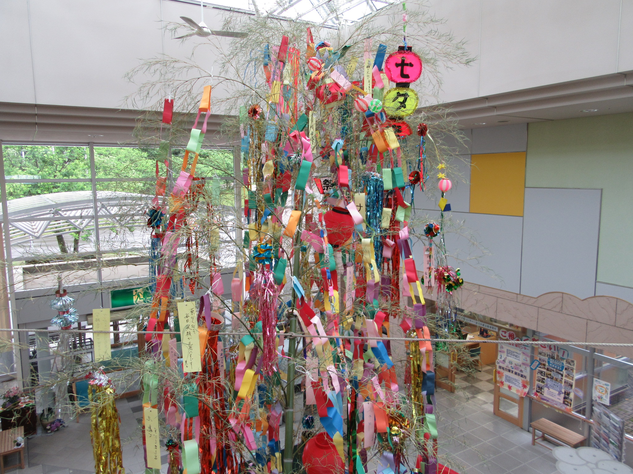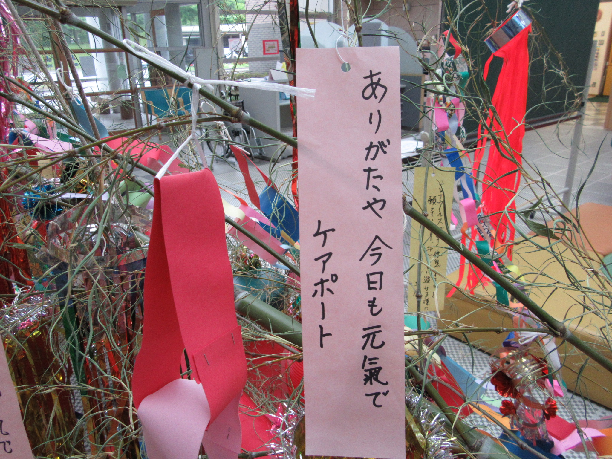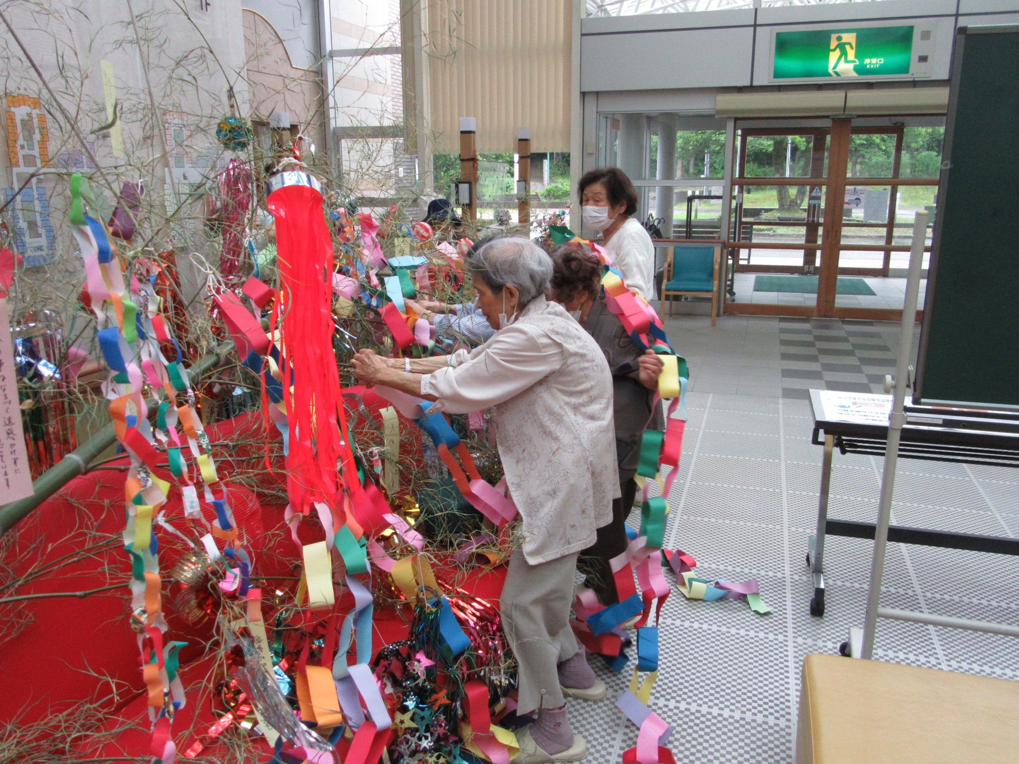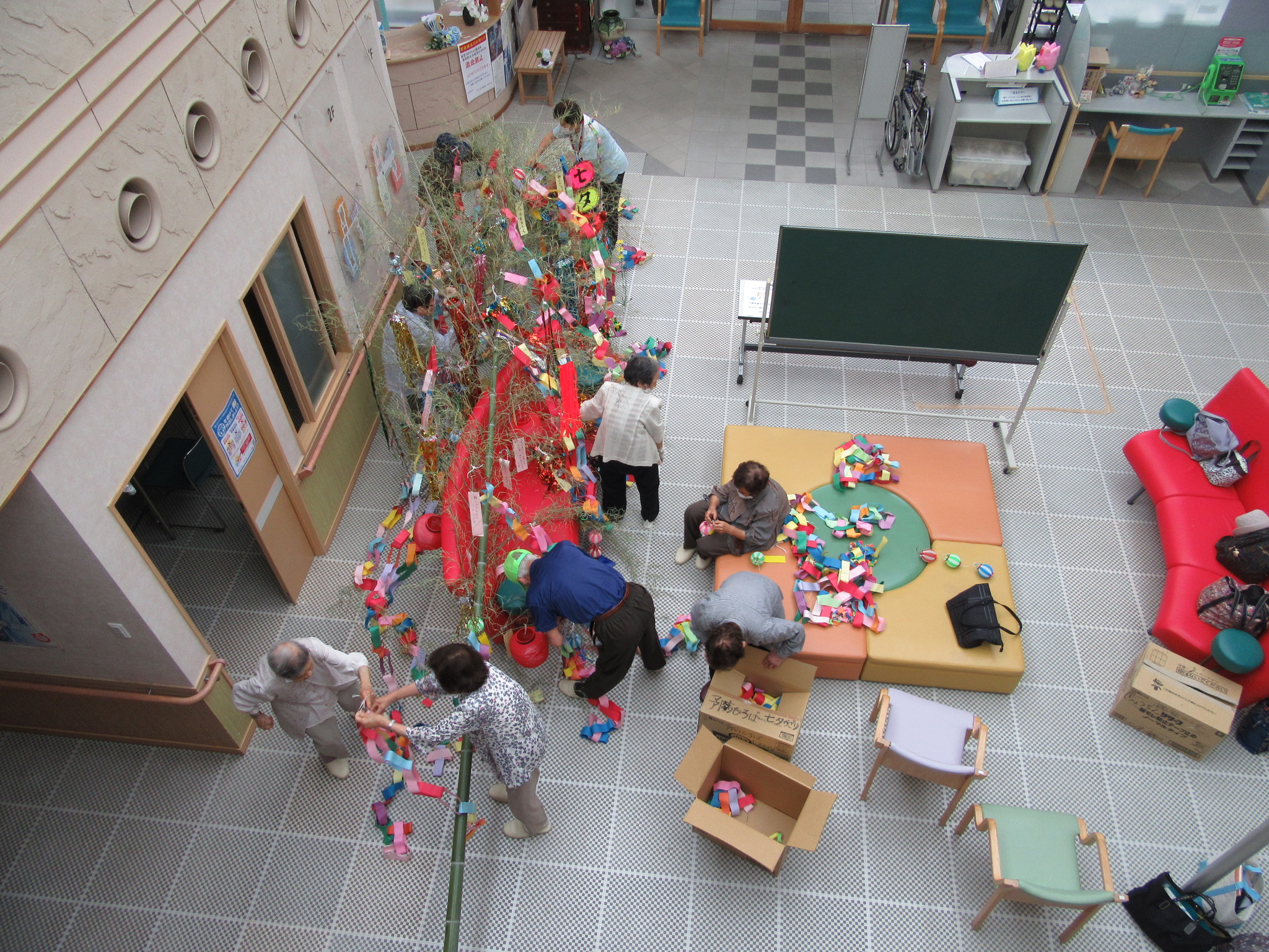 施設の正面玄関に入ると、目の前に予防ひろばの利用者さんで飾り付けをしていただきました大きな七夕が立ててあります。