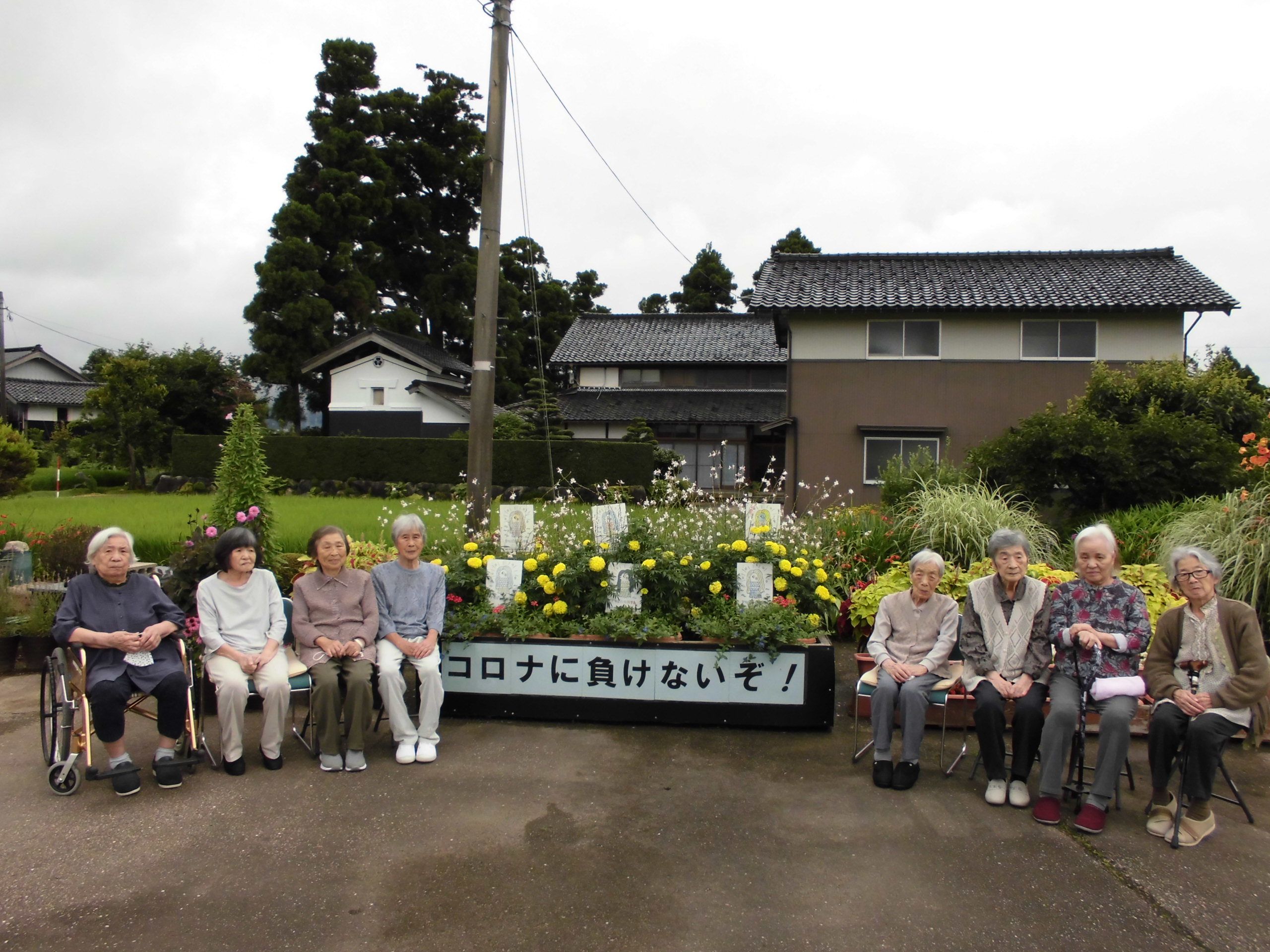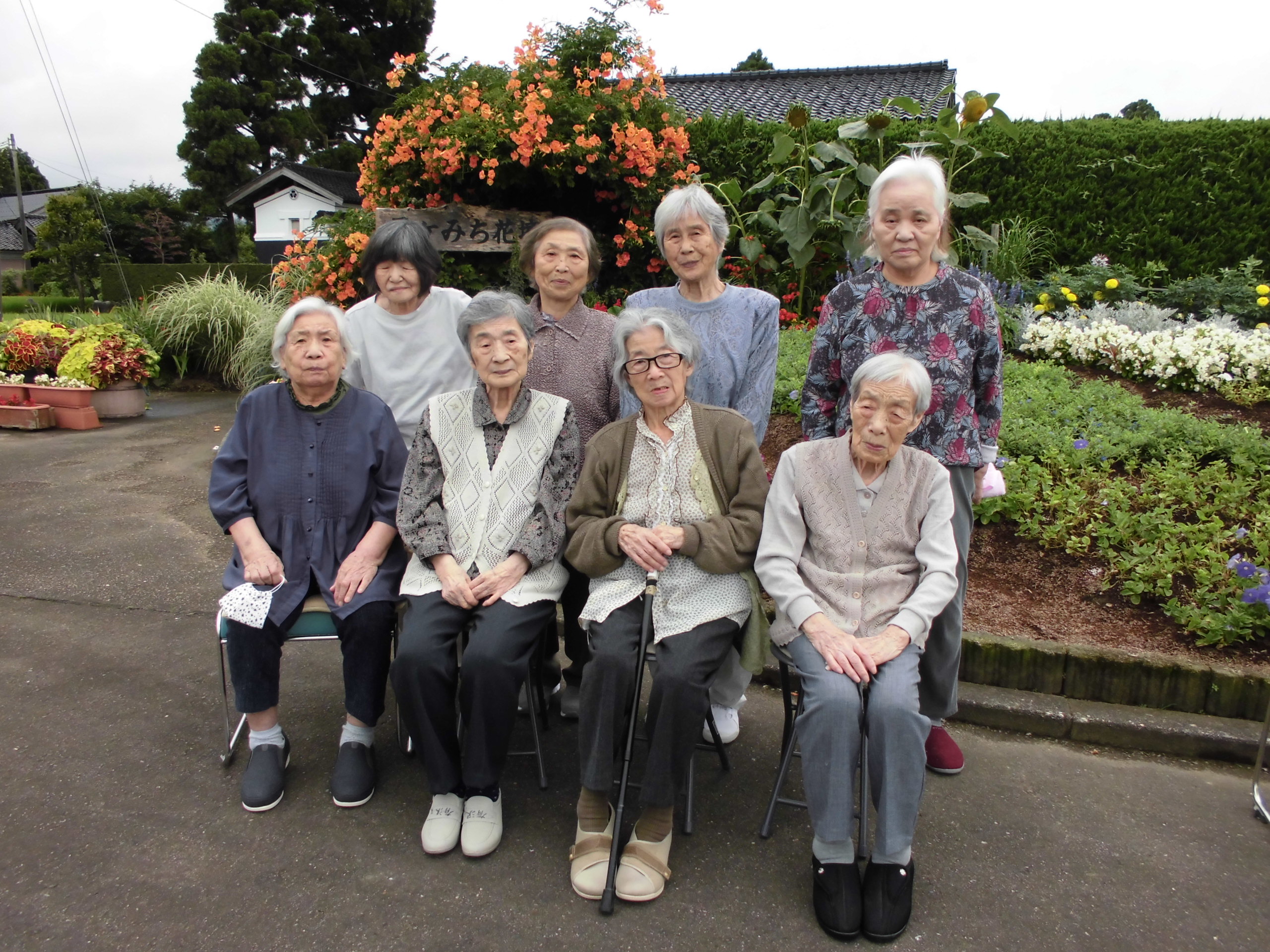 送迎時に通る五ケみち花壇、色々な花が咲き私たちを楽しませてくれます。野外活動で出かけると、お一人ずつ写真を撮りお渡ししています。恥ずかしいと言いながらも、モデルのようにポーズを決めてくださいます。花に負けず、いつまでもお美しい皆さんです。