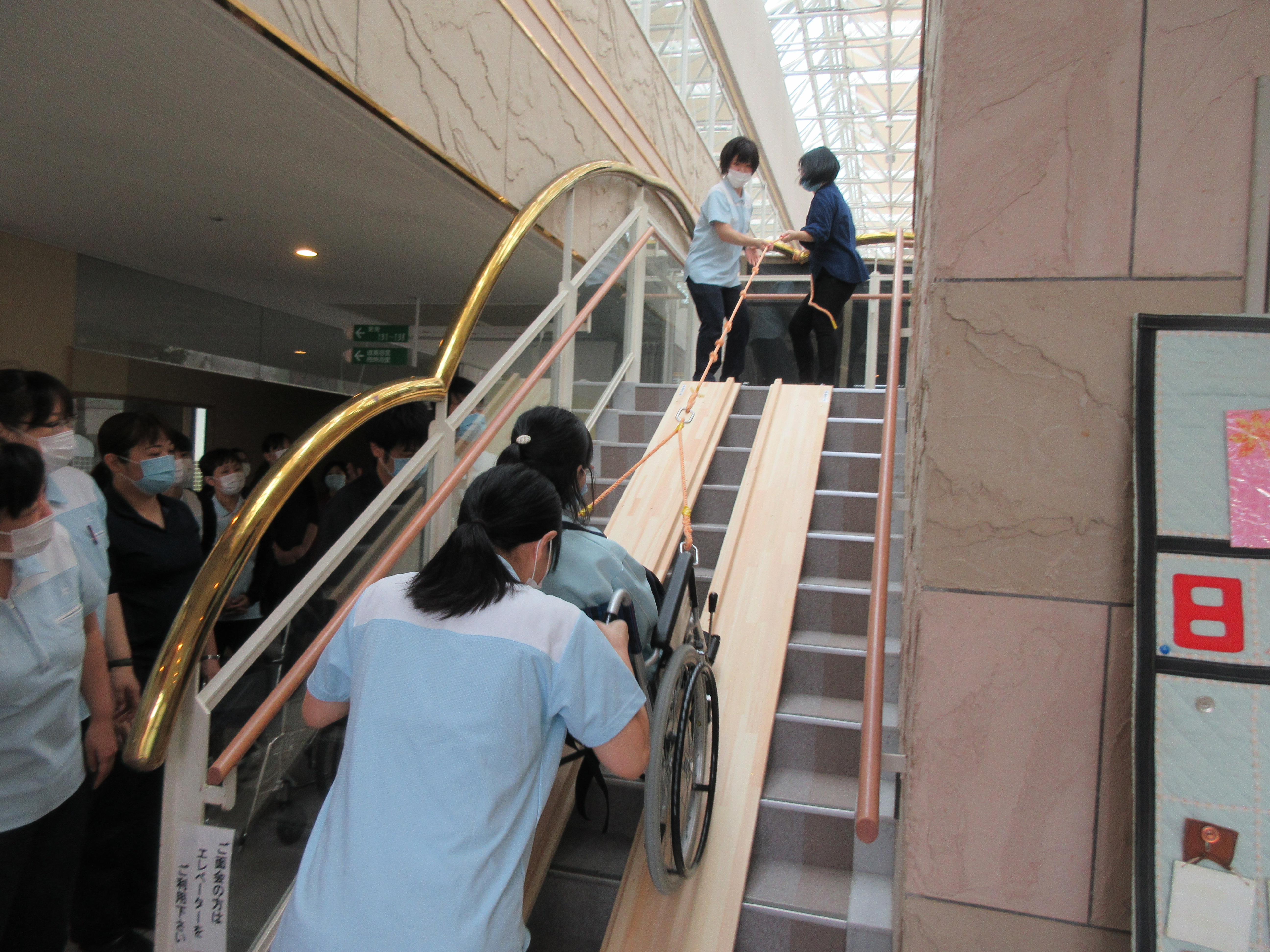 この日は、職員が入所者代わりに車いすに座り訓練しました。