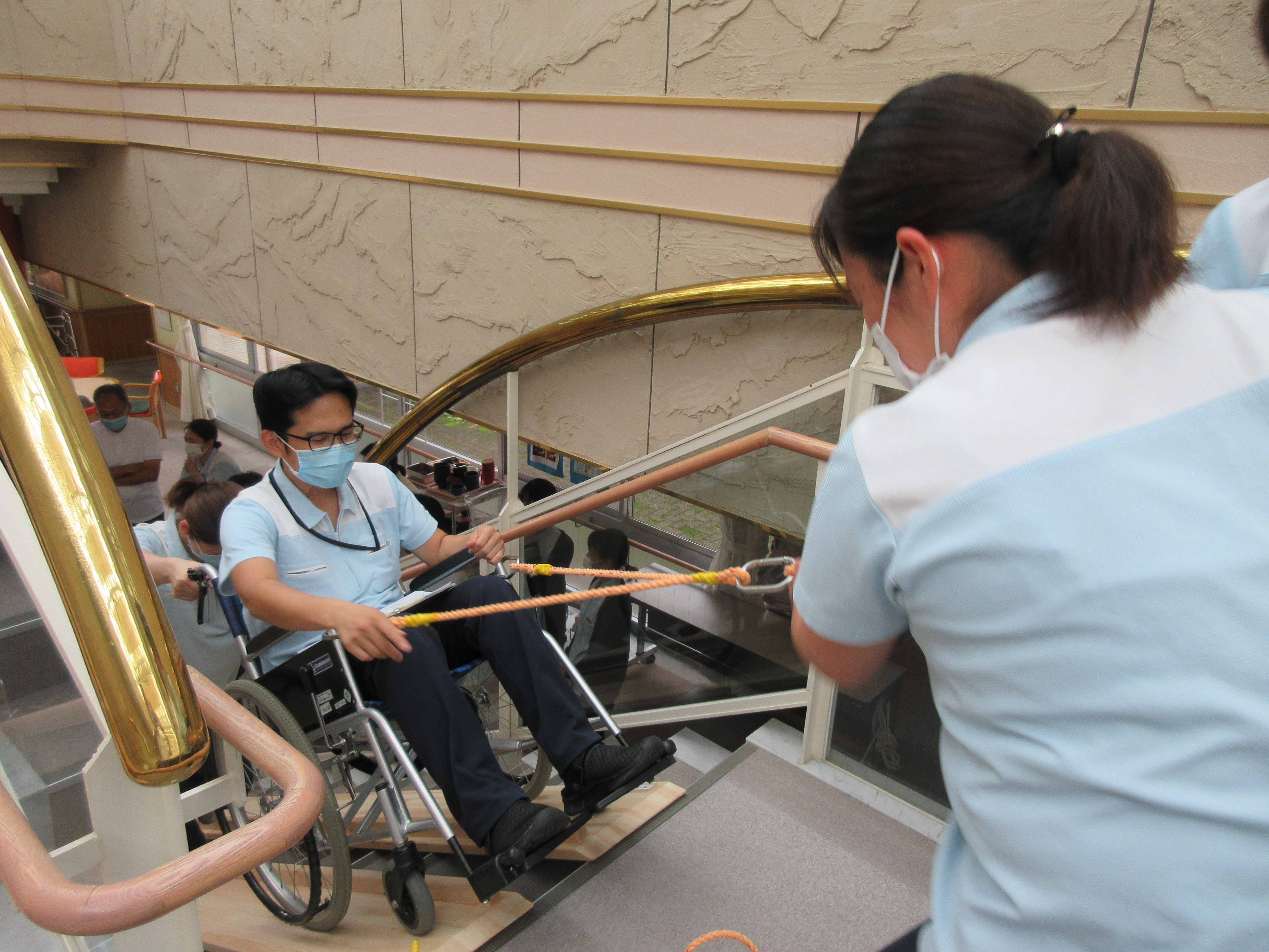 土砂災害防止法に基づく訓練であり、「集中豪雨によって正面の山が地すべりして土砂が流入する恐れがある、入所されている方を1階から2階へ緊急避難させなければいけない、エレベータは使用できなくなった」という想定で行いました。