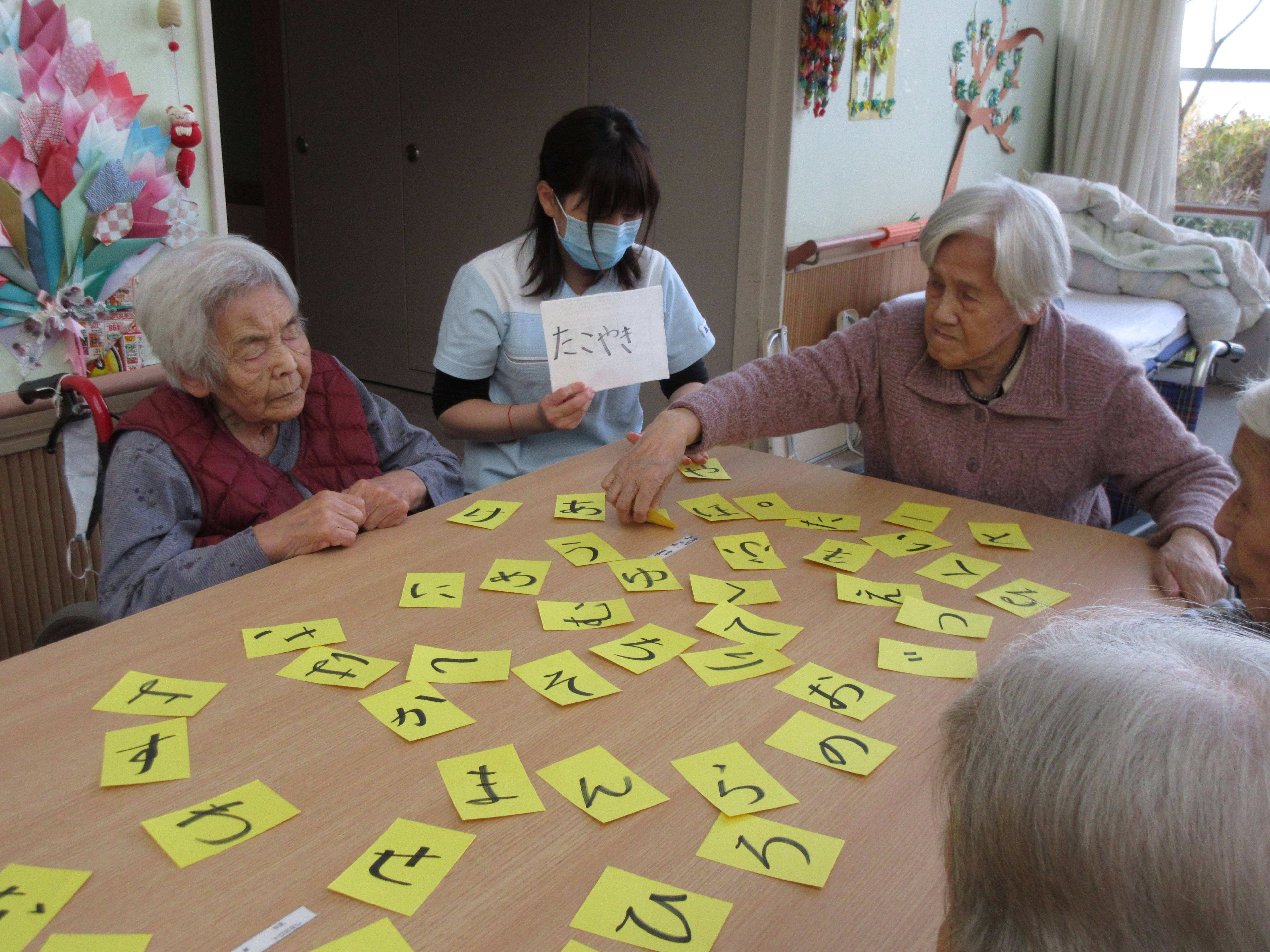 机の上に五十音のカードをひろげ、職員が出したお題を皆さんでカードを集めて作るゲームです。