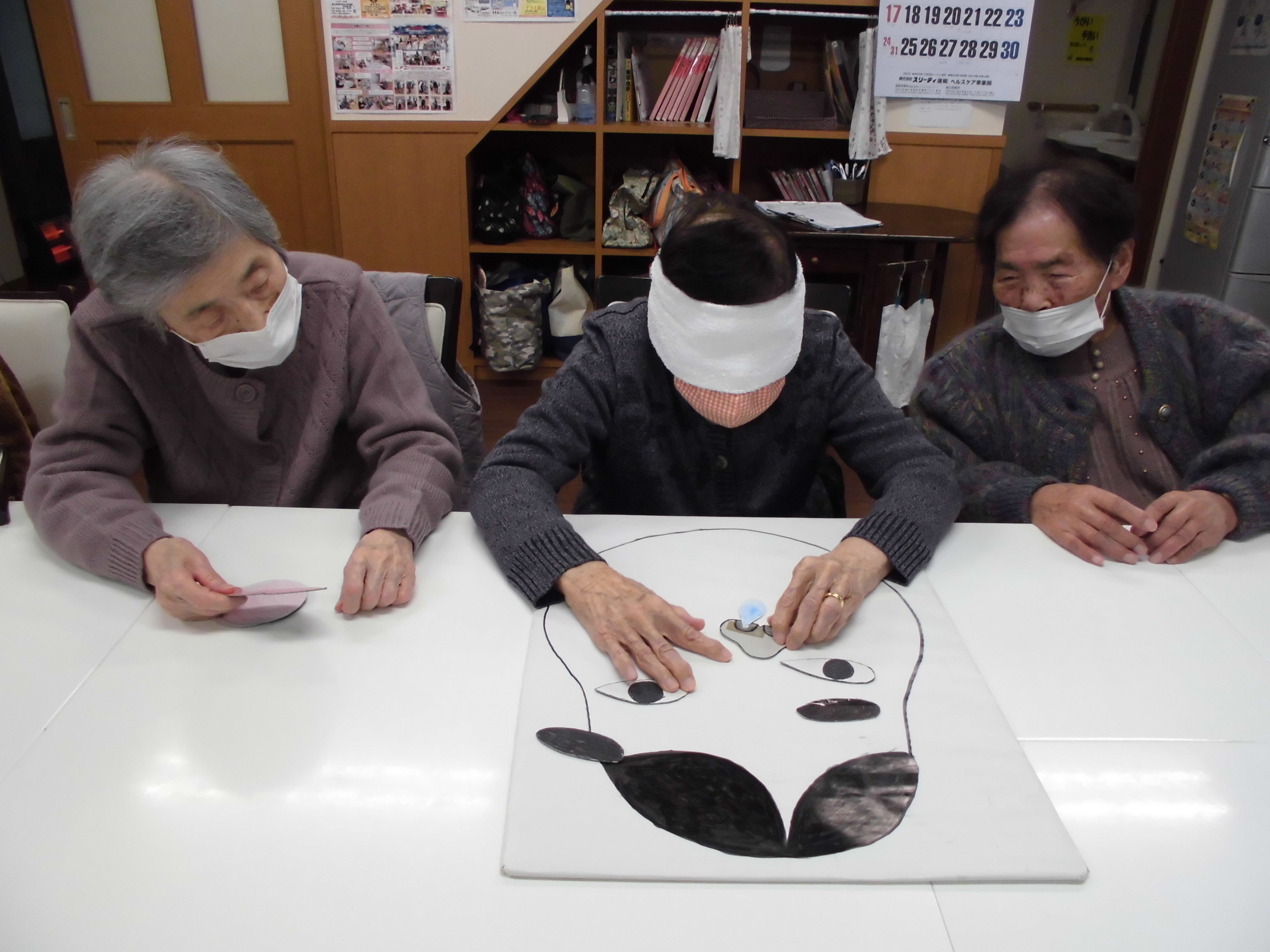 タオルで目隠しをして隣りの方に目、鼻、口を手渡しをしてもらいながらの共同作業
