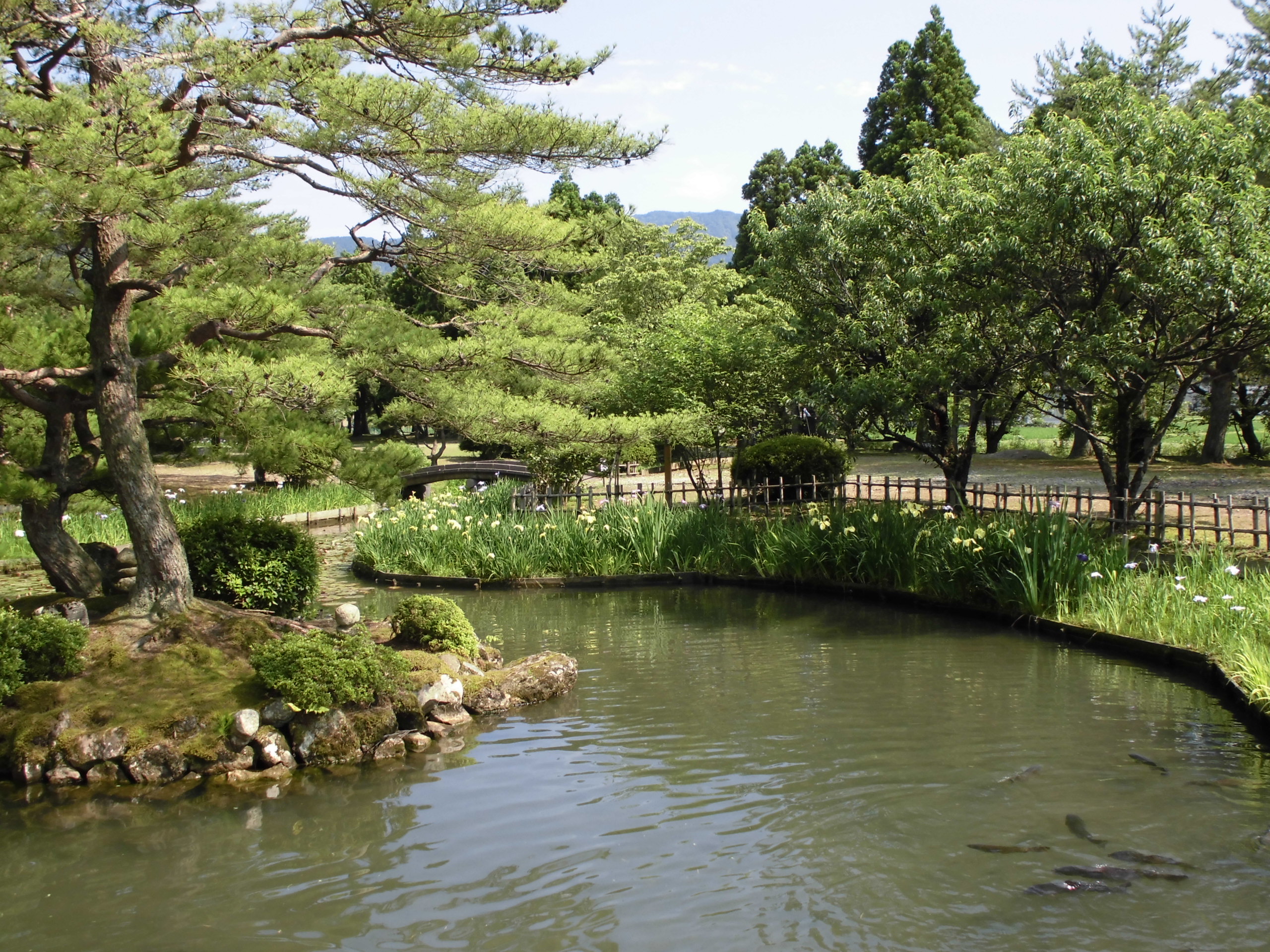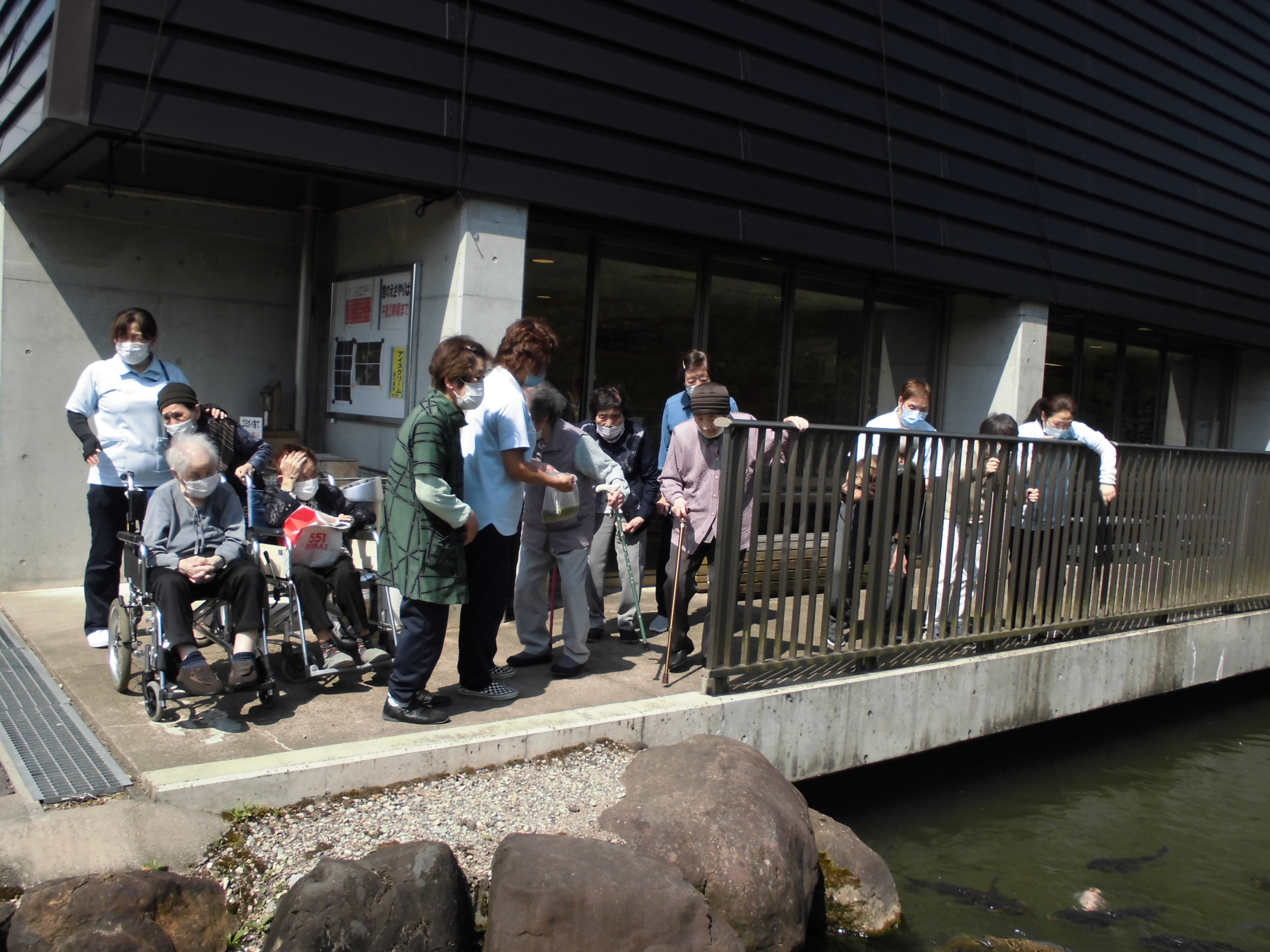 池の鯉に餌をあげたり、小川沿いの菖蒲を見て回りました。