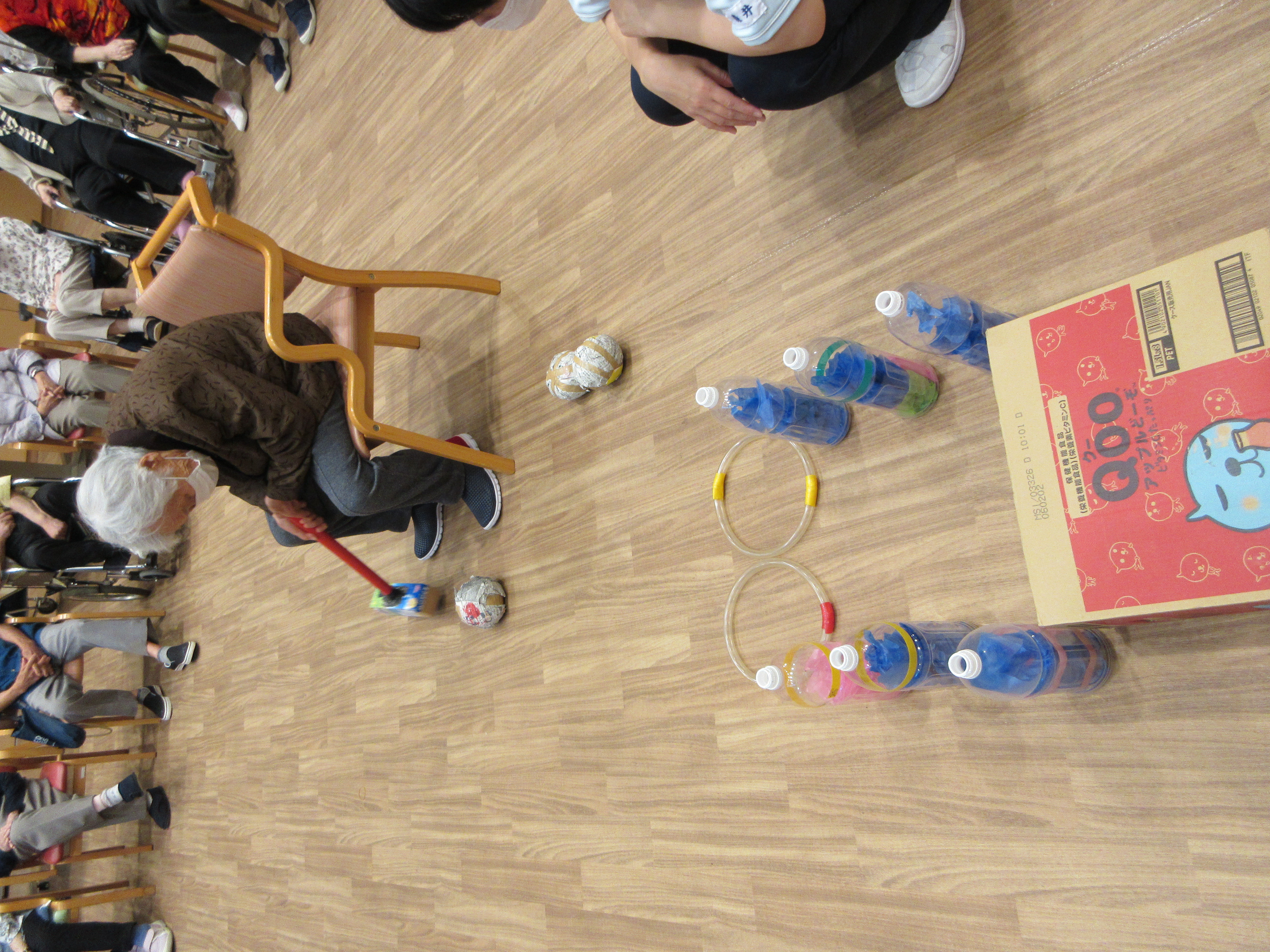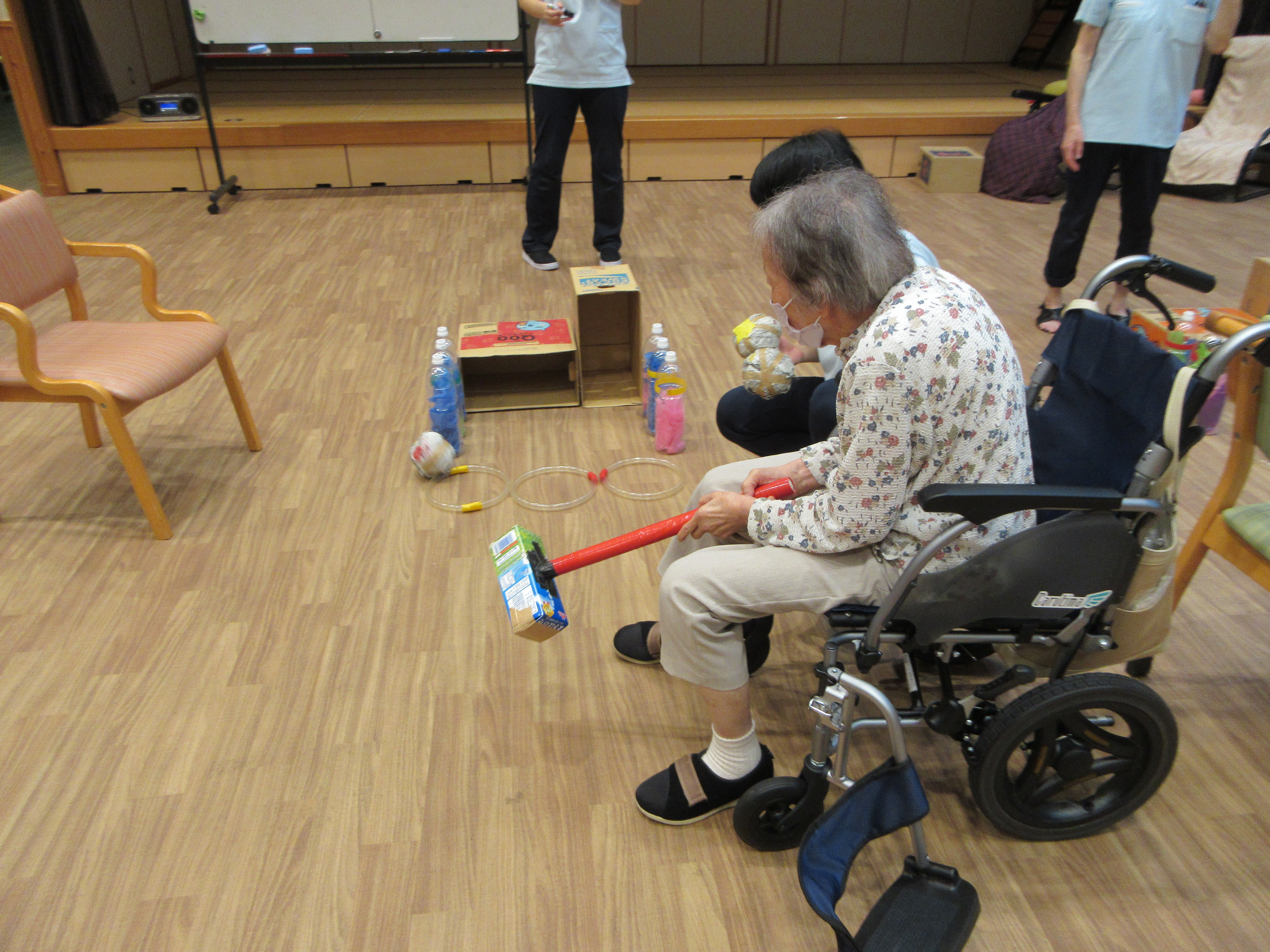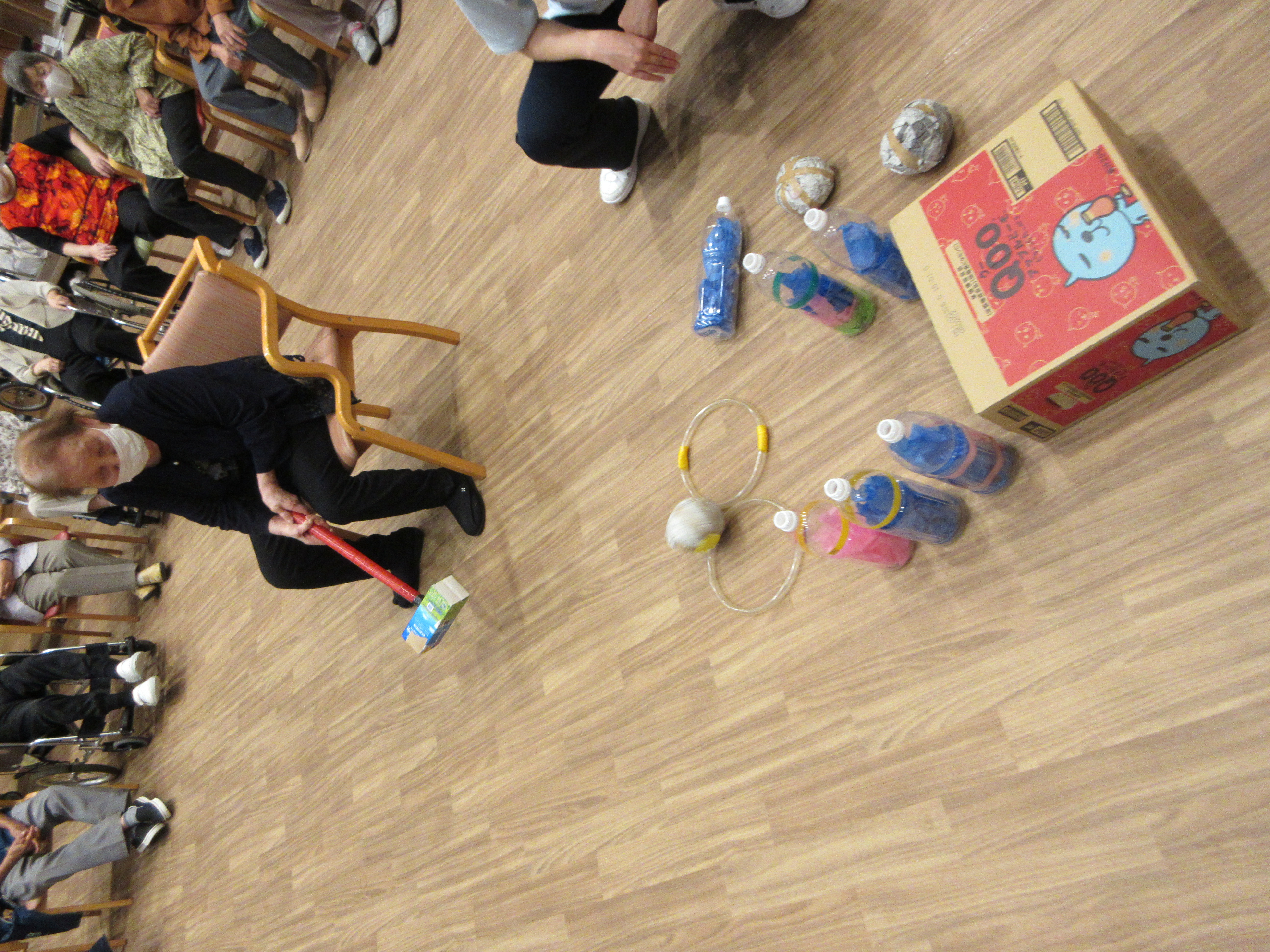 牛乳パックで作ったクラブを握り、ゴールの箱を狙って