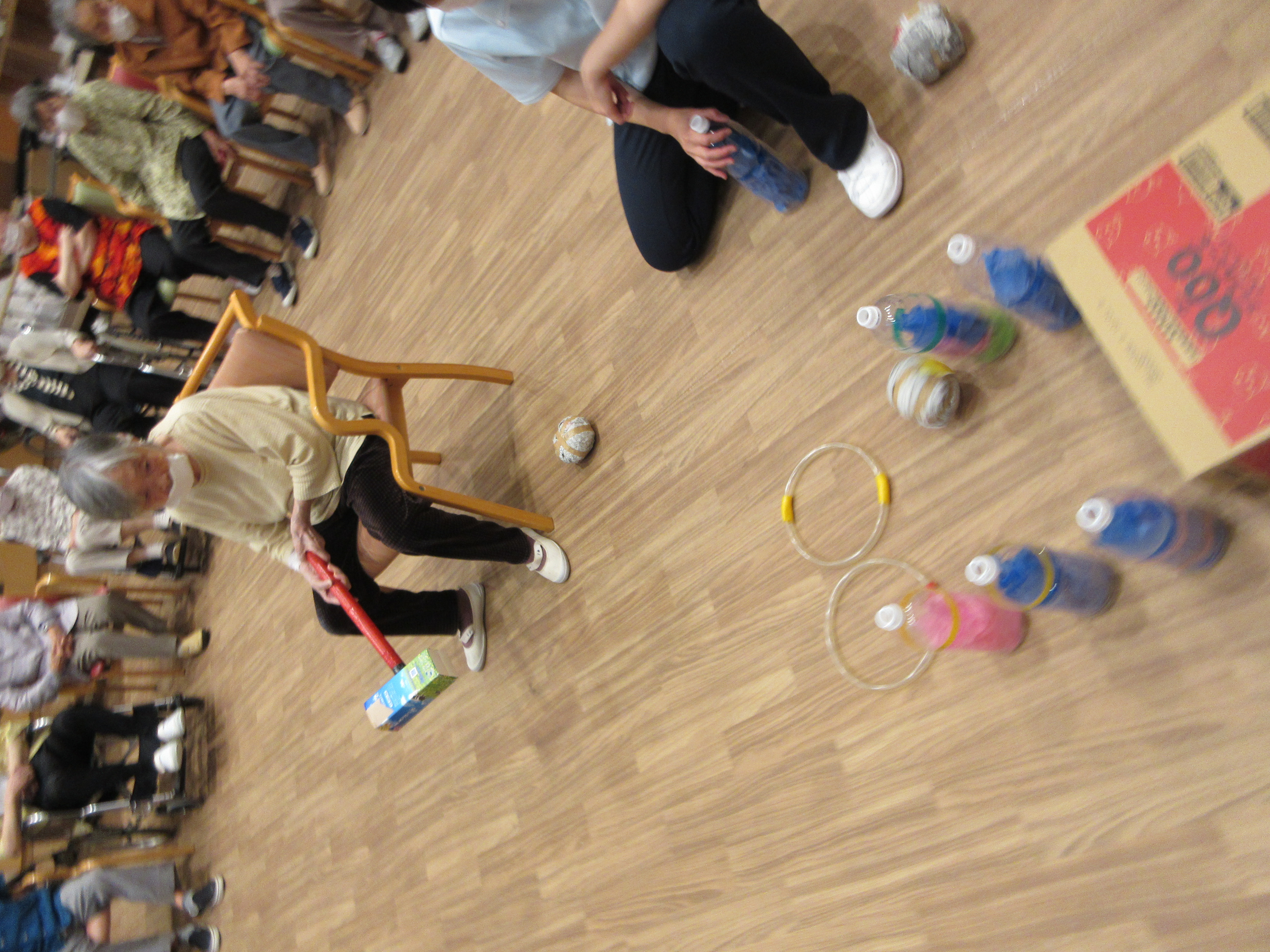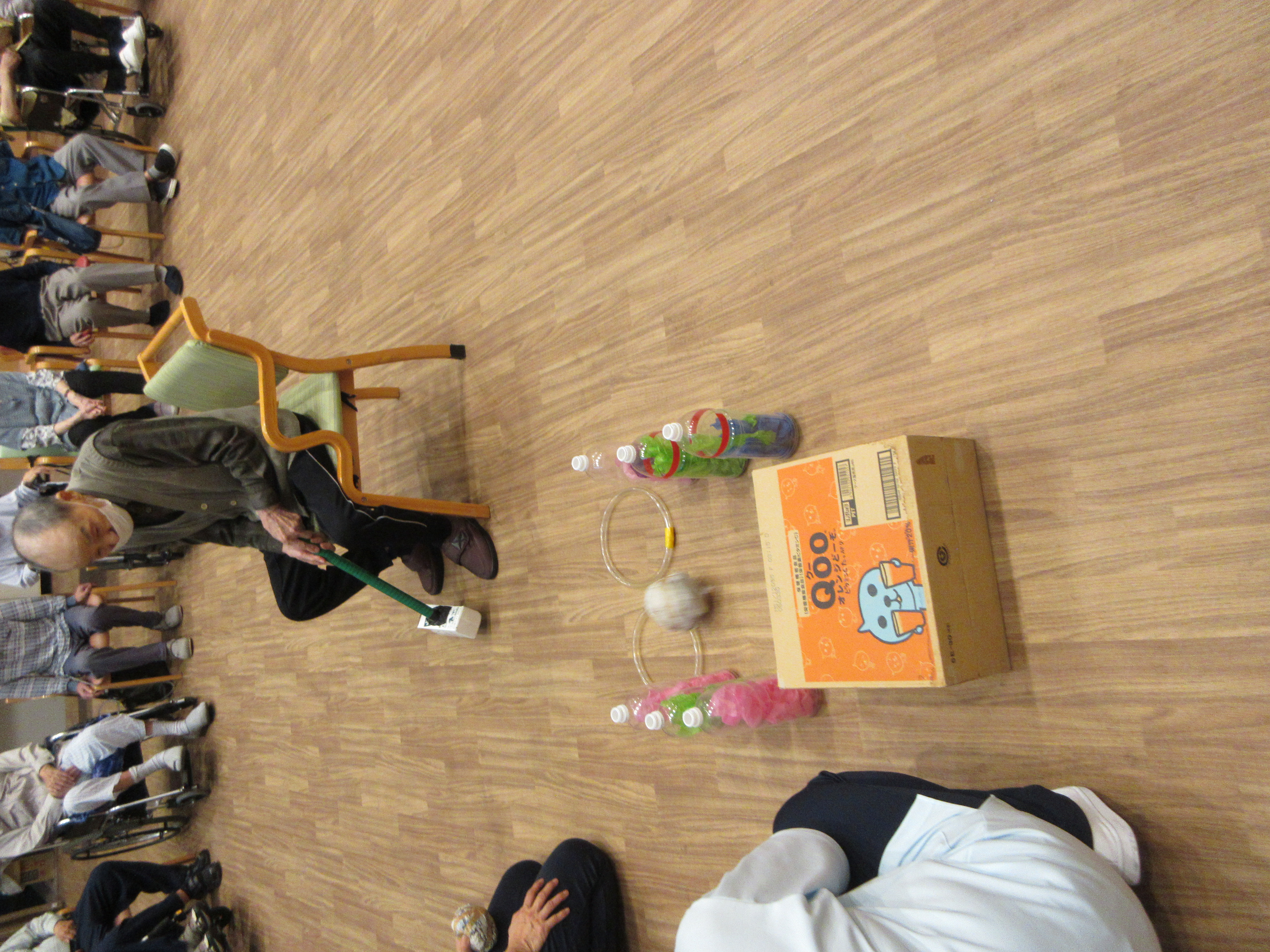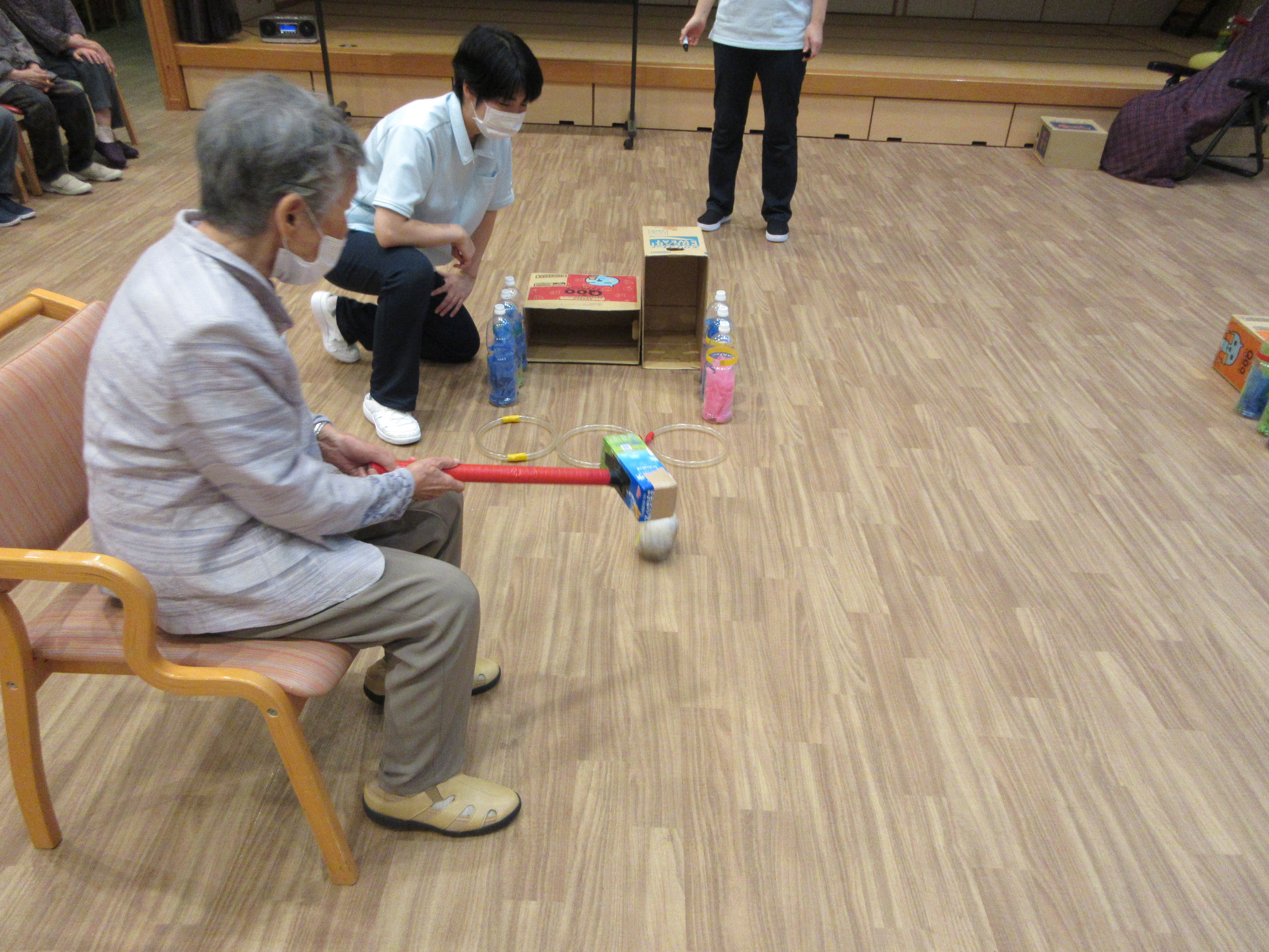 牛乳パックで作ったクラブを握り、ゴールの箱を狙って
