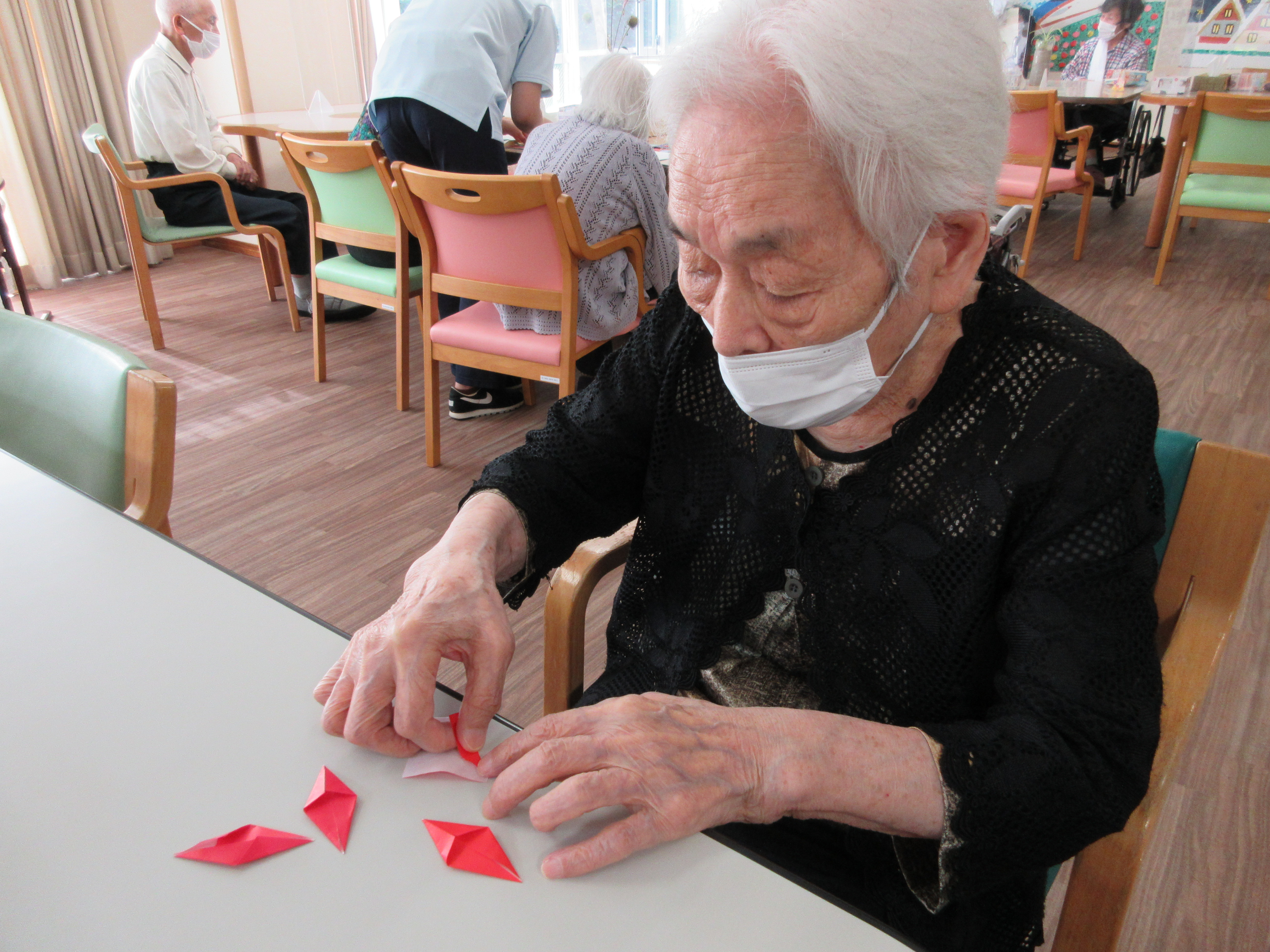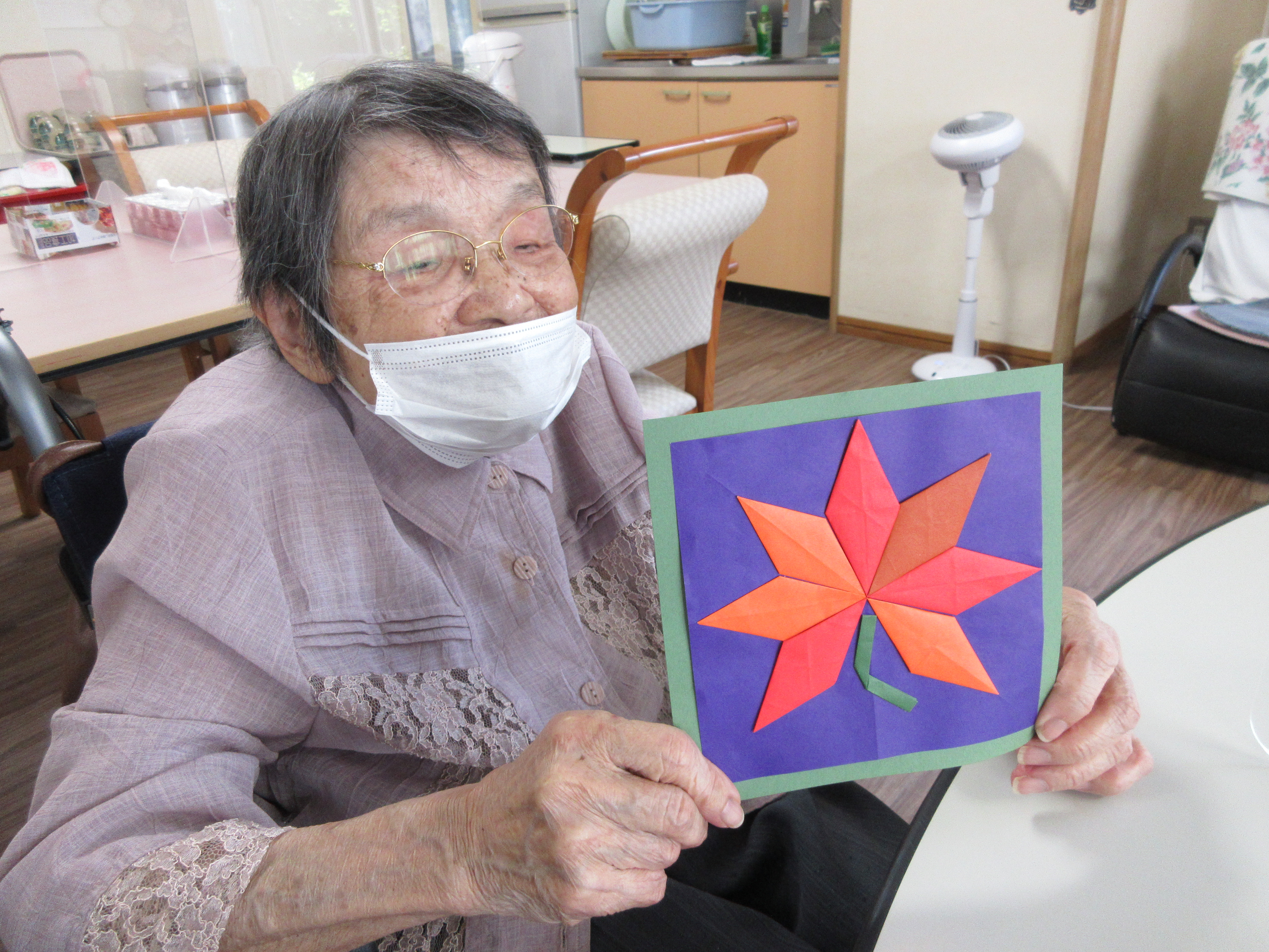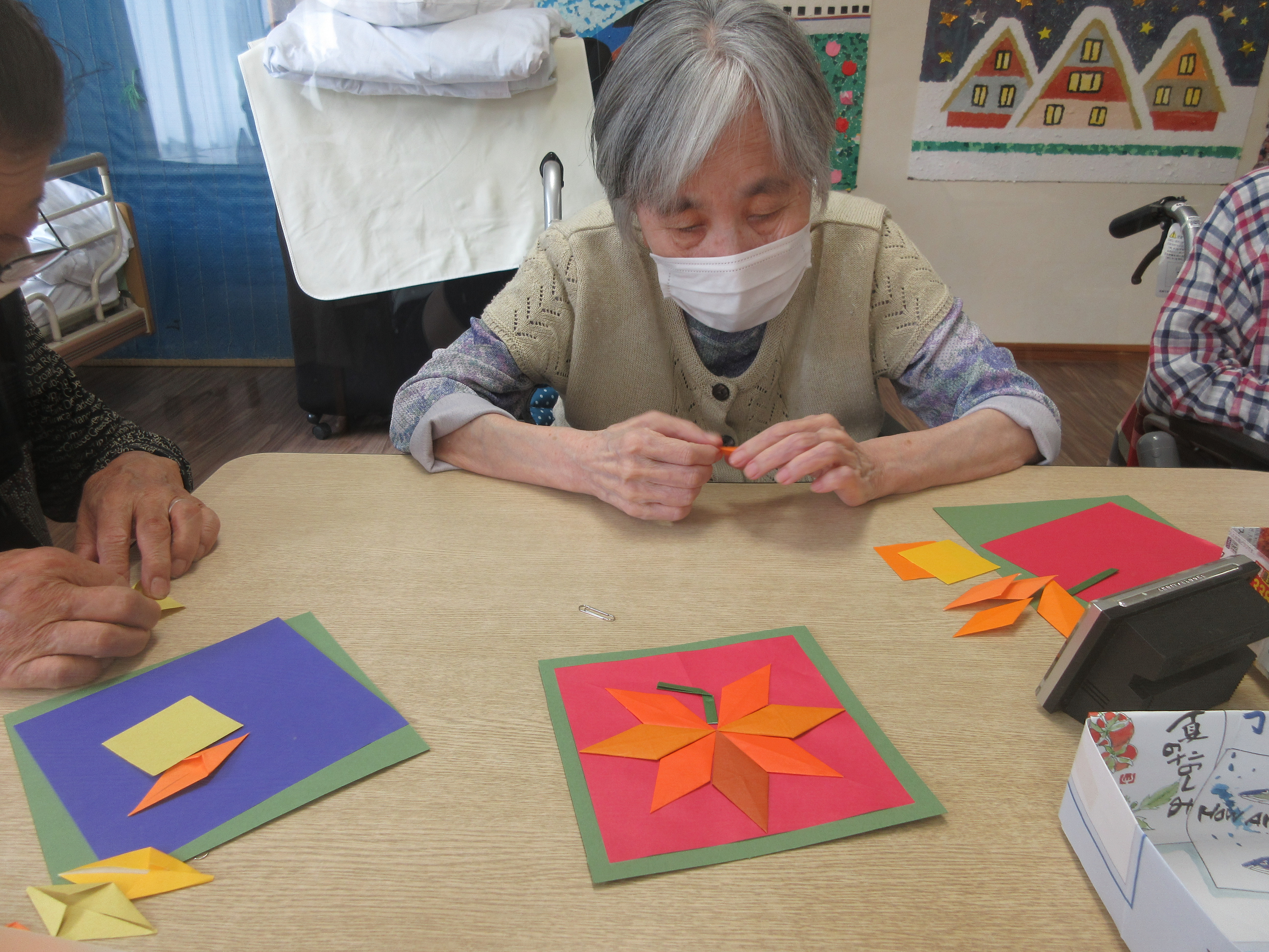 折り紙でもみじの葉を折り、台紙に貼り合わせました!
