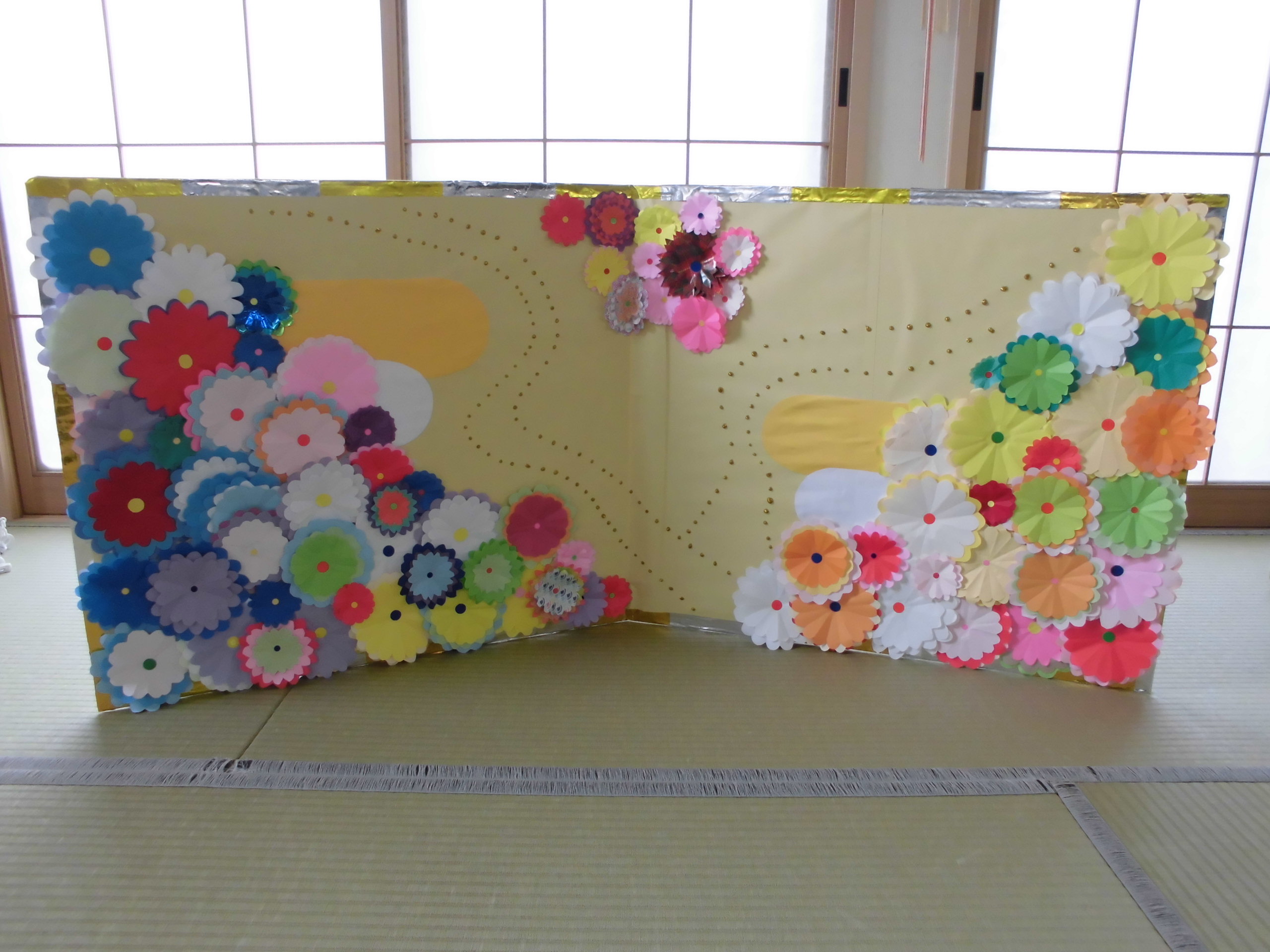 菊の花を沢山作り、屛風に飾り付けてみました。