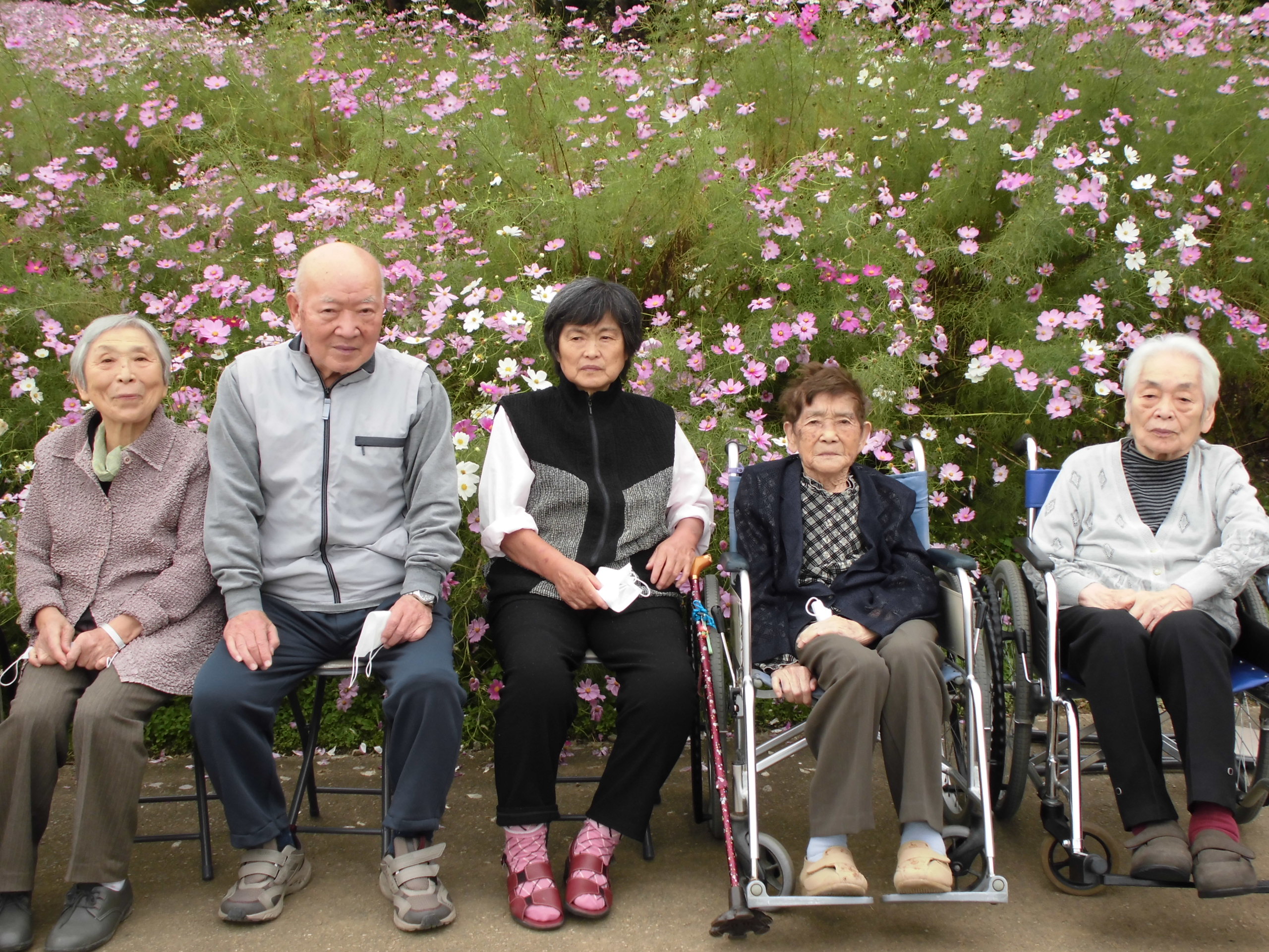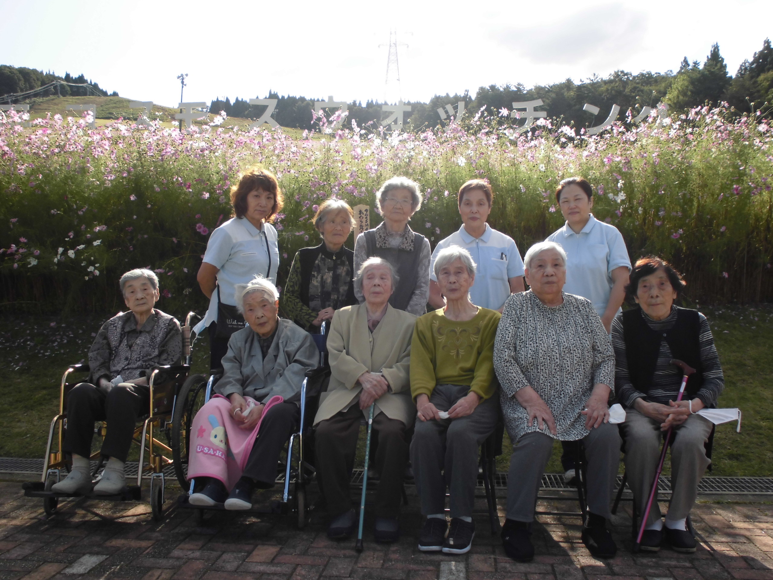 秋晴れの日、コスモス畑へ今日も向いました。「最近出かけていないね~。どこか行きたいわ!」との声に応え、車椅子、イス、飴とを持参して職員は汗だくです(;^_^A