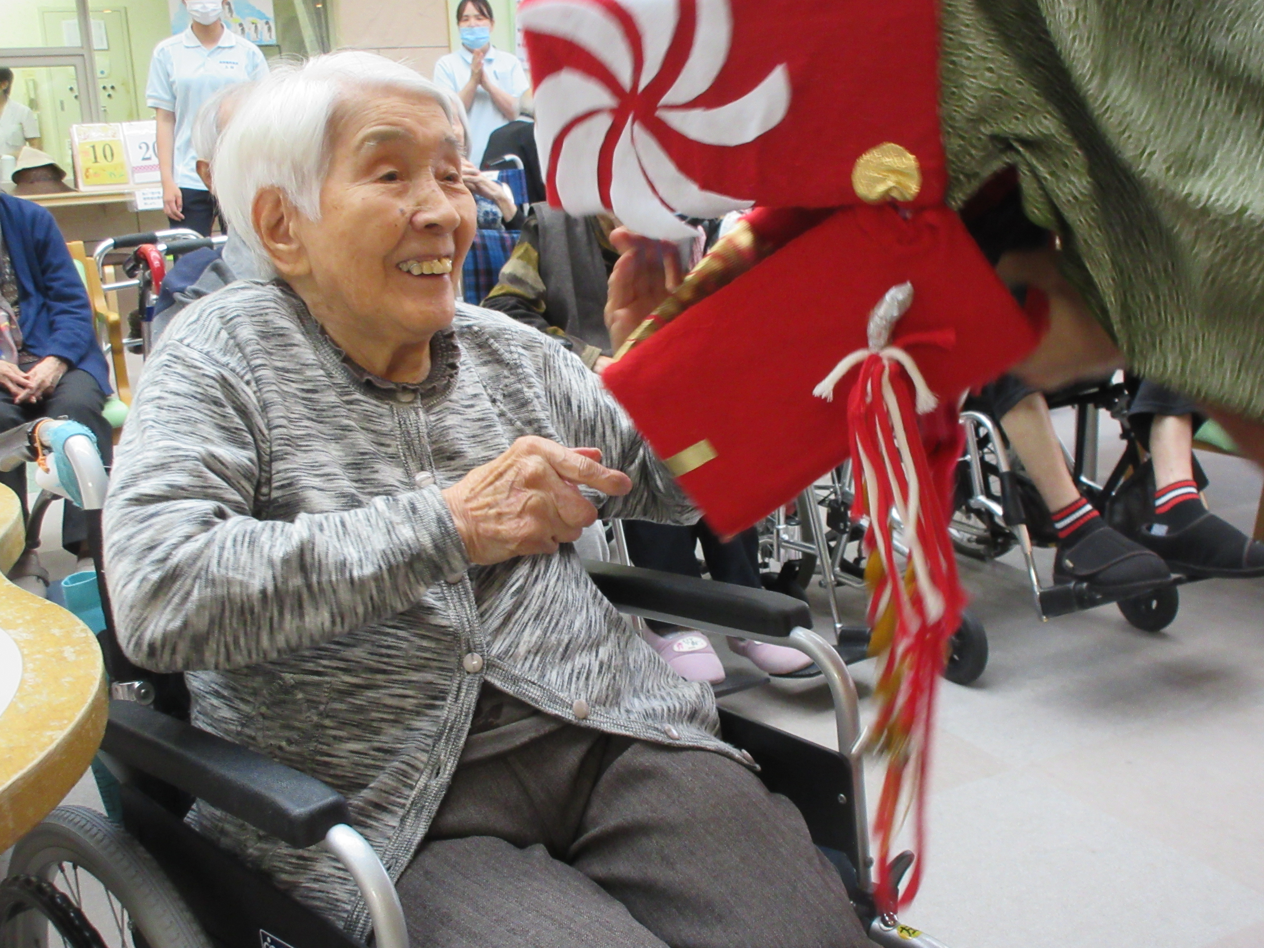 職員からの色紙や記念品、獅子舞のプレゼントに素敵な笑顔で応えてくださいました。