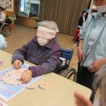 目隠しをして、職員が「もっと上です!」など声をかけ、上手におかめやひょっとこの顔を作っておられました。