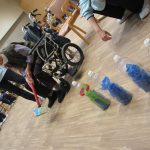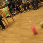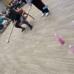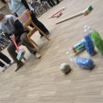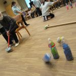 牛乳パックとマルチシートの芯を使ったクラブと新聞紙で作ったいびつなボールを使ってやります。