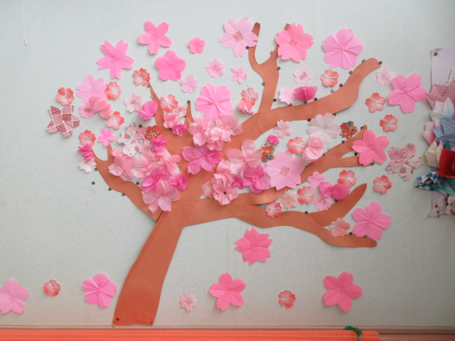 "おはな紙”で小さなお花を作り、壁面に桜の木を装飾しました。