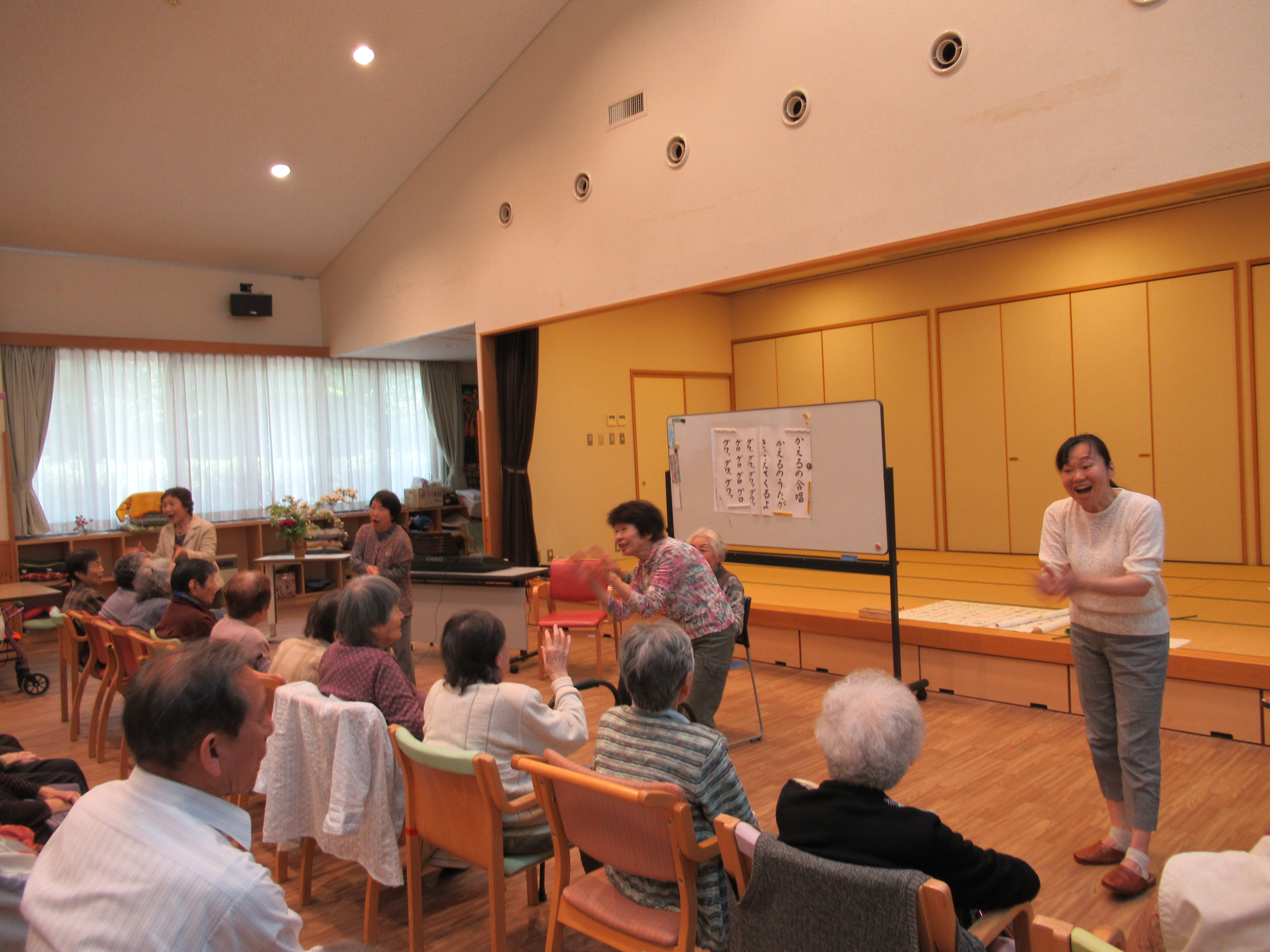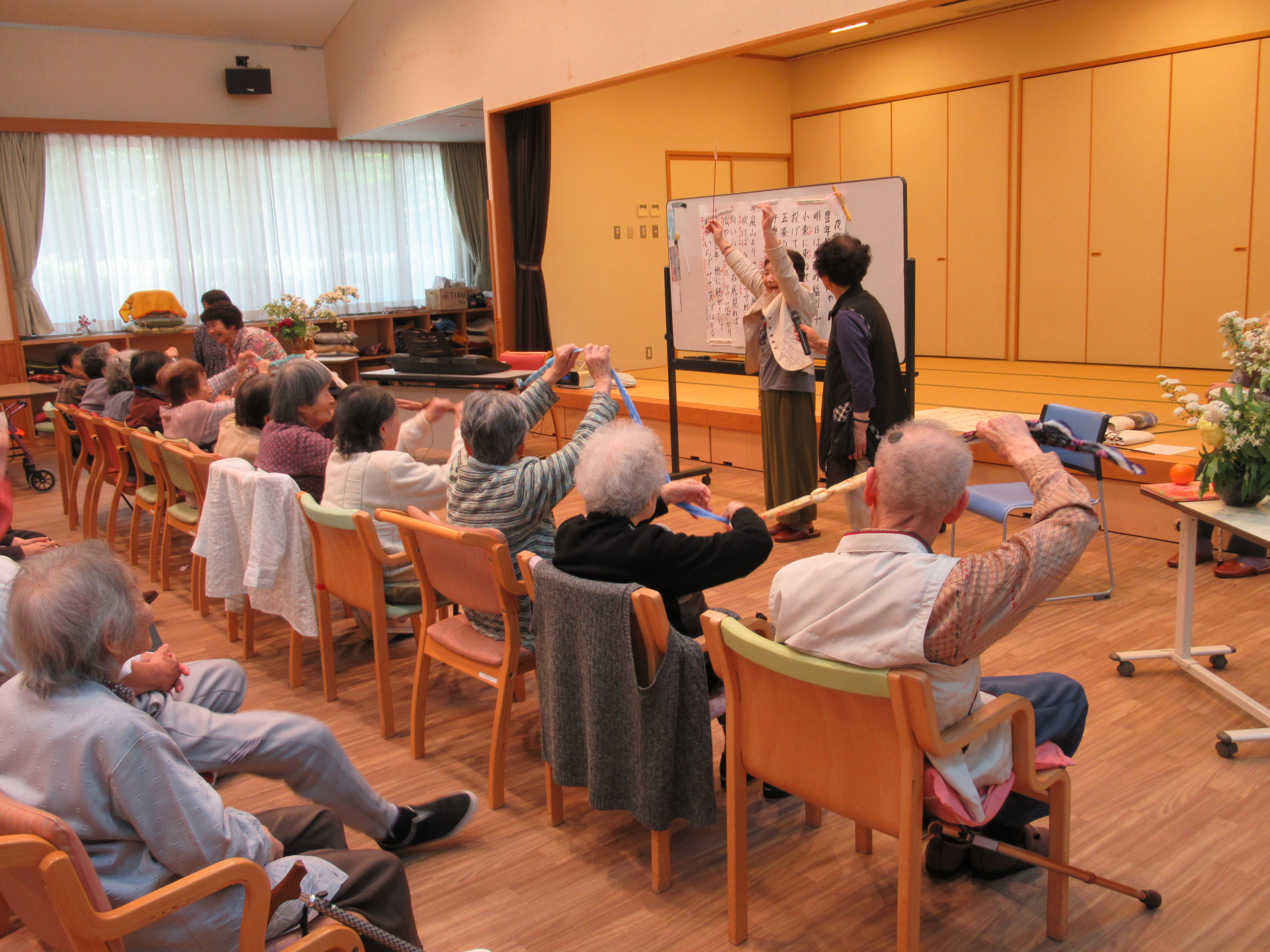 いよいよ庄川観光祭も近づいているということで、『夜高節』を歌いました。とっぺ行燈を実際に持って来てくださったり、夜高代わりに利用者の皆さんで長い紐を持ち、歌の「ヨイヤサーヨイヤサー!」の掛け声に合わせて持ち上げたりとより雰囲気を感じることができました。