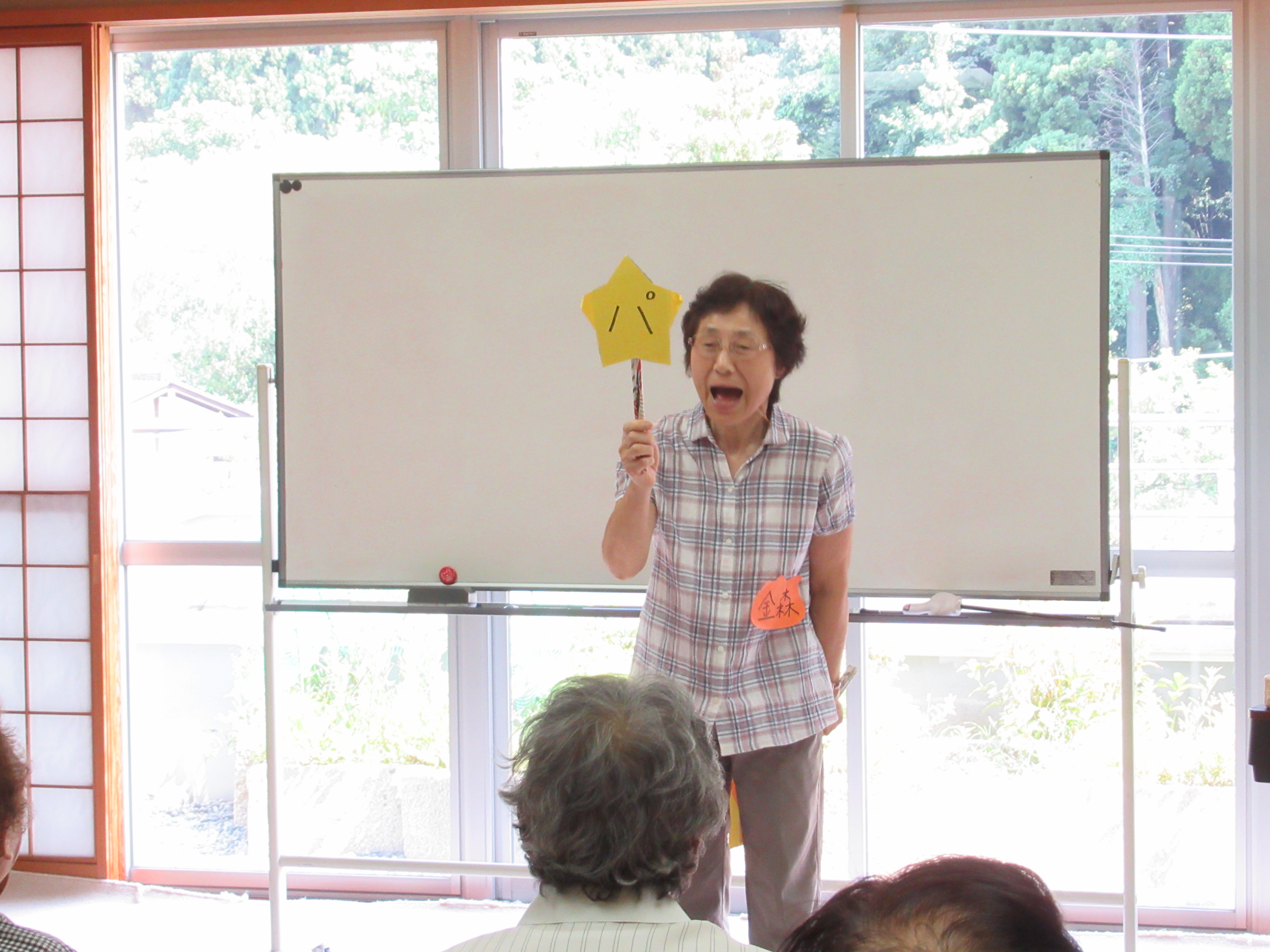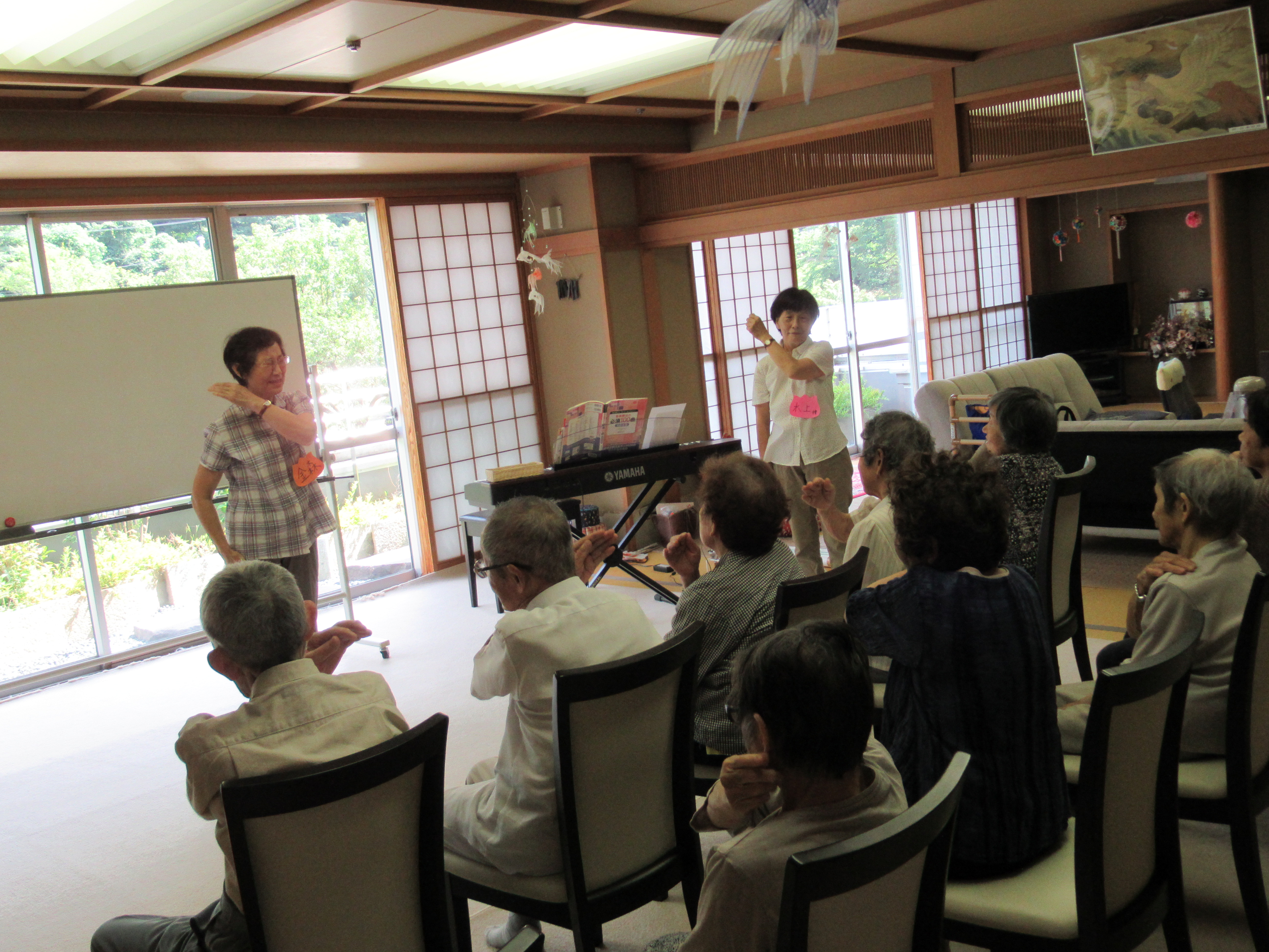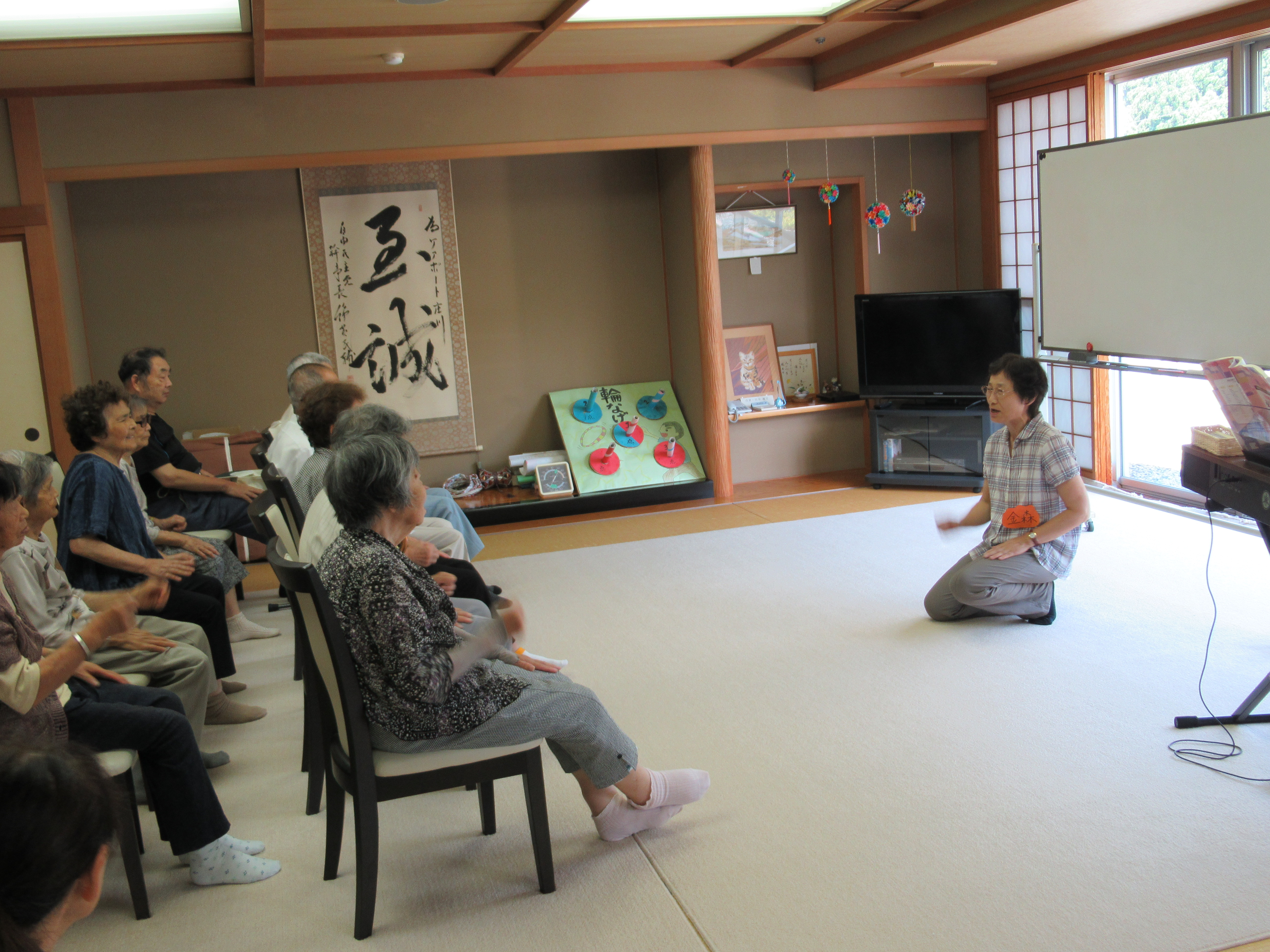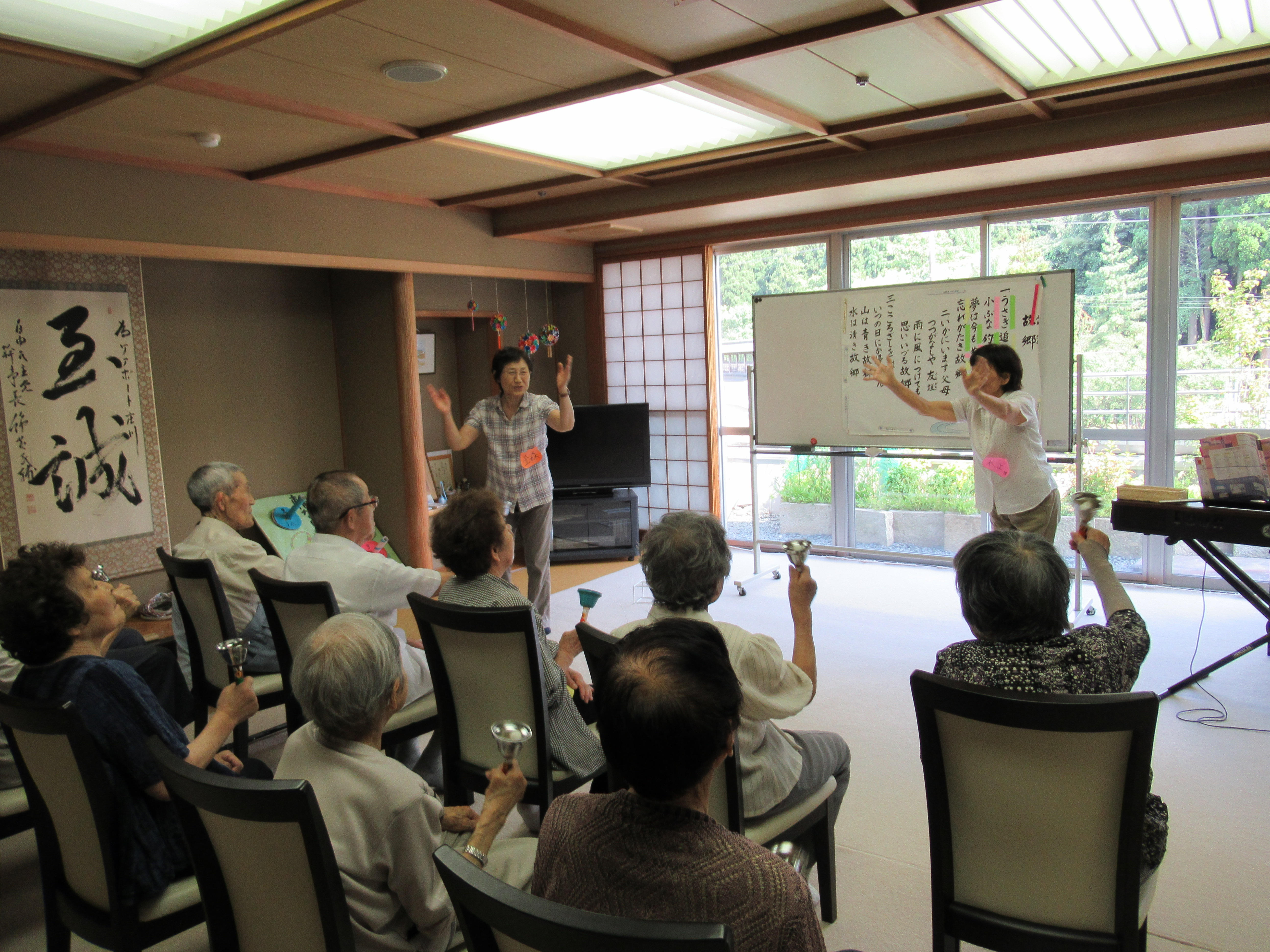 今回はハンドベルを使って和音の合奏をしました。3グループに分かれて『ふるさと』を演奏しました。利用者の皆さんは「私らあの赤い印してあるところだけ鳴らせばいいがや。」「そこはあんたらやよ。」と利用者さん同士で声を掛け合うチームワークの良さもあり、とても素敵なハーモニーとなりました。