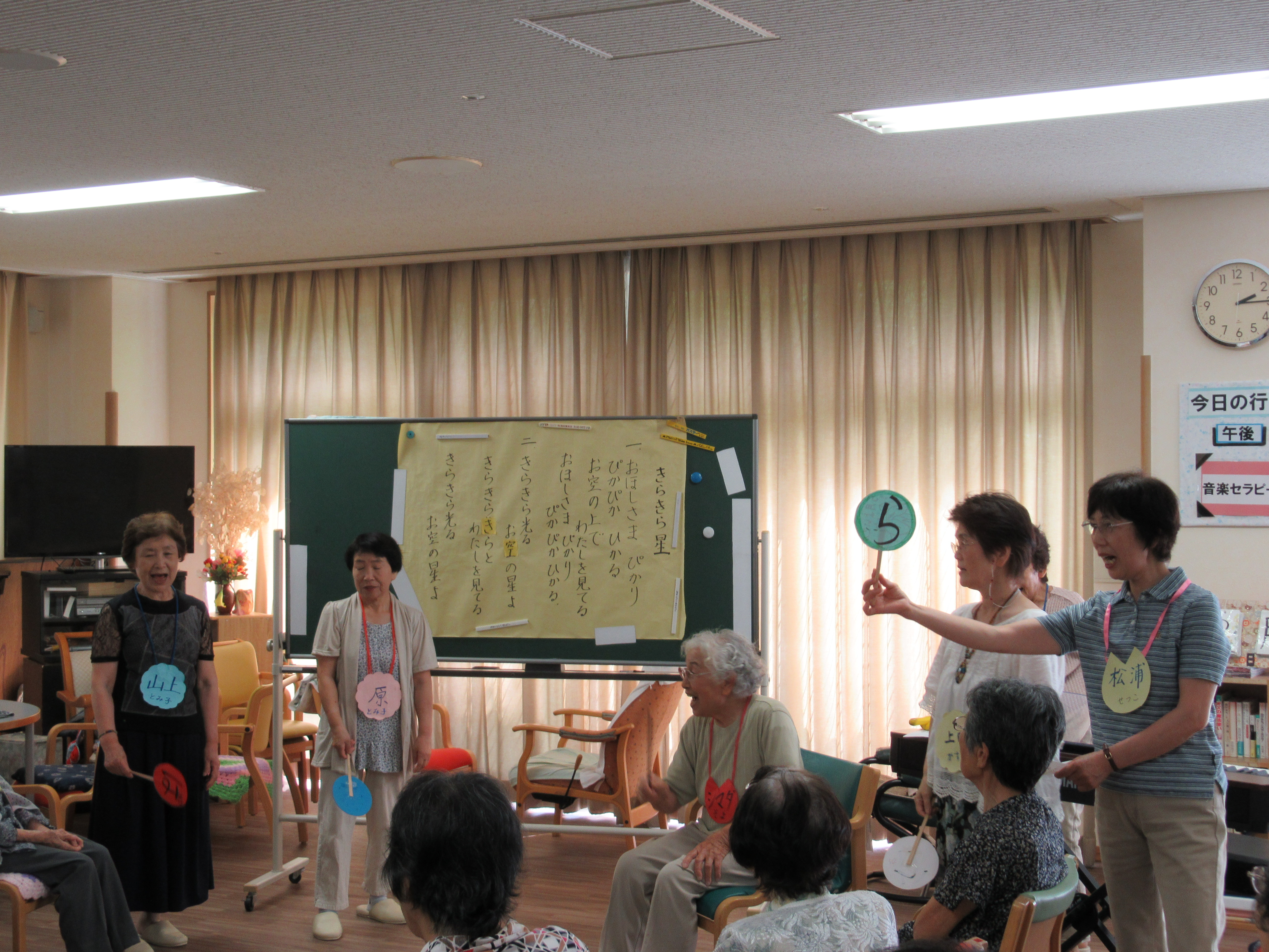 『ドレミの歌』では利用者の皆さんがドレミの札を持って歌いながら自分の音の時に上げるという、少し難しい作業ではありましたが、脳トレにもなっていました。