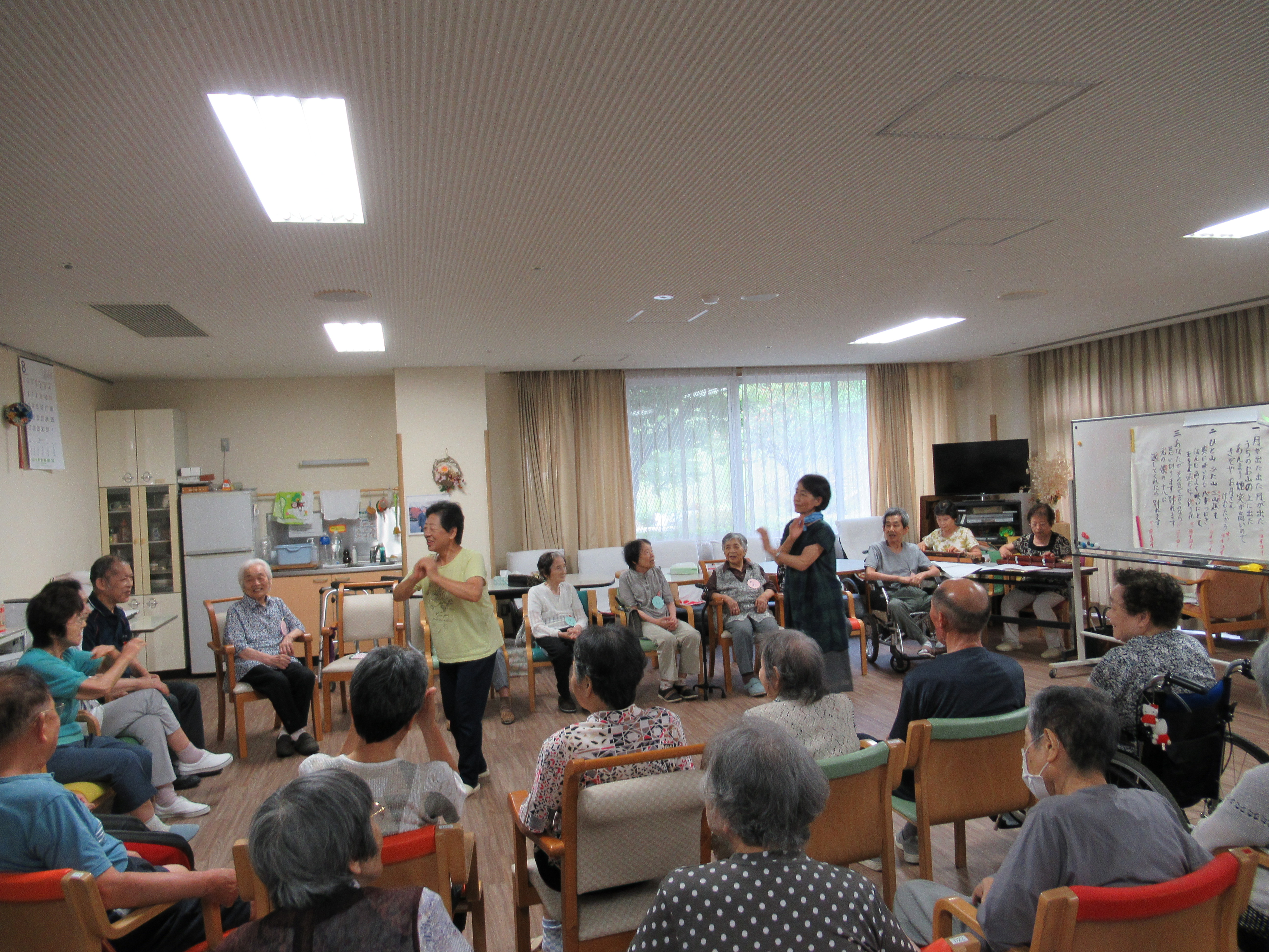 最近では火星が話題になっていることなどの話から『月』出た出た月が~♪→『炭坑節』月が出た出た~♪に続き、踊りの先生に教わりながら大正琴の演奏に合わせて踊りました。