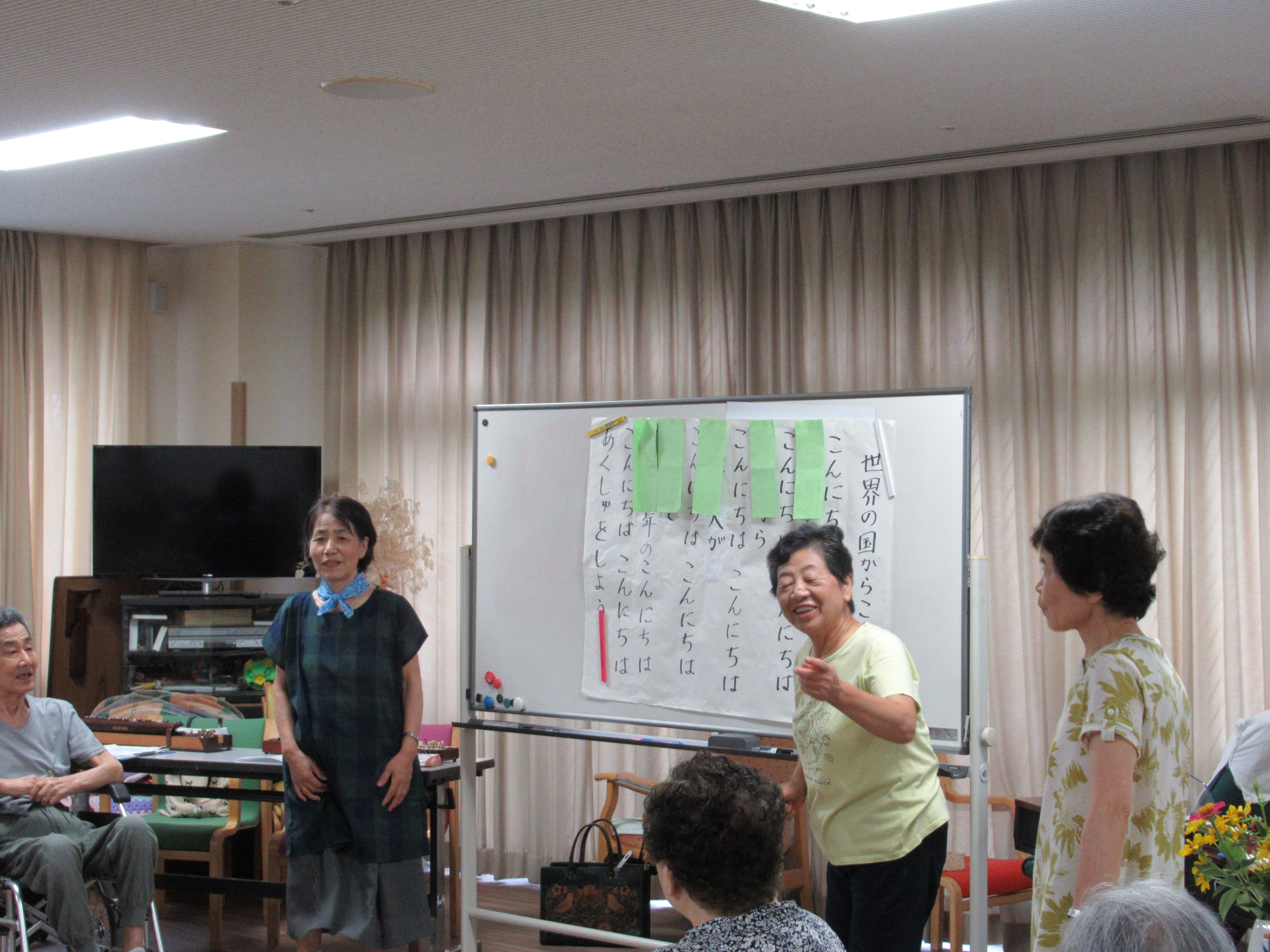 『世界の国からこんにちは』では、先月デイサービスでも行なった歌詞クイズをしましたが、皆さんちゃんと歌詞を隠されても答えておられました。
