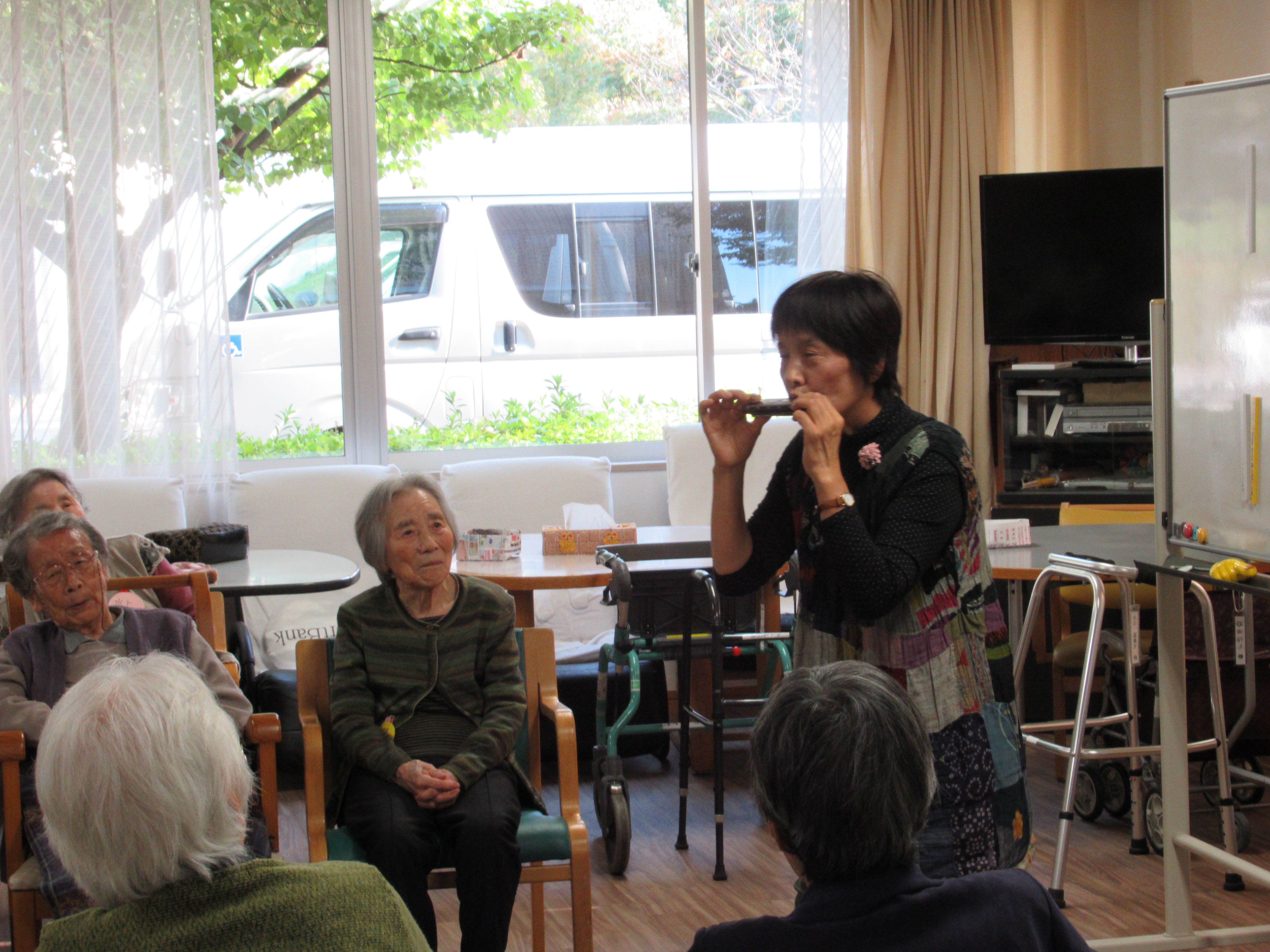 「何の曲でしょう?」懐かしいハーモニカから流れるメロディーを聞いて、『かたつむり』や『ほたる』など自然と皆さんが歌を口ずさまれていました。