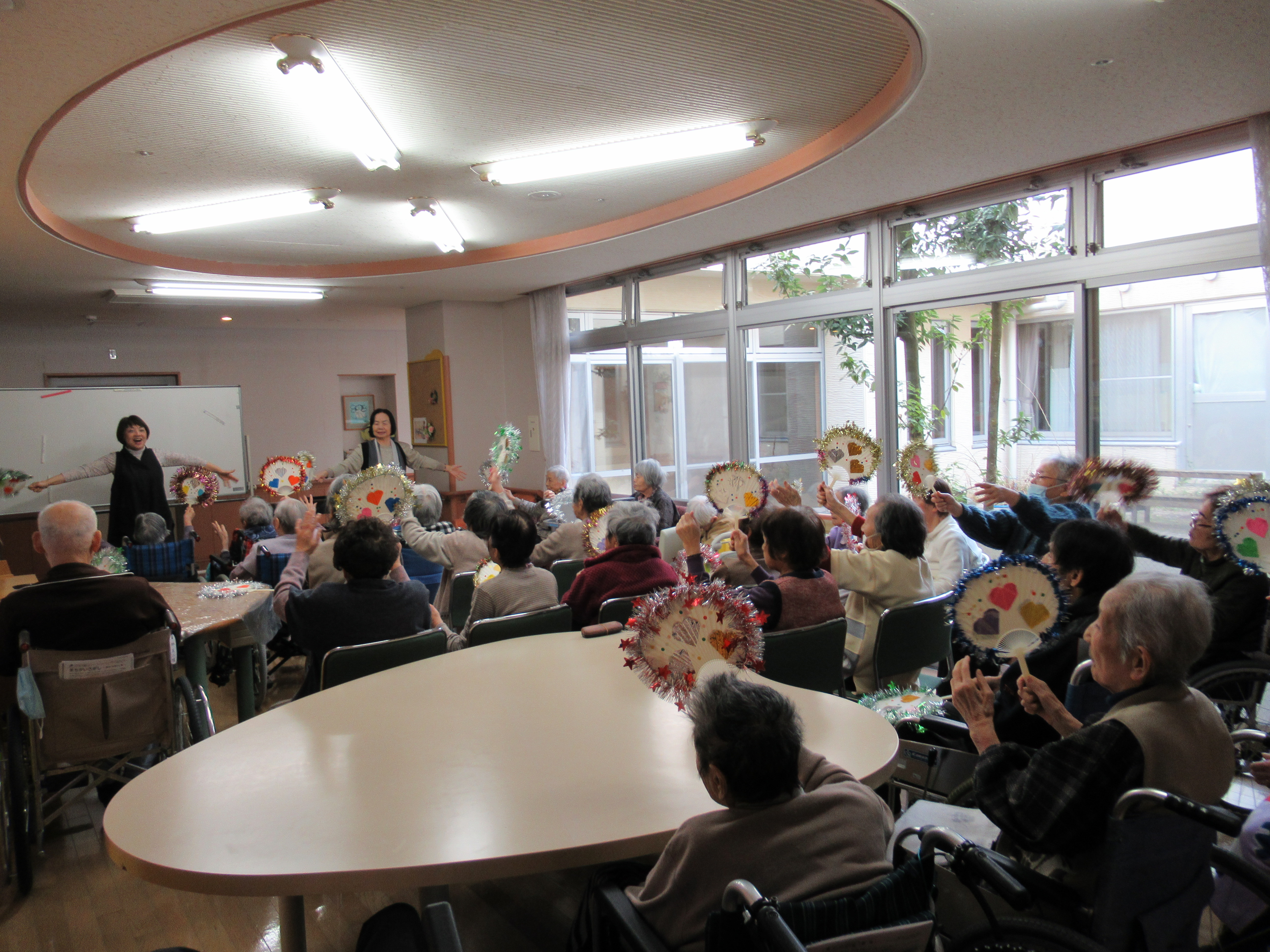 始まりの歌『こんにちは』から始まり、『春よ来い』『春が来た』『うれしいひなまつり』『仰げば尊し』など2月の終わりから3月にかけてよく歌われる季節の歌をお話を交えながら歌いました。昔はこうだった…今はこういう風に変わったなど利用者の皆さんとの会話も弾みました。