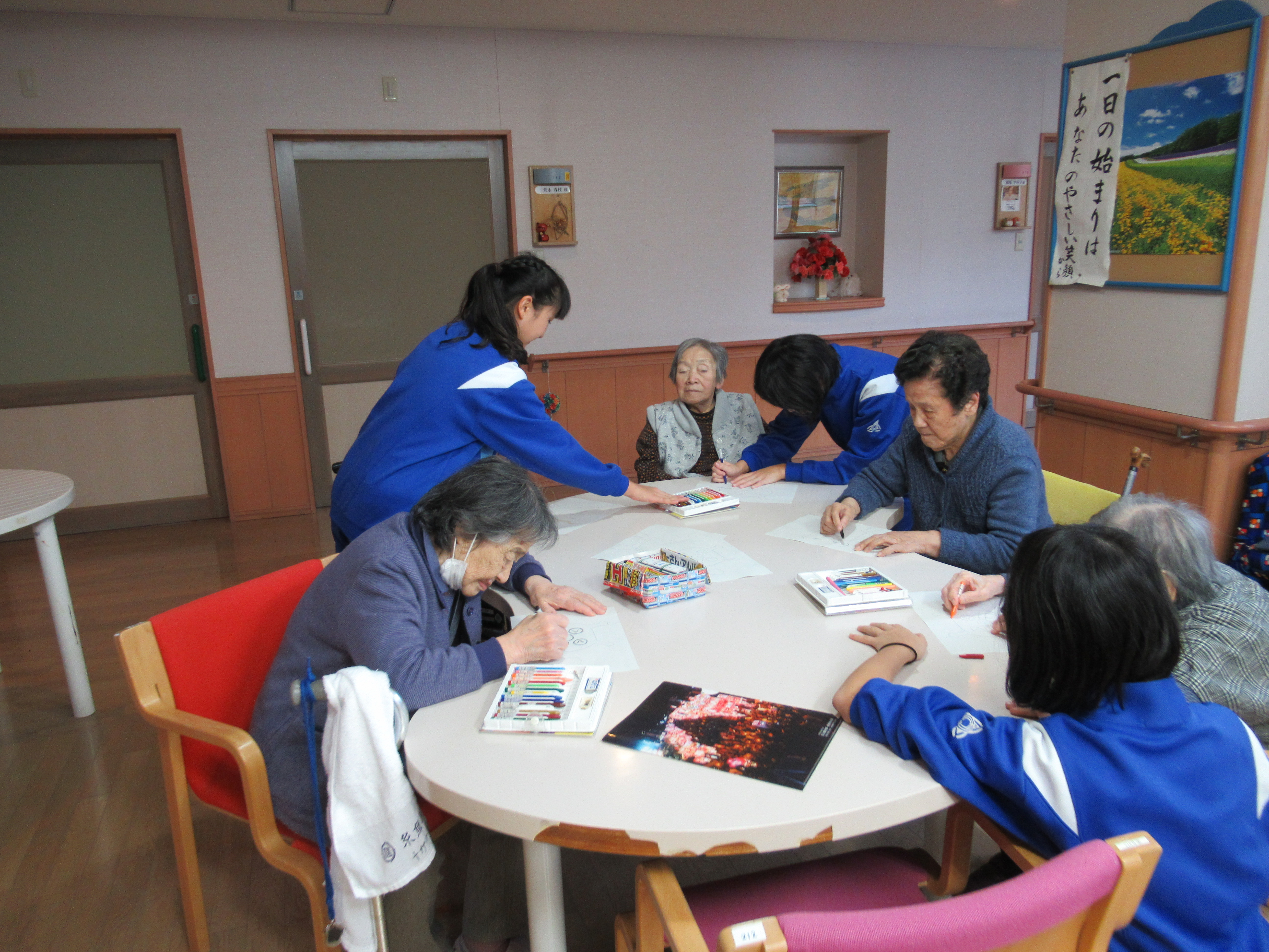 ジェスチャークイズの後には、利用者の皆さんとお話をしながら塗り絵や折り紙をしました。