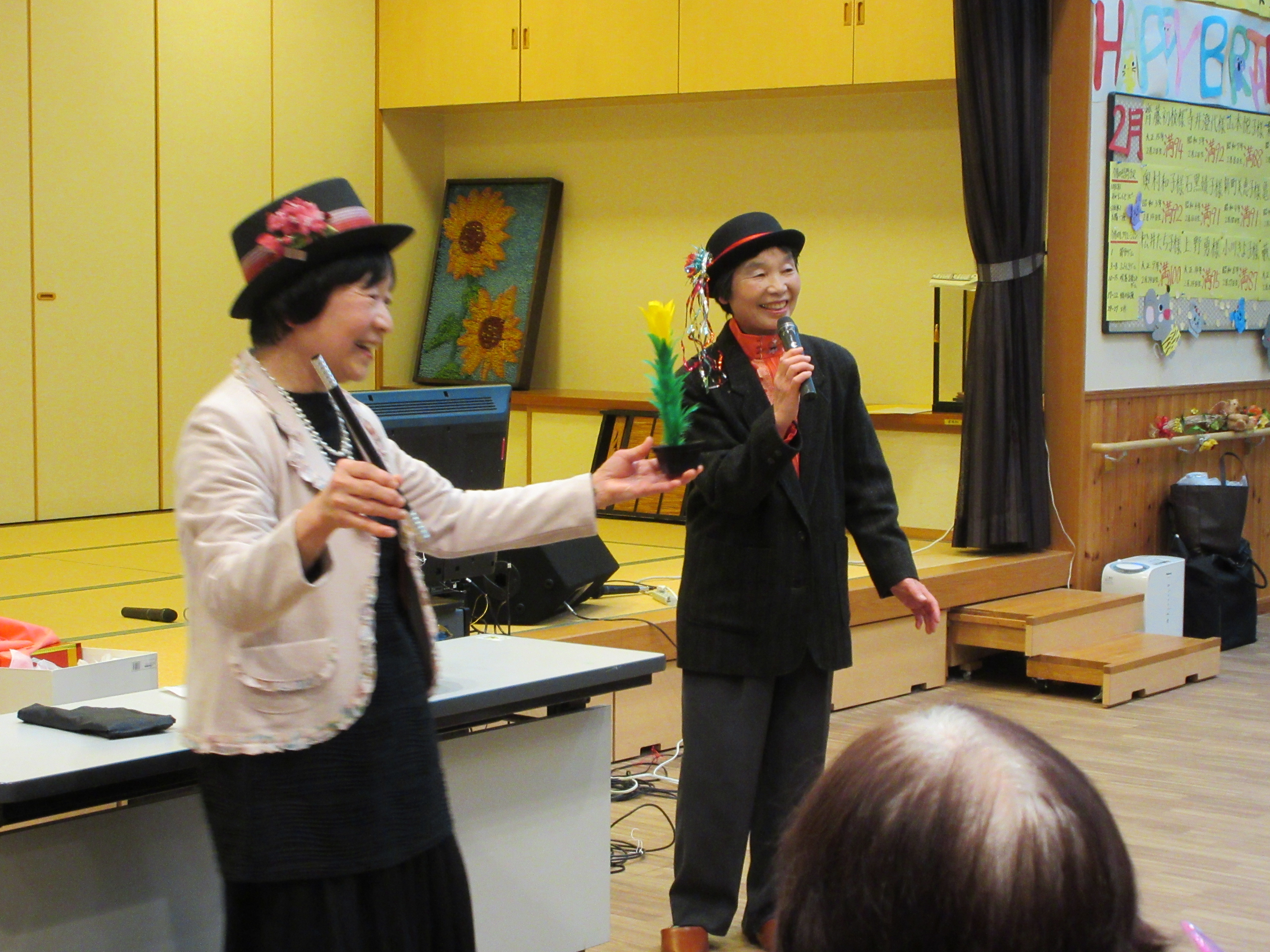 歌や手品に楽しいひと時となりました。お花のプレゼントもいただき、利用者の皆さんも大変喜ばれていました。