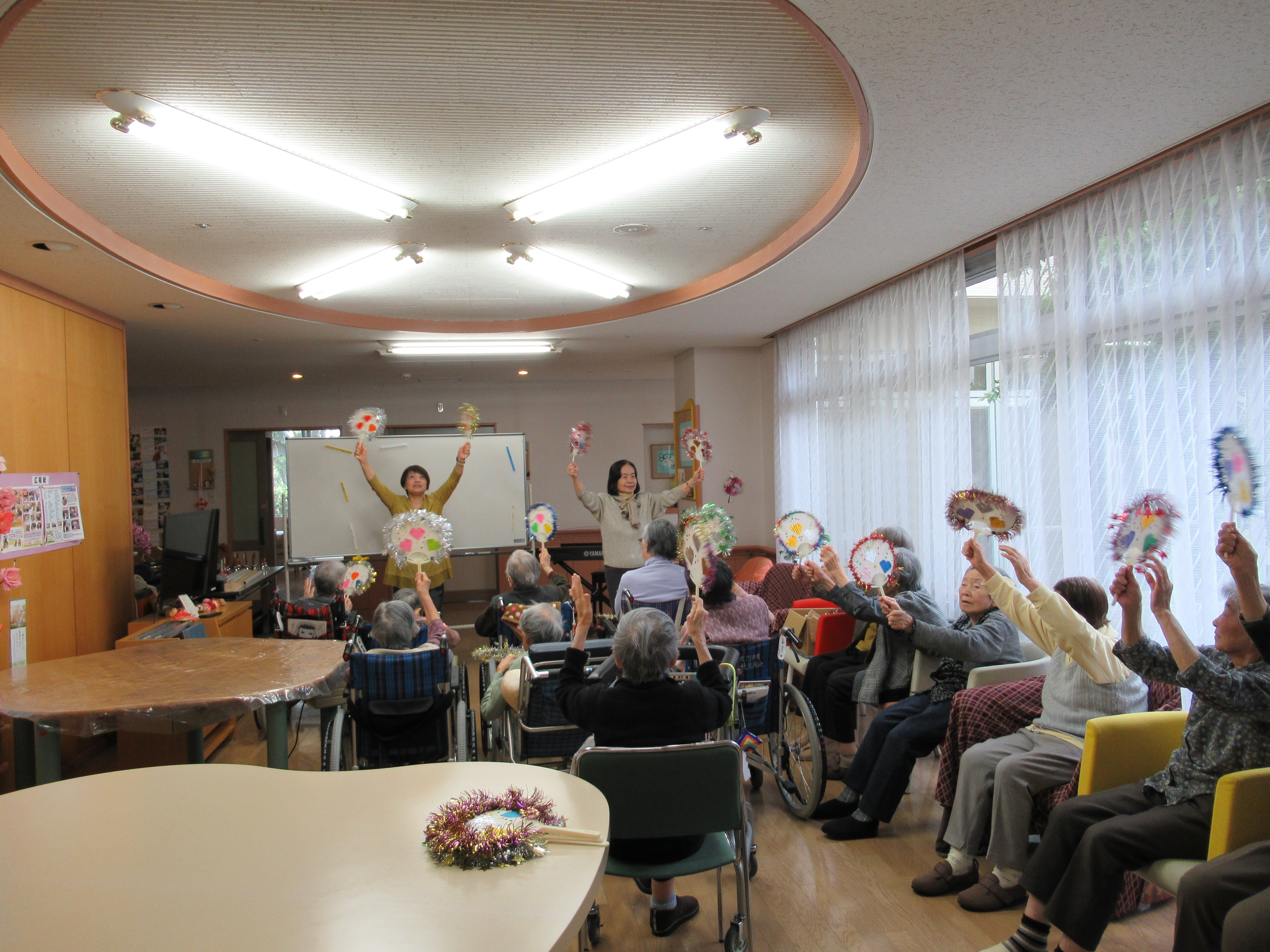 『きよしのズンドコ節』では明るく元気な歌に合わせて、きらきらのうちわを持って体操をしました。利用者の皆さんの手もよく上がっています。