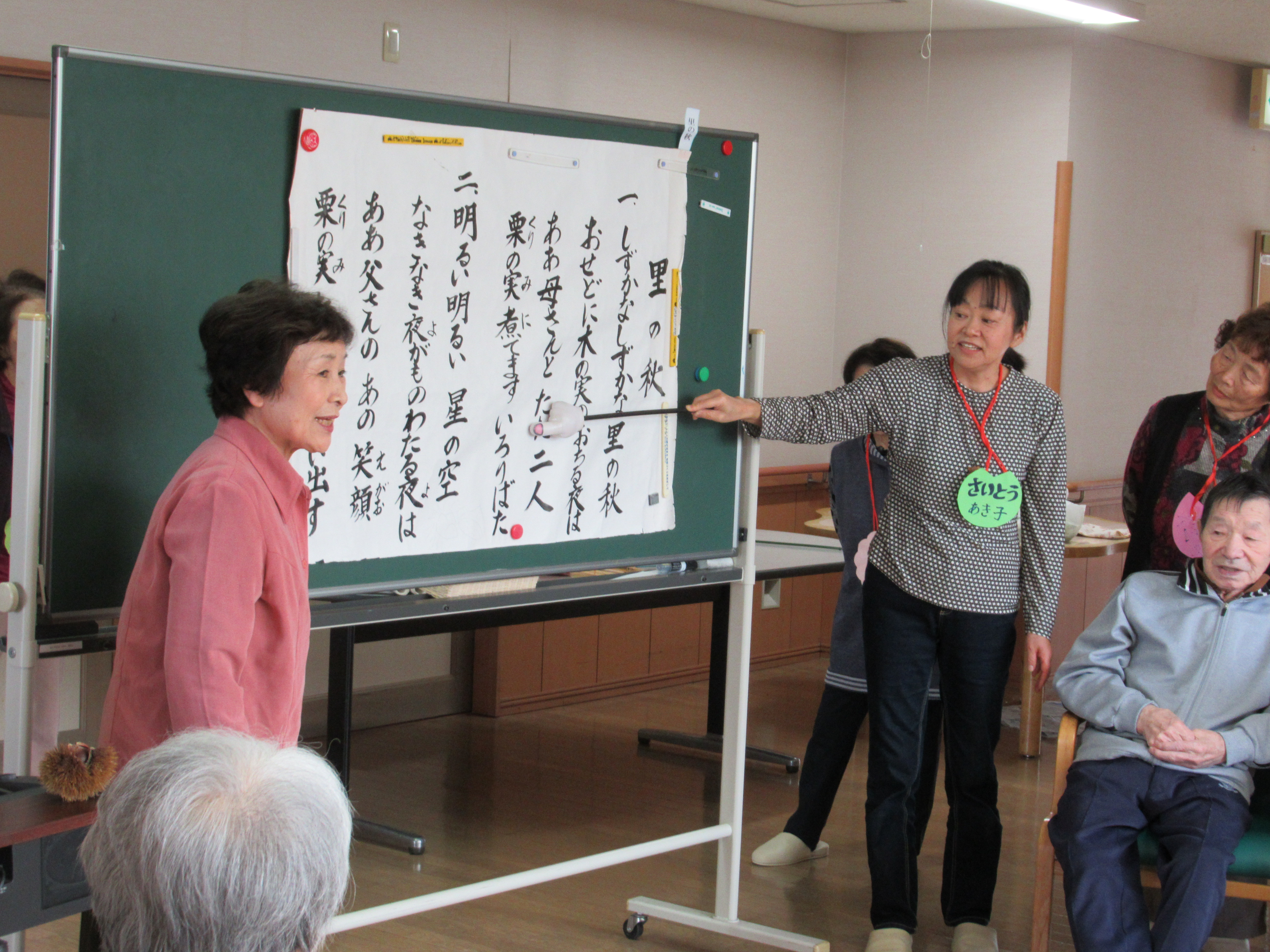 『どんぐりころころ』から始まり、『里の秋』『赤とんぼ』など秋の歌を皆さんで歌いました。