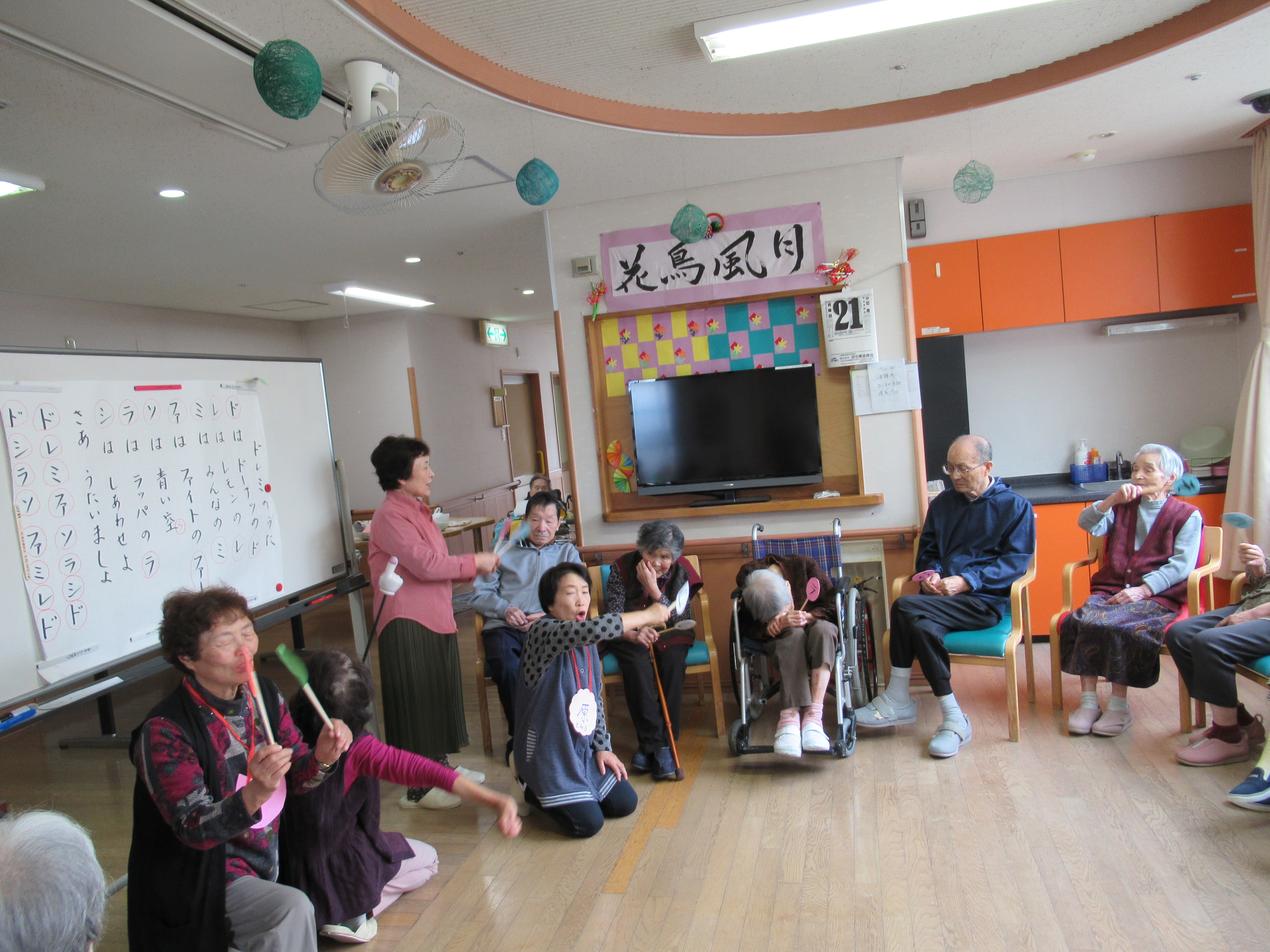 『ドレミの歌』では一人ずつ「ド」「レ」「ミ」…の札を持って自分の音が出てきたら上に出すというものをしました。皆さんの一体感があり、大変盛り上がりました。