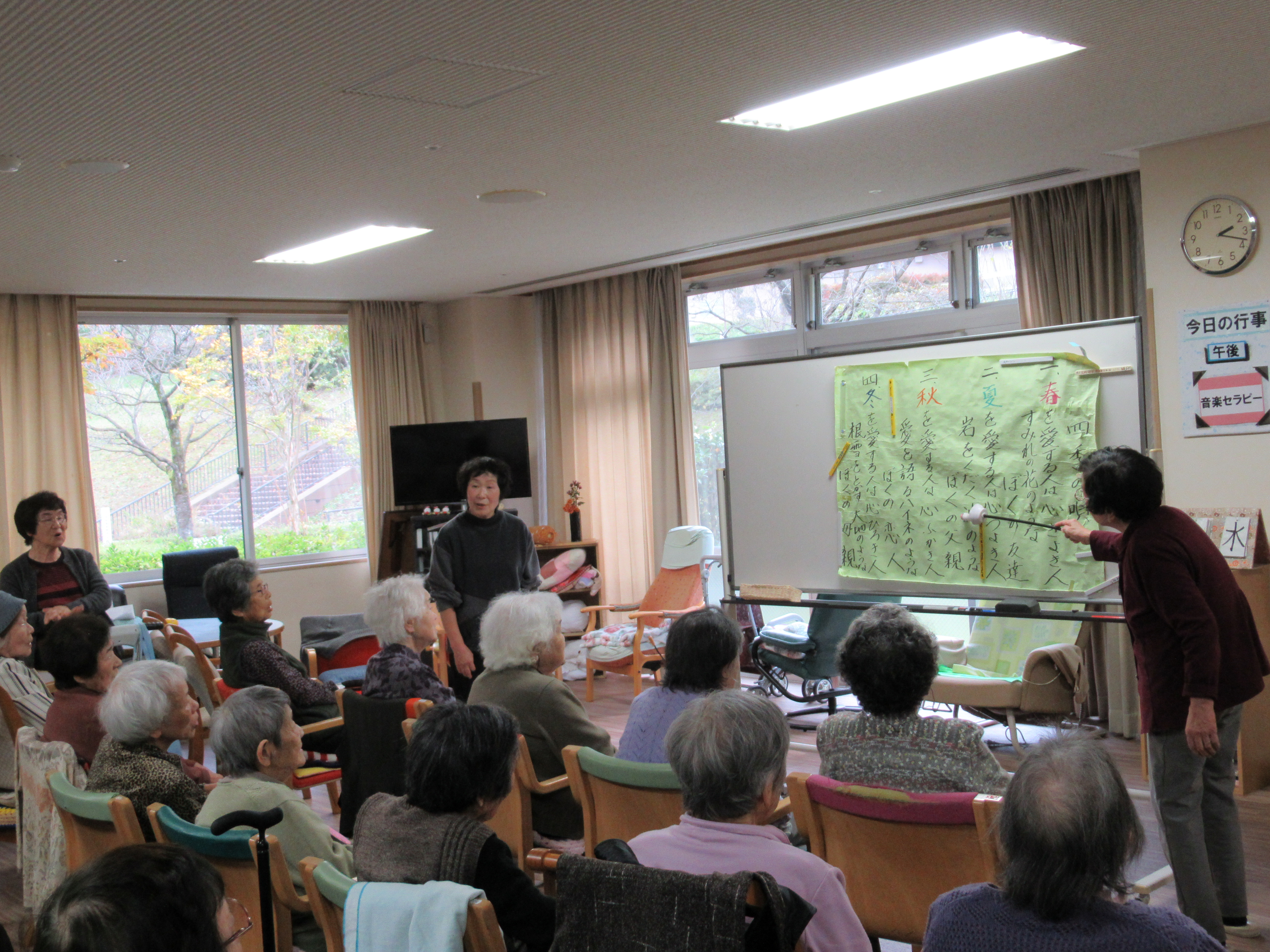 いろいろな歌を歌う中でその歌が作られた頃のことやどのような思いで作られたかなどの話を交えて、利用者の皆さんも「小学4年生ごろだったな」「そんな歌やったがや~」「その頃若かったな~」と会話をしながら和やかな雰囲気の楽しいひと時となりました。