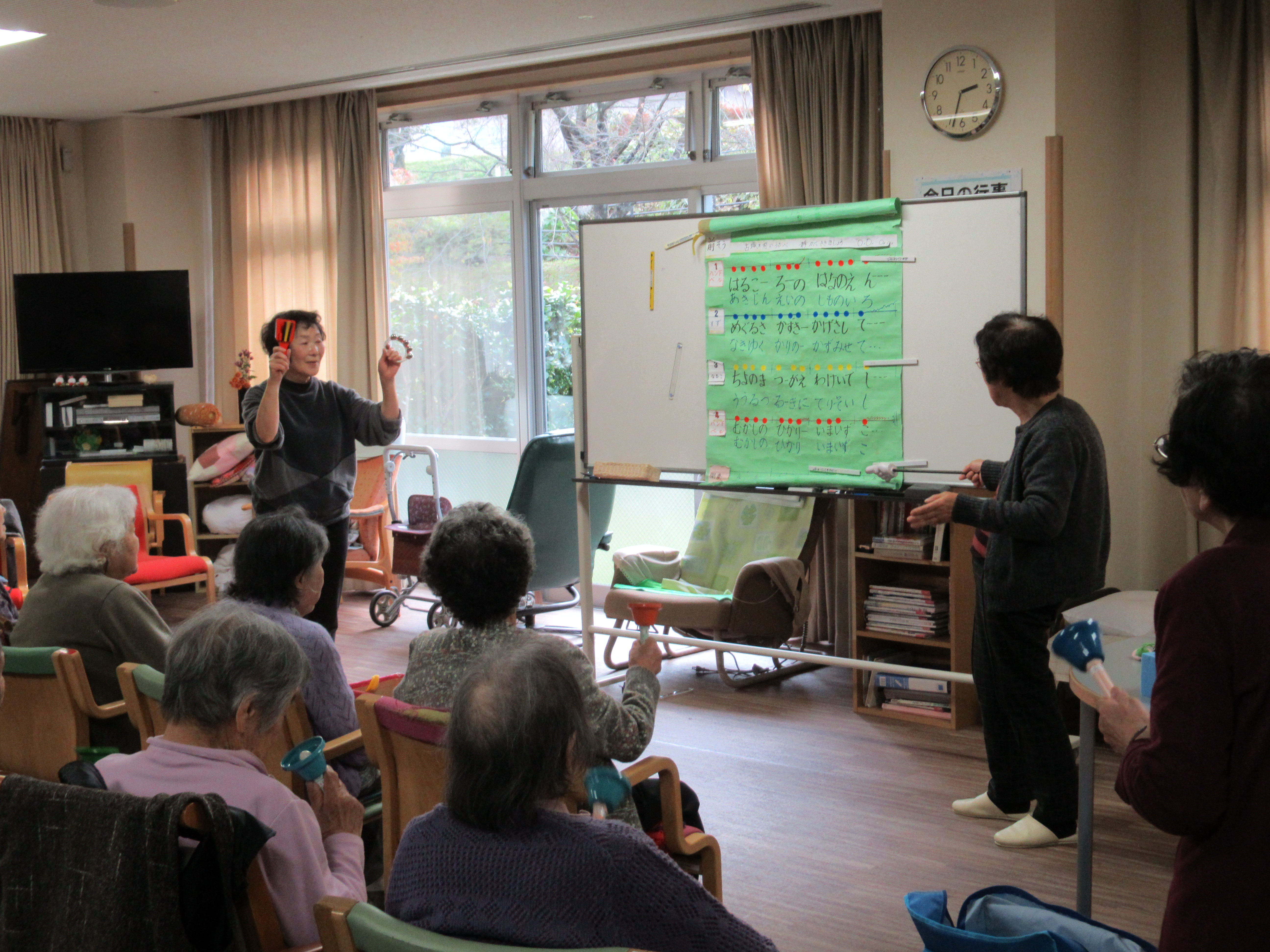 その後には季節の歌『もみじ』などを歌ったり、『365歩のマーチ』では体操、『荒城の月』では鳴子やハンドベルを使っての合奏などをしました。