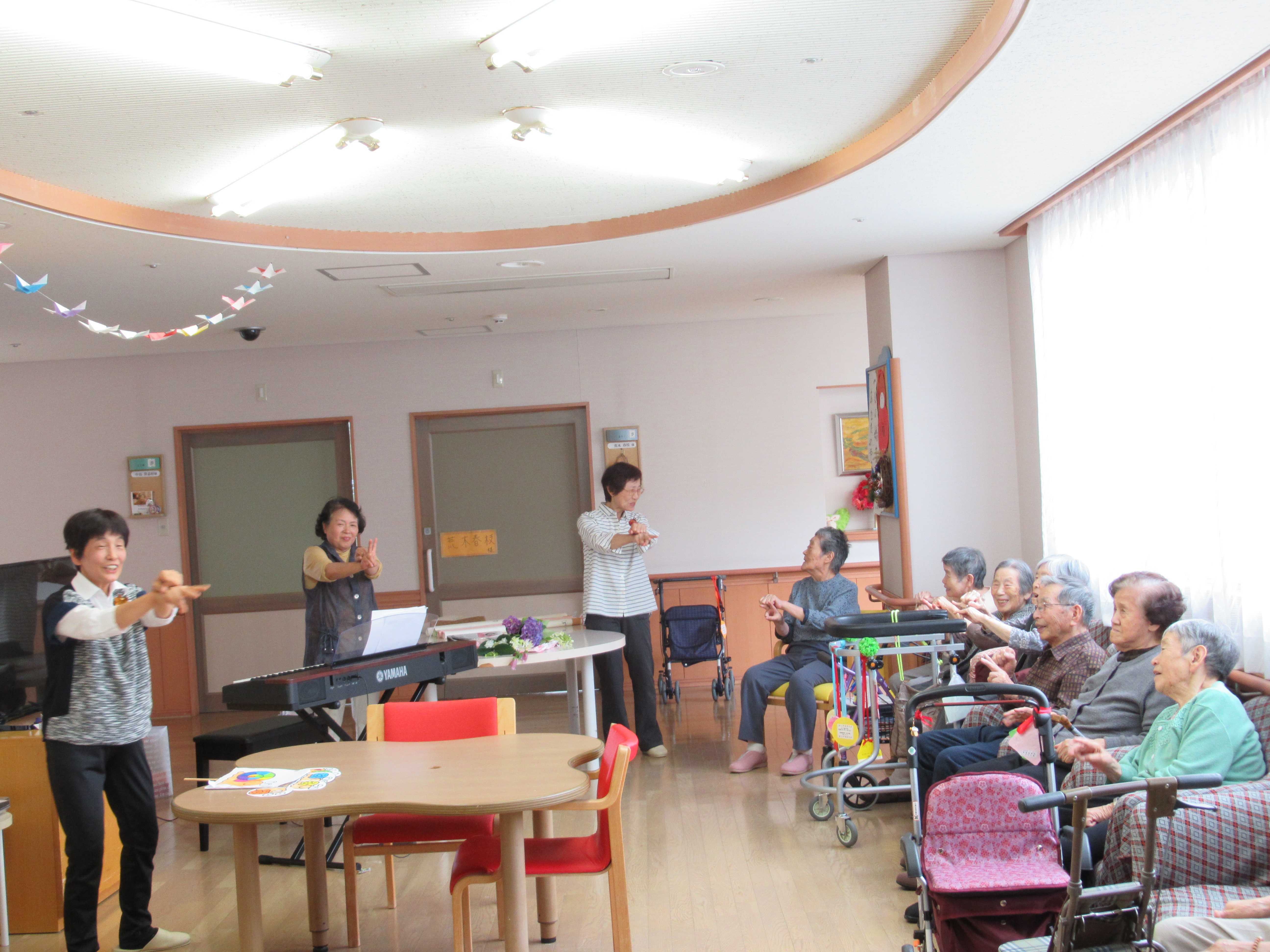 『夏は来ぬ』などの季節の唱歌を歌ったり、『かたつむり』の歌に合わせて手の運動もしました。