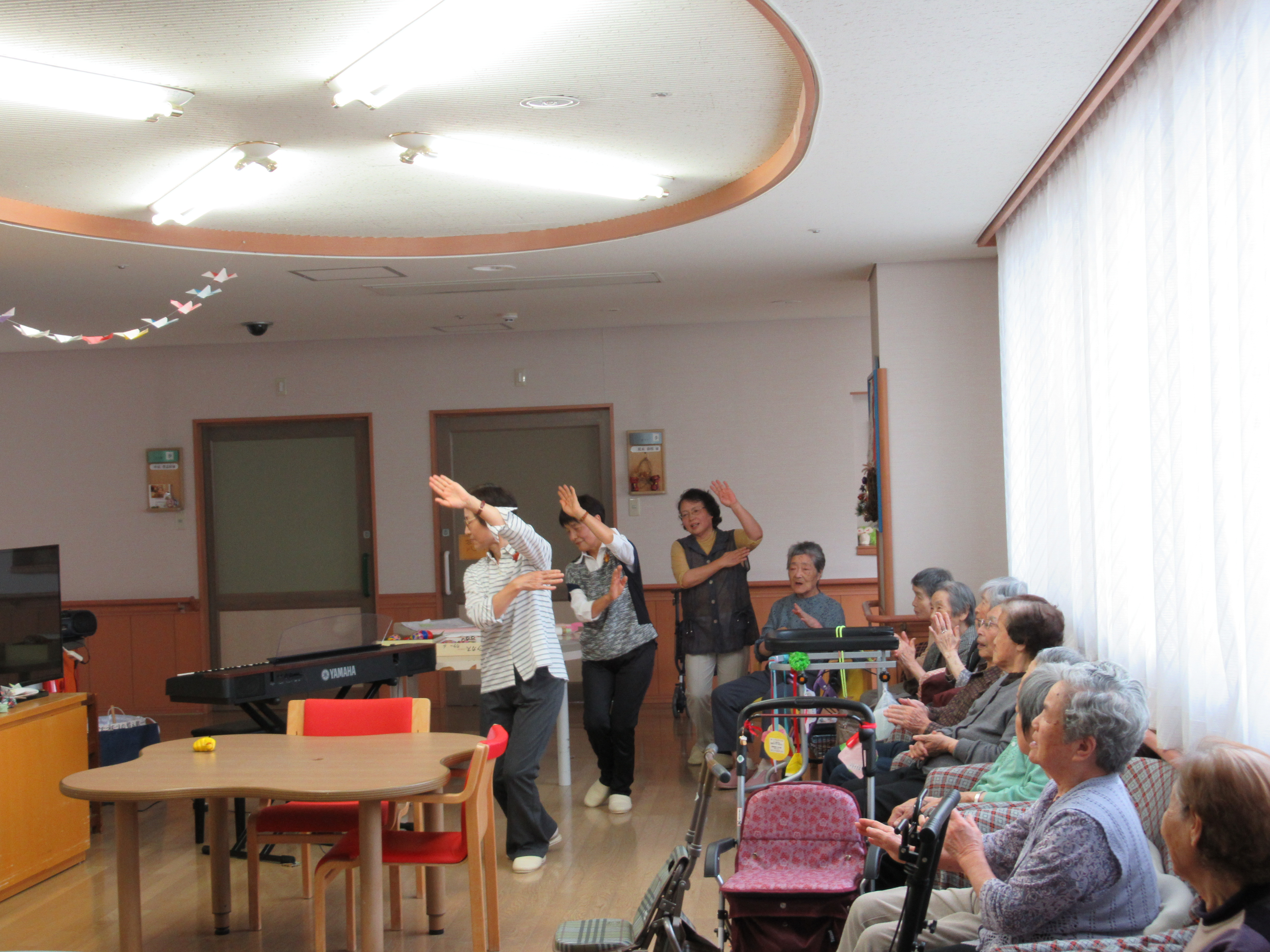 『庄川小唄』では音楽に合わせて踊りを披露してくださり、見ていた利用者の方も口ずさんだり踊りをまねたりと一緒に楽しまれていました。